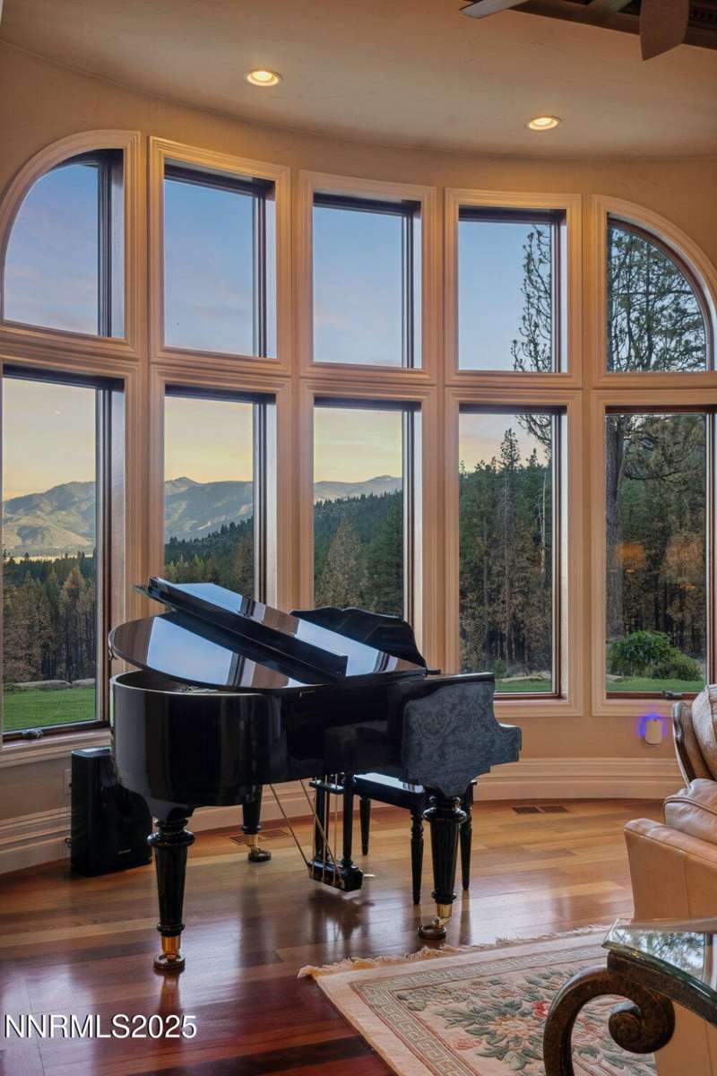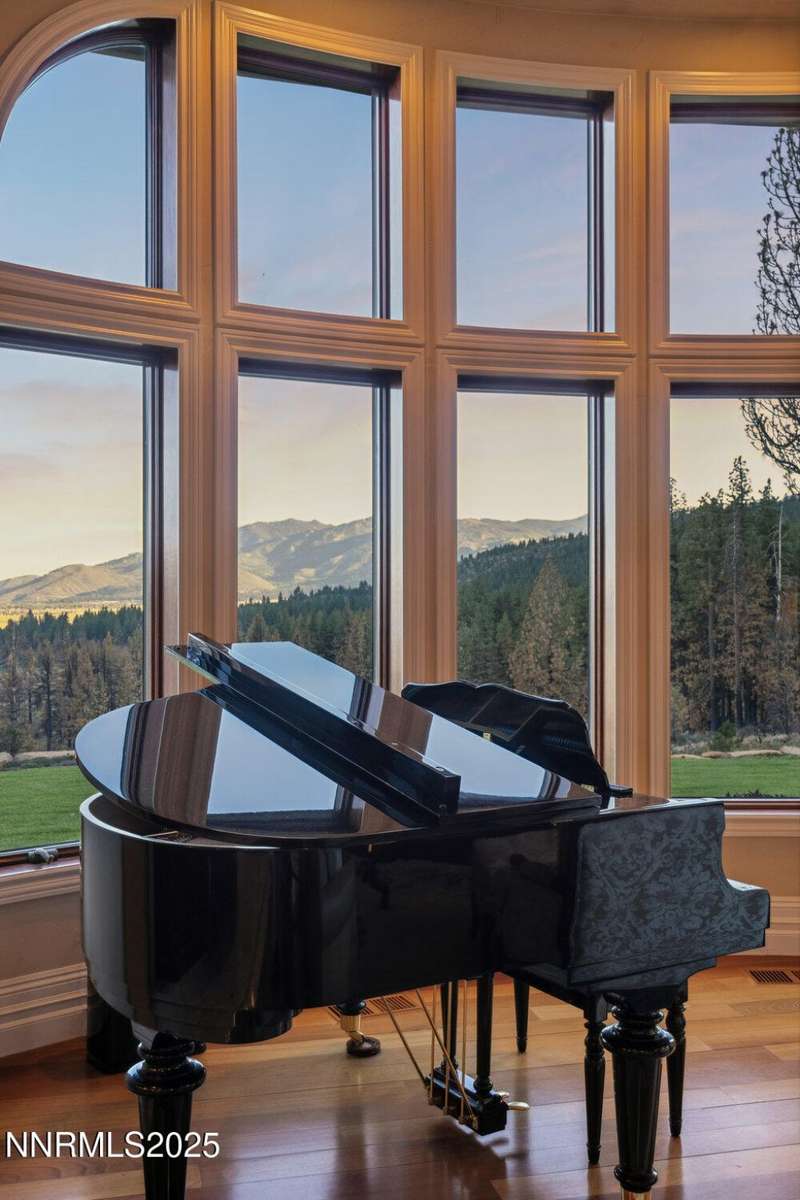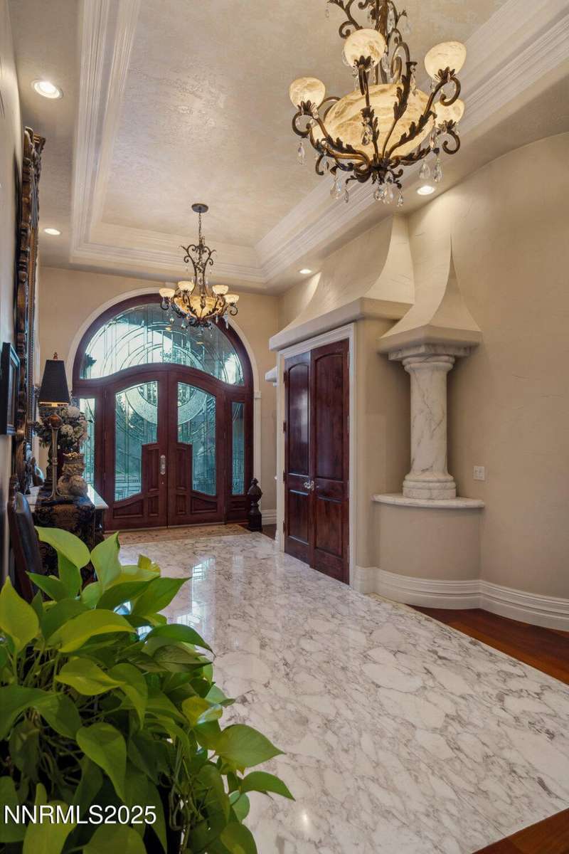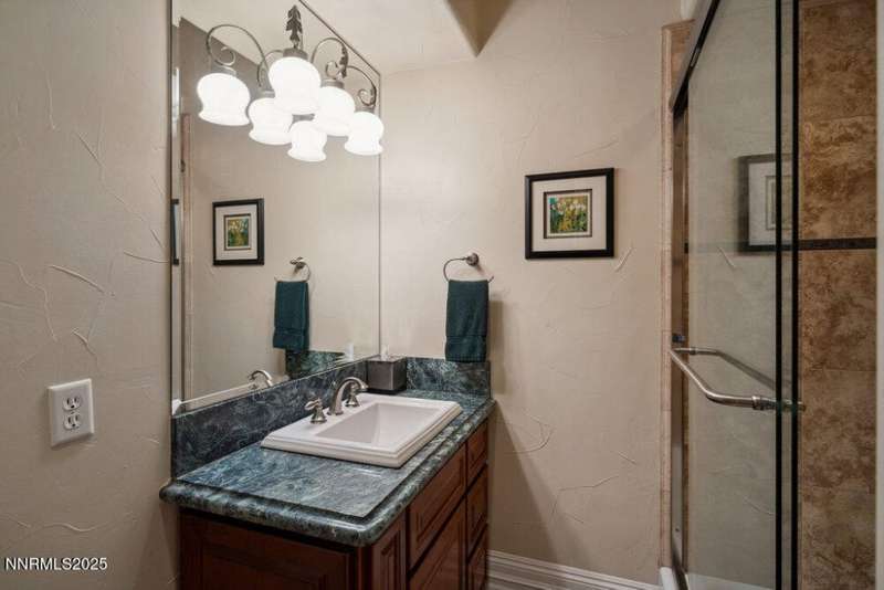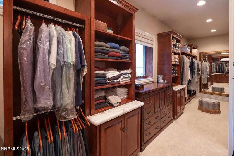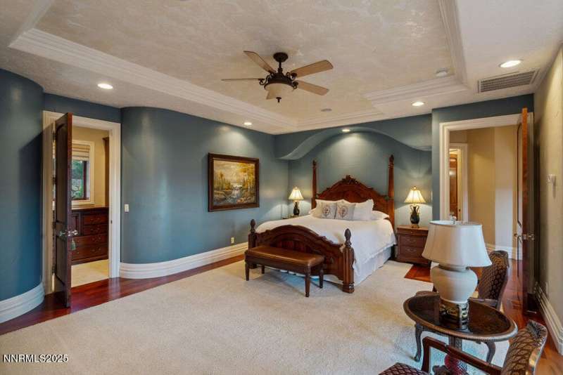 Welcome home to this elegant valley estate set on a beautiful 5+ acre parcel bordering Davis Creek Park with panoramic mountain, valley and lake views! The thoughtfully designed floor plan features a great room concept with a mix of formal and casual dining space, perfect for entertaining. The comfortable living room borders the kitchen and includes cathedral ceilings with exposed beams, elegant flooring and a wood-burning fireplace to add ambience and warmth on cool nights. The primary suite offers a tranquil retreat at the end of the day, inviting you to soak in the jetted garden tub near the dual-sided fireplace, or freshen up in the custom steam shower. The oversized walk-in closet includes built-in wardrobe cabinetry and shelving for ample organization. The garage is approximately 2,000 sq.ft. with a 42' RV bay and plenty of room for vehicles, recreational equipment or a workshop, plus an additional storage shed (designed to match the house) provides space for tools and garden equipment. The manicured outdoor living space with extended paver patio has been lovingly cultivated, and creates an private oasis for enjoying the views and natural environment of that surrounding the home. Accent lighting and outdoor kitchen creates an elegant evening setting for dining and entertaining.