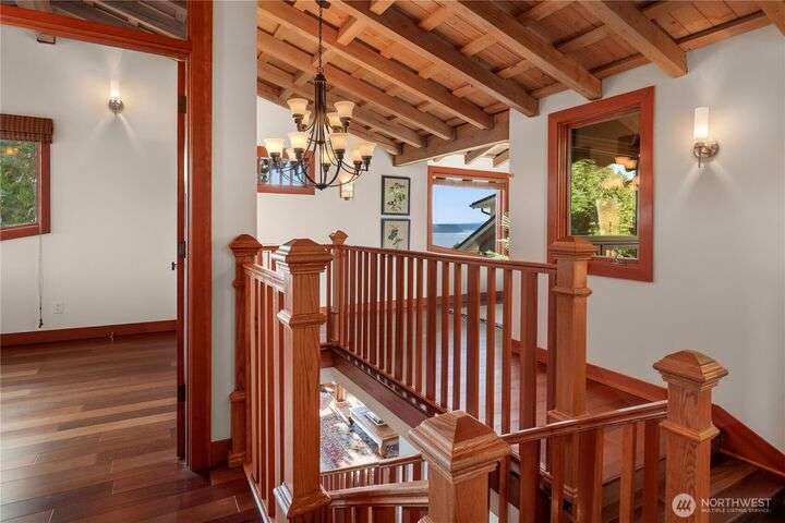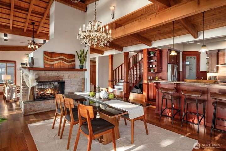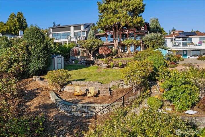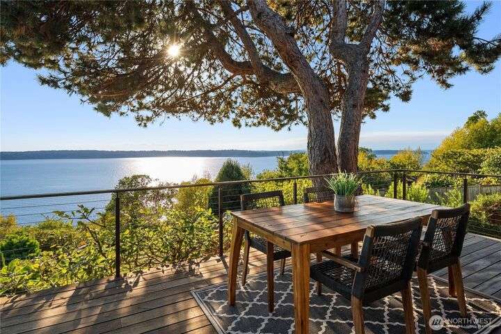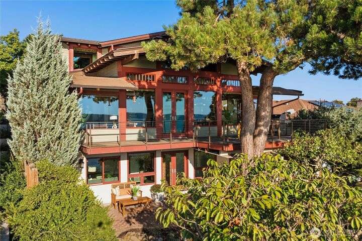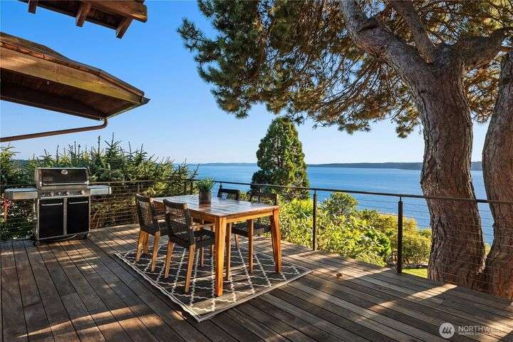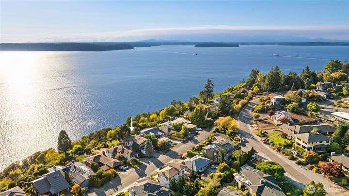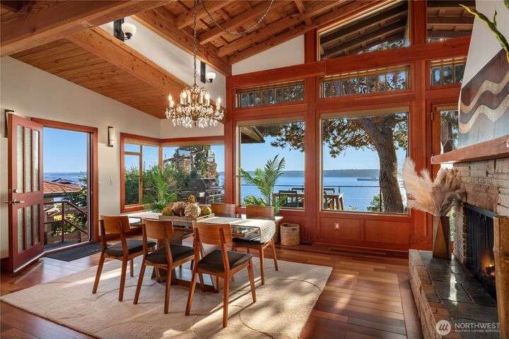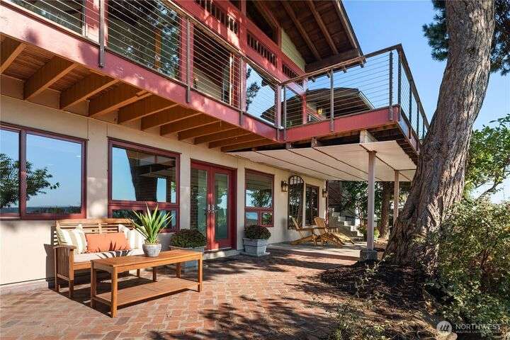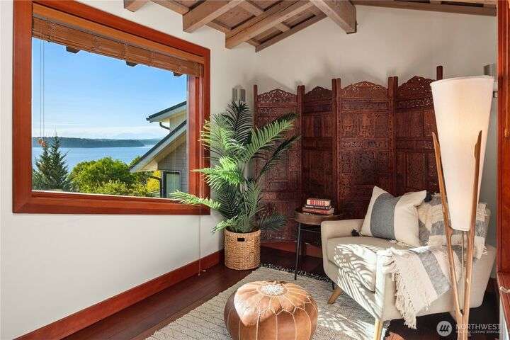 Prime bluff setting in the coveted Arroyos, this extraordinary 5 bed + den, 4 bath home marries timeless Pacific Northwest charm with the elegance of a European villa. Soaring ceilings with exposed wood beams, cherry hardwoods and walls of glass frame sweeping views of Puget Sound, the Olympics and the silhouette of Mt. Rainier from the primary suite. Designed for versatility and connection, with a full mother-in-law, perfect for extended living or guests. Expansive indoor-outdoor flow brings entertaining to life where hosting parties on the large deck is a breeze. Tend to plants in the greenhouse, enjoy the private Arroyo beach access or just take in the natural surroundings and refined architectural details, a truly incredible residence!