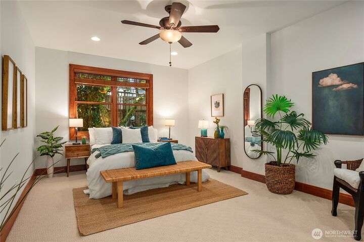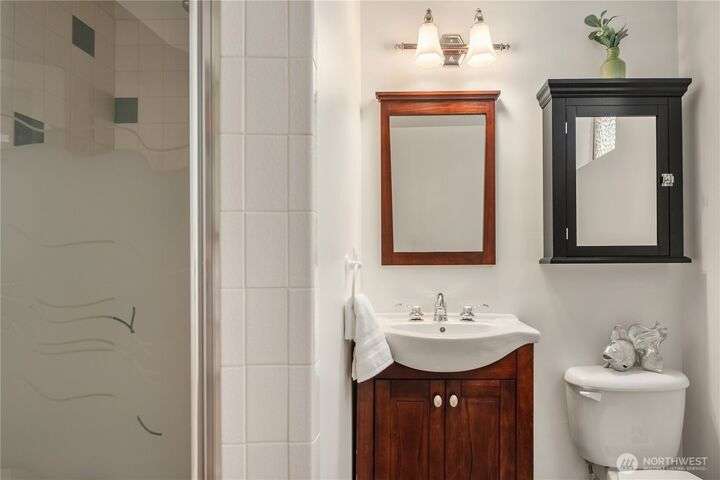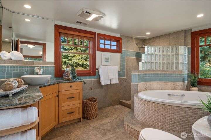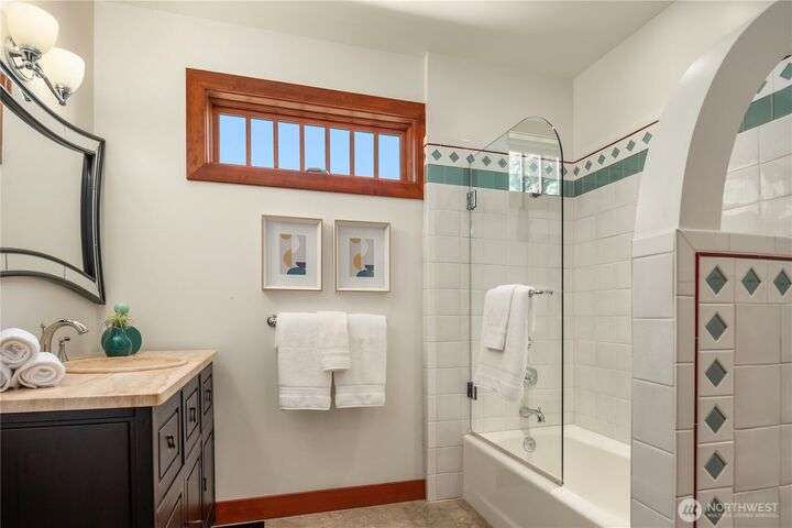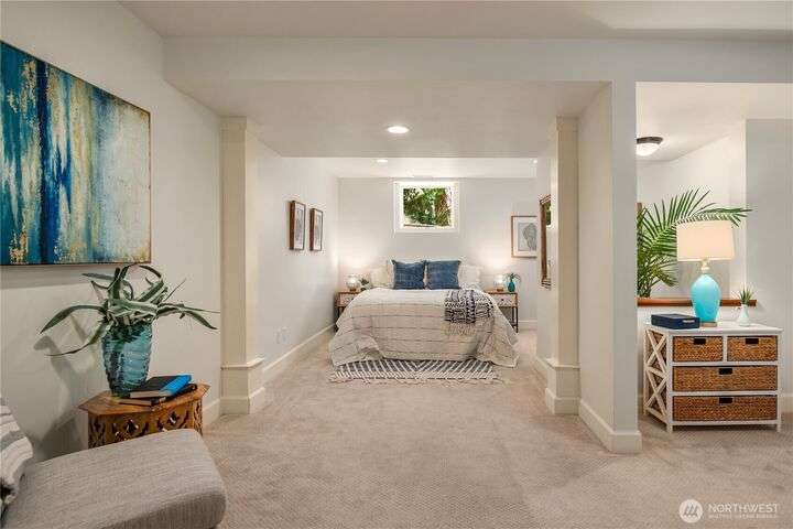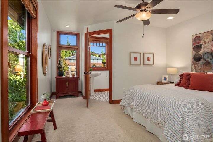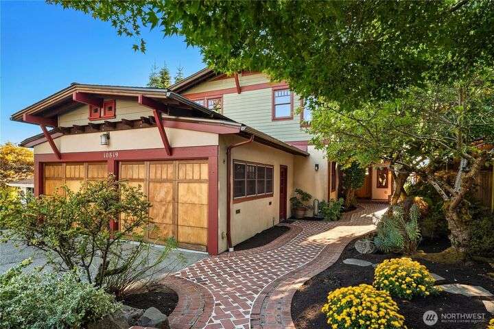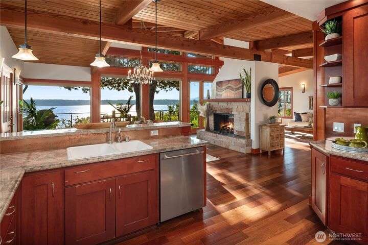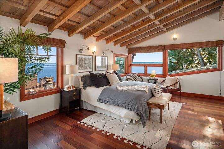 Prime bluff setting in the coveted Arroyos, this extraordinary 5 bed + den, 4 bath home marries timeless Pacific Northwest charm with the elegance of a European villa. Soaring ceilings with exposed wood beams, cherry hardwoods and walls of glass frame sweeping views of Puget Sound, the Olympics and the silhouette of Mt. Rainier from the primary suite. Designed for versatility and connection, with a full mother-in-law, perfect for extended living or guests. Expansive indoor-outdoor flow brings entertaining to life where hosting parties on the large deck is a breeze. Tend to plants in the greenhouse, enjoy the private Arroyo beach access or just take in the natural surroundings and refined architectural details, a truly incredible residence!