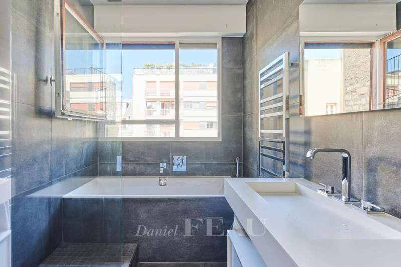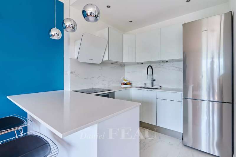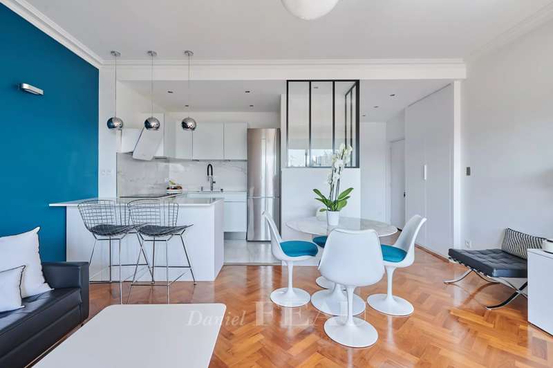 Boulevard Suchet. This recently renovated 55 sqm apartment is on the seventh floor of a luxurious mid 20th century building with a caretaker and a lift. It includes a living room with a fitted and equipped open-plan kitchen opening onto a 7.50 sqm balcony, a bedroom overlooking a peaceful courtyard, and a bath/shower room. The apartment boasts views of Villa Montmorency, the Eiffel Tower and the west of the capital. With ample fitted storage space and a cellar. Collective heating and hot water.