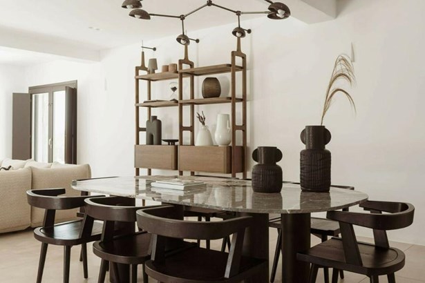 The large and bright living room, with whitewashed floorboards, features elegant modern furniture, upholstered with cream and white fabrics. The many windows overlooking the pool and the sea confer to this open space a bright and pleasant atmosphere, while the combined open-style kitchen and formal dining area complete the picture.