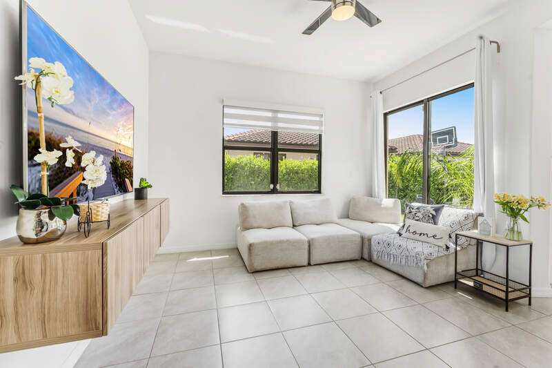 Step into this spectacular oversized corner lot home located in Coquina at Maple Ridge. This beautifully upgraded Balboa Model offers two stories of comfortable, modern living with 3 bedrooms, 2.5 bathrooms, and a 1-car garage. Inside, you'll find soaring 10-foot ceilings on the first floor and 9.4-foot ceilings on the second floor, creating an open and spacious atmosphere. The home features elegant 12x12 Dal-Tile flooring in the main living areas, 8-foot interior doors, a Mediterranean-style roof, a keyless garage entry, and an open-concept great room filled with natural light. The kitchen is designed with style and functionality in mind, offering sleek 42-inch upgraded cabinetry, quartz countertops throughout, stainless steel appliances, recessed lighting, and contemporary light fixtures. The expansive owner's suite includes dual sinks, a seamless glass shower, a walk-in closet, and an additional closet for added convenience. Enjoy stunning side lake views from your private corner lot, offering a sense of space and serenity. Located in Flood Zone X, this home requires no flood insurance, providing peace of mind. Living in Maple Ridge at Ave Maria gives you access to a wealth of amenities, including a vibrant clubhouse, entertainment spaces, walking and jogging trails, tennis, pickleball and bocce courts, a dog park, water park, soccer field, multiple playgrounds, a fitness center, and more. Don't miss the opportunity to make this upgraded and move-in-ready home yours-schedule your private showing today.