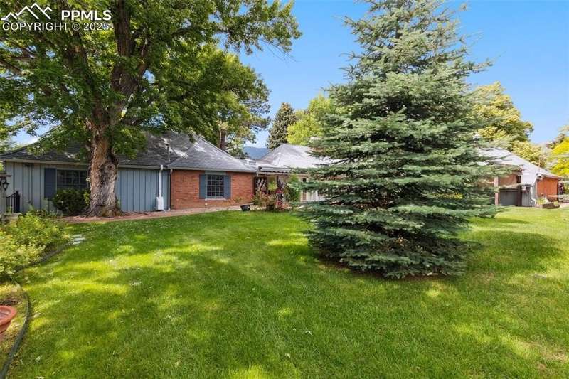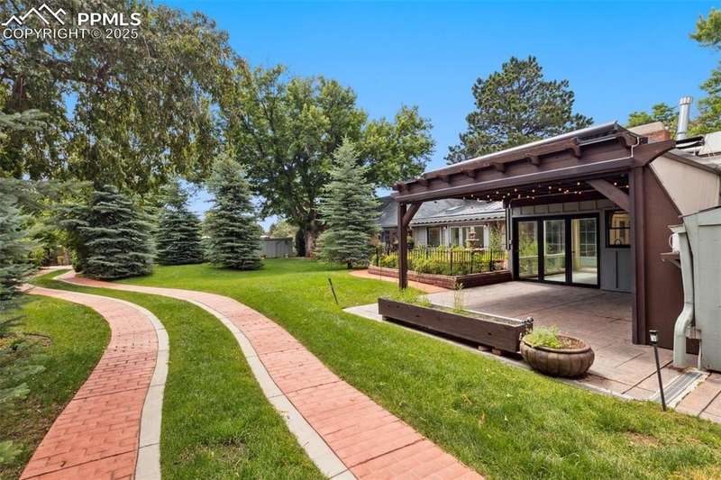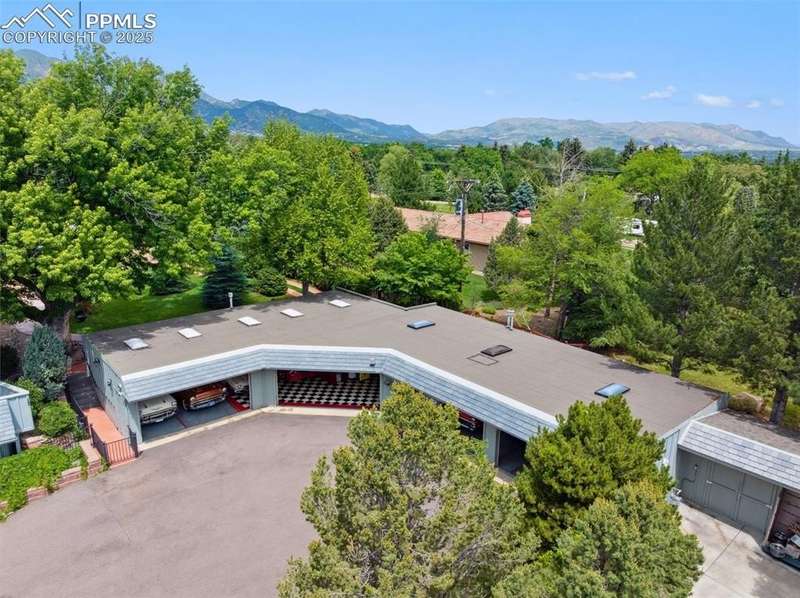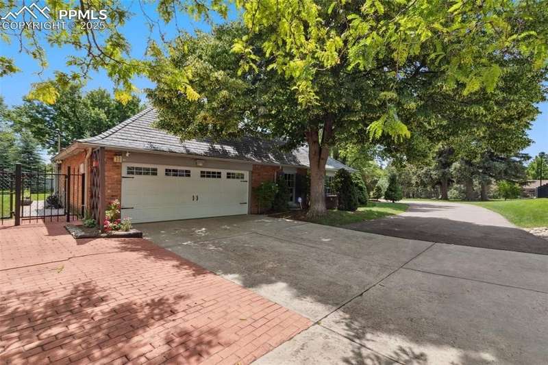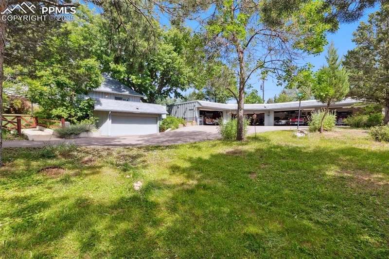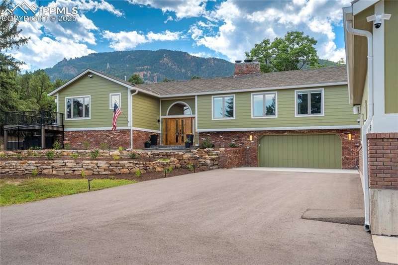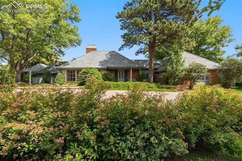Welcome to this Broadmoor estate, nestled on 1.25 beautifully landscaped acres in one of Colorado Springs’ most prestigious neighborhoods. Boasting an impressive pedigree with only two owners, as the home was built in 1958! Tucked within a quiet neighborhood, the home is accessed via a gated circular driveway, providing both seclusion and standout curb appeal. Car enthusiasts will appreciate the incredible 16-car garage capacity, a true rarity. Designed for effortless entertaining, the home features a stunning panoramic folding door system that seamlessly connects the family room to one of several patios, blurring the lines between indoor and outdoor living. The entertaining kitchenette in the family room makes hosting guests easy, while the patios open to lush, mature landscaping that feels like your own private park. At the heart of the home lies a spacious, light-filled kitchen, featuring granite countertops, a large island with breakfast bar, beamed ceilings, and multiple skylights. A cozy fireplace stove adds character and warmth to this space. The primary suite retreat has its own sitting room, private wet bar, and walk-out to a deck. The 5pc bath offers dual vanities, a walk-in tub, and a separate shower. Two additional bedrooms in this wing share a Jack-and-Jill bathroom. The living and dining rooms each showcase their own fireplace, providing spaces for gathering. An office/study off the kitchen includes extensive built-ins and another fireplace stove, creating a productive workspace. A separate wing features an additional bedroom, a three-quarter bath, and access to an upstairs playroom, perfect for children, hobbies, or additional guests. With six fireplaces, and exceptional outdoor living spaces, this one-of-a-kind estate is a Broadmoor legacy, offering a truly coveted location.