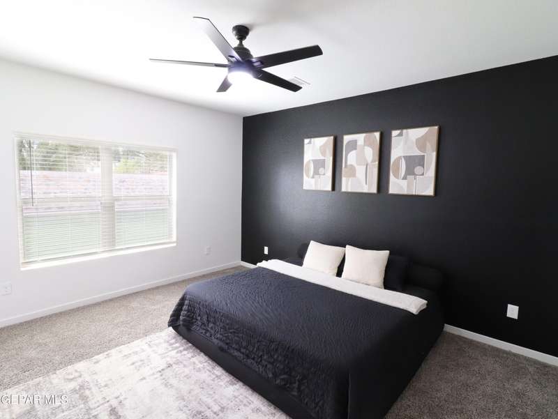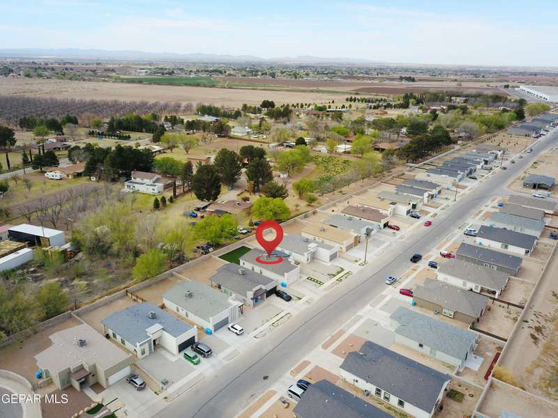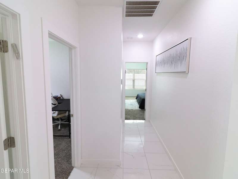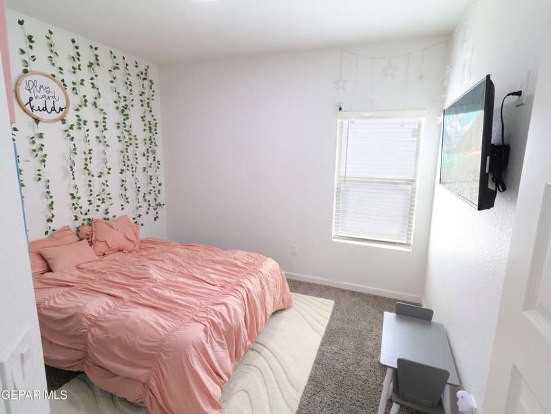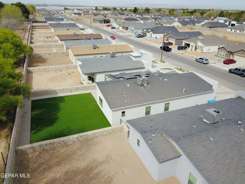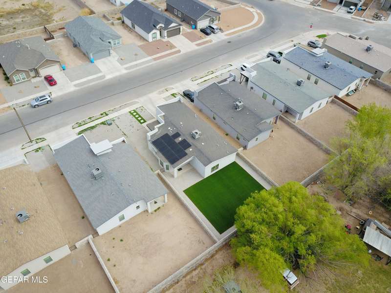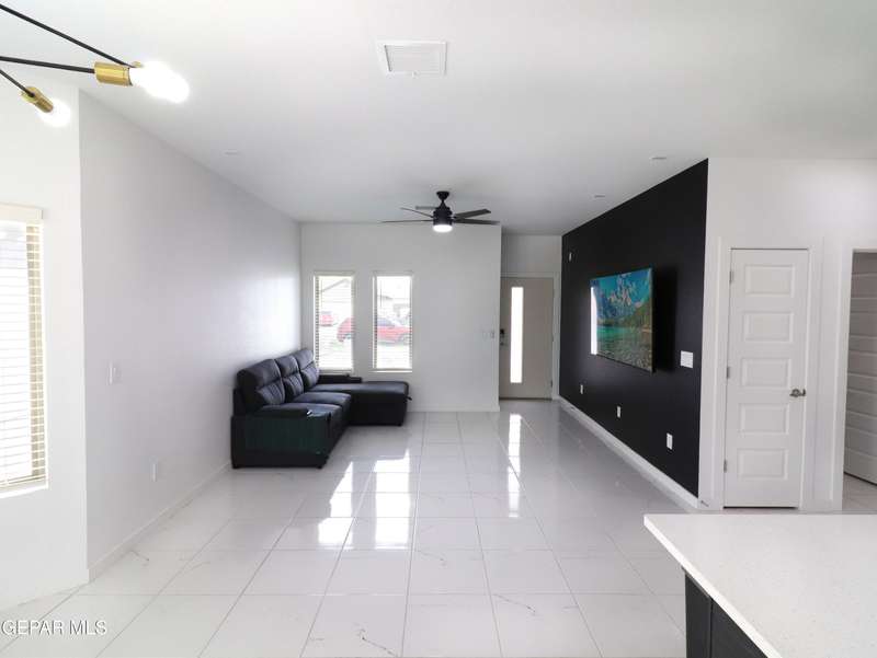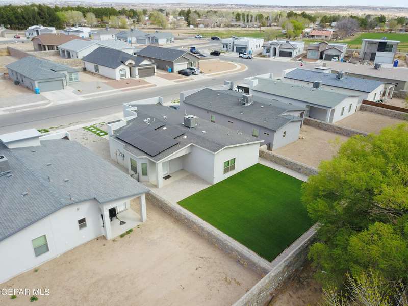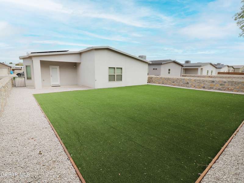 Discover this incredible modern home located in the desirable neighborhood in Socorro! Enter into this BEAUTIFUL open floor concept home by stepping into the breathtaking 18X18 sq ft ceramic tile throughout the main leaving area which leads into the carpeted bedrooms. The home features lots of natural light and environmentally-conscious improvements to include cup-washer in kitchen sink and undermount cabinet LED lighting in kitchen and bathrooms. The kitchen includes stainless steel appliances with beautiful modern cabinets, a captivating quartz island and backsplash! The living room, the office (bedroom) and primary suite showcase beautiful accent walls not to mention the spacious walk-in closet. Enjoy family gatherings in this fully landscaped, relaxing, low maintenance back yard. The security system brings peace of mind to the home owner. Solar Panels provides savings for your household on Electric Bill. Home is close to North Loop, I-10, and Loop 375. Schedule a viewing today