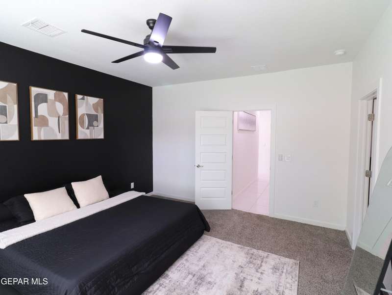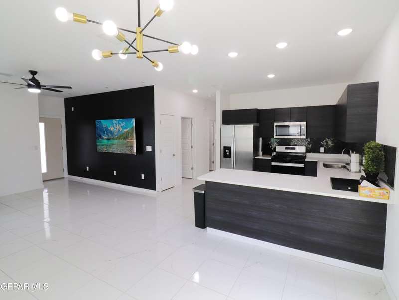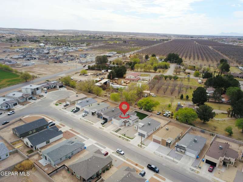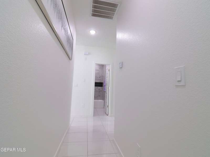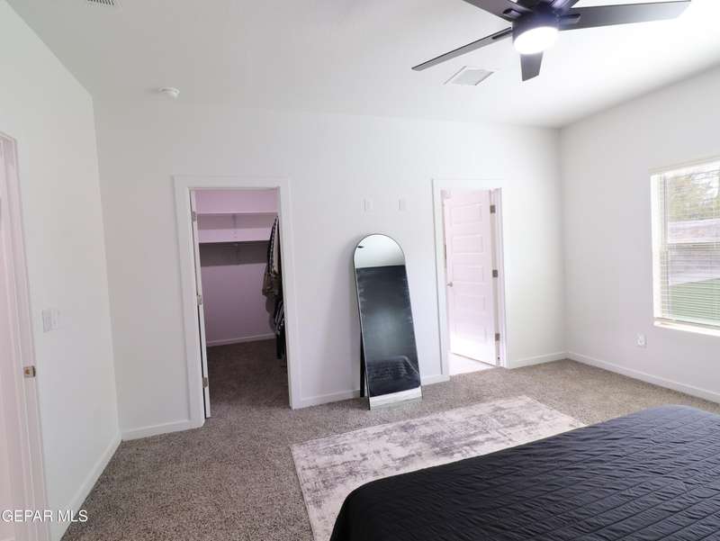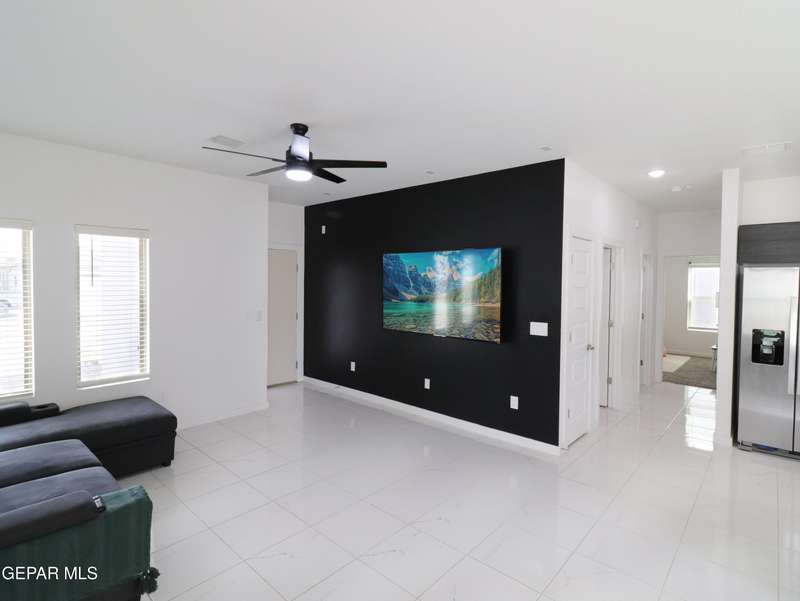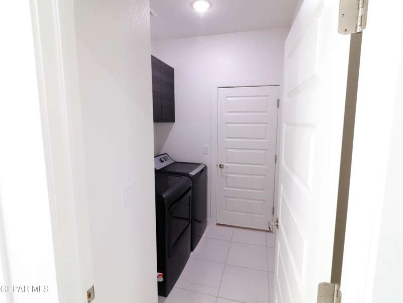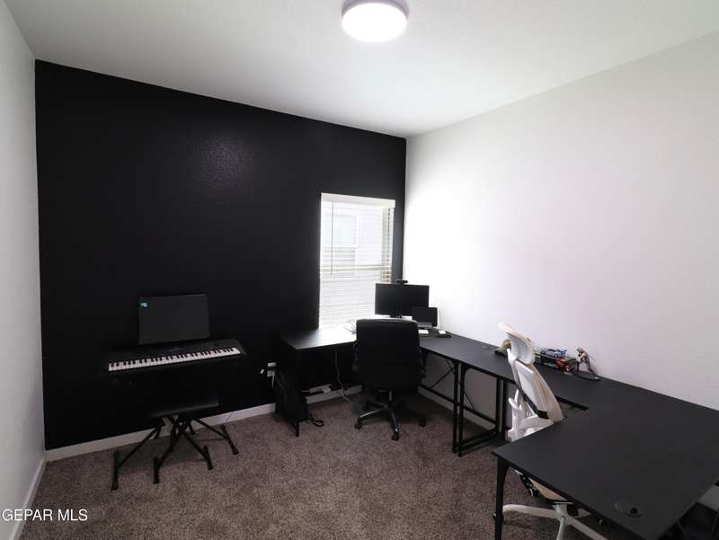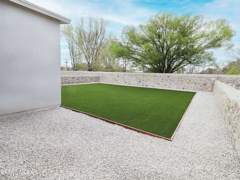 Discover this incredible modern home located in the desirable neighborhood in Socorro! Enter into this BEAUTIFUL open floor concept home by stepping into the breathtaking 18X18 sq ft ceramic tile throughout the main leaving area which leads into the carpeted bedrooms. The home features lots of natural light and environmentally-conscious improvements to include cup-washer in kitchen sink and undermount cabinet LED lighting in kitchen and bathrooms. The kitchen includes stainless steel appliances with beautiful modern cabinets, a captivating quartz island and backsplash! The living room, the office (bedroom) and primary suite showcase beautiful accent walls not to mention the spacious walk-in closet. Enjoy family gatherings in this fully landscaped, relaxing, low maintenance back yard. The security system brings peace of mind to the home owner. Solar Panels provides savings for your household on Electric Bill. Home is close to North Loop, I-10, and Loop 375. Schedule a viewing today