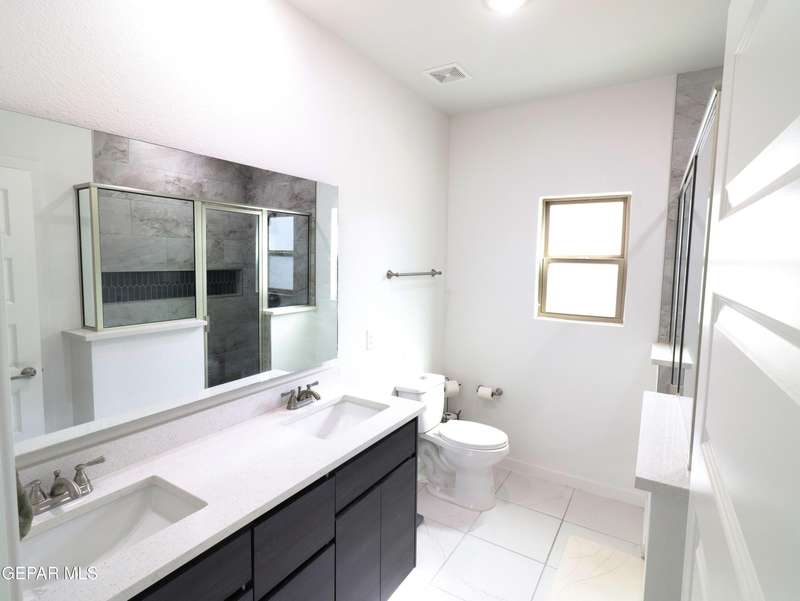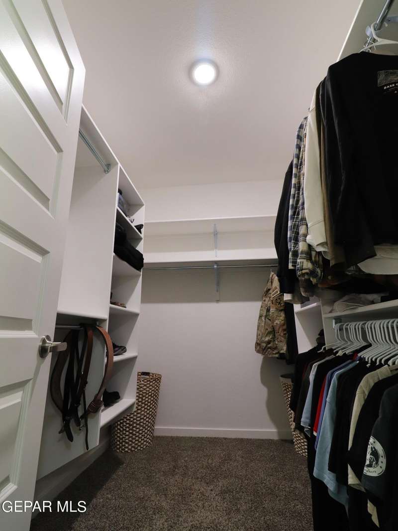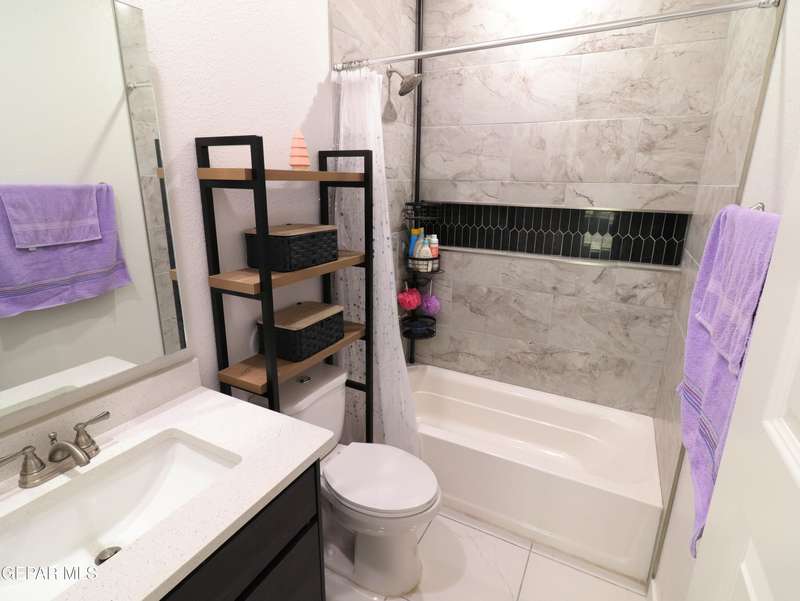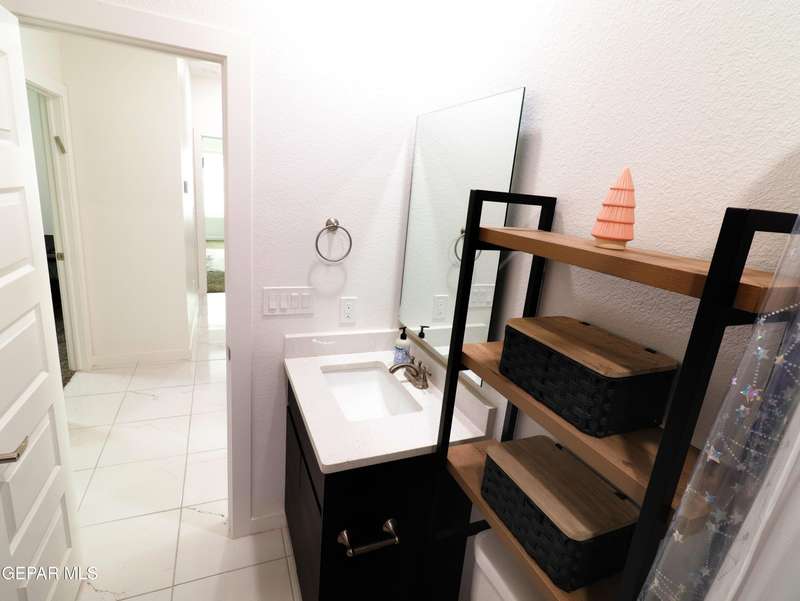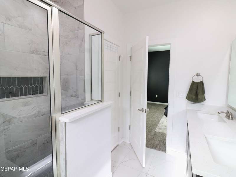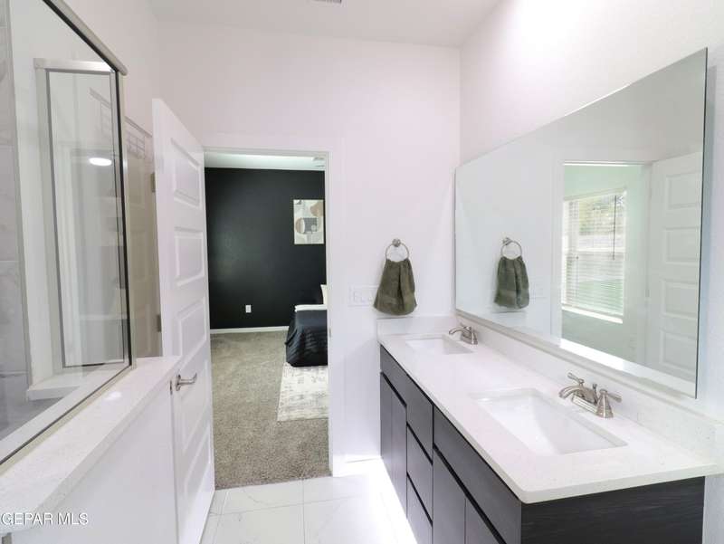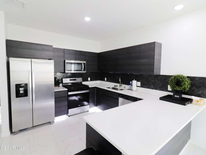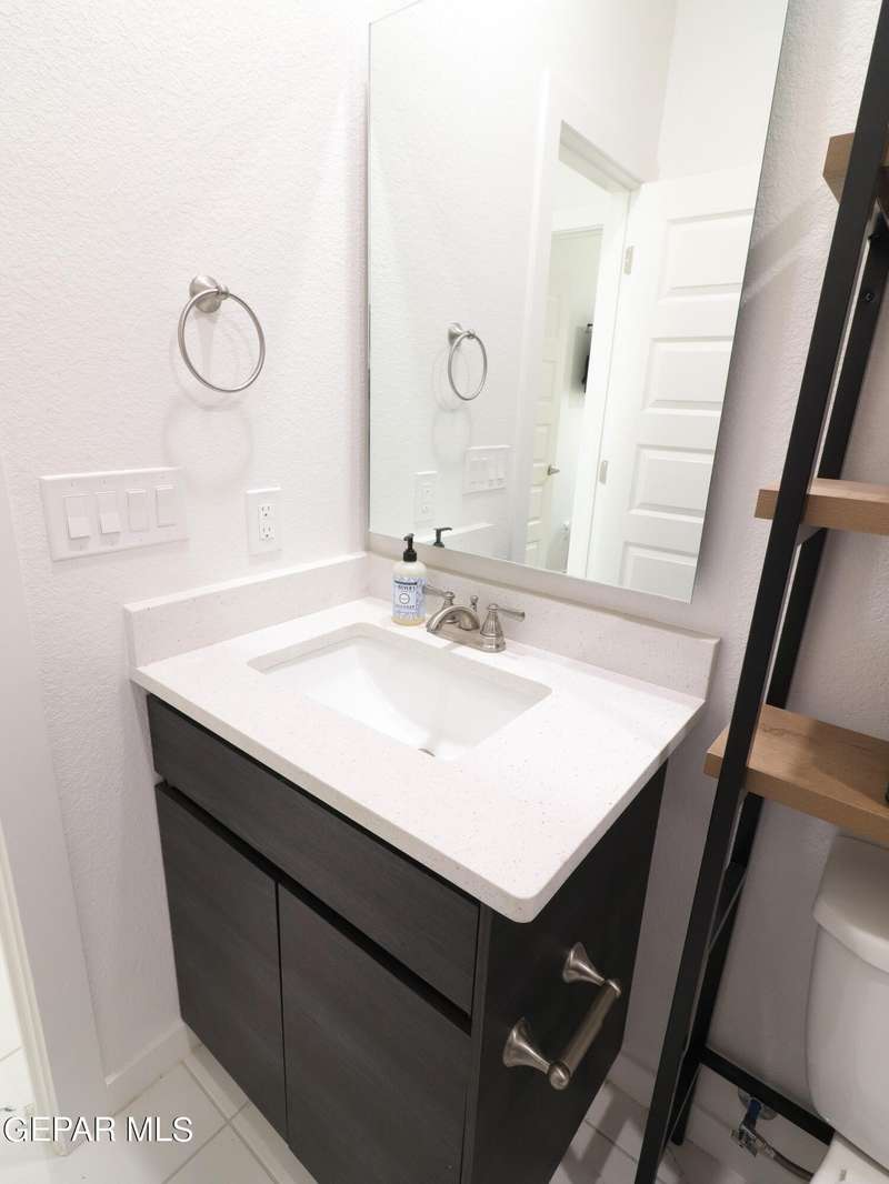 Discover this incredible modern home located in the desirable neighborhood in Socorro! Enter into this BEAUTIFUL open floor concept home by stepping into the breathtaking 18X18 sq ft ceramic tile throughout the main leaving area which leads into the carpeted bedrooms. The home features lots of natural light and environmentally-conscious improvements to include cup-washer in kitchen sink and undermount cabinet LED lighting in kitchen and bathrooms. The kitchen includes stainless steel appliances with beautiful modern cabinets, a captivating quartz island and backsplash! The living room, the office (bedroom) and primary suite showcase beautiful accent walls not to mention the spacious walk-in closet. Enjoy family gatherings in this fully landscaped, relaxing, low maintenance back yard. The security system brings peace of mind to the home owner. Solar Panels provides savings for your household on Electric Bill. Home is close to North Loop, I-10, and Loop 375. Schedule a viewing today