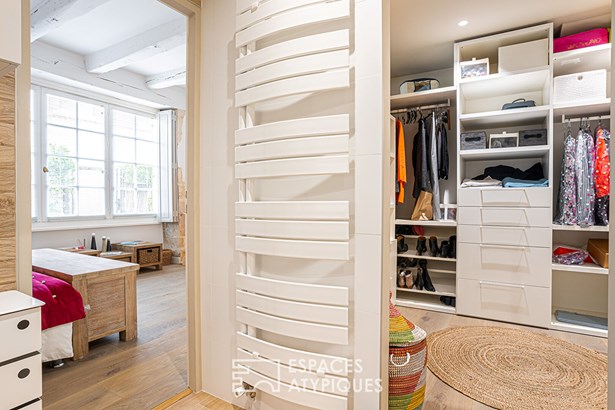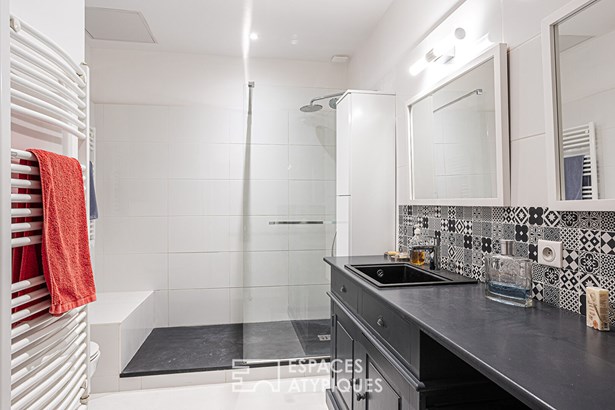 The vast living room, opening onto the terrace, features a period fireplace and a glimpse of the vaulted ceiling leading to the master suite. This first bedroom has been carefully renovated and benefits from a bathroom and a generously sized dressing room.