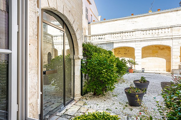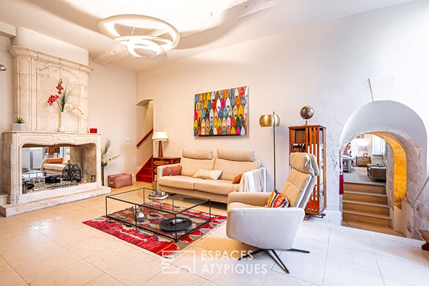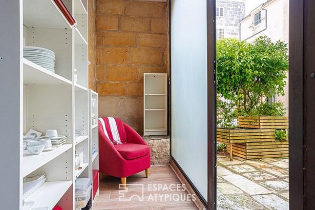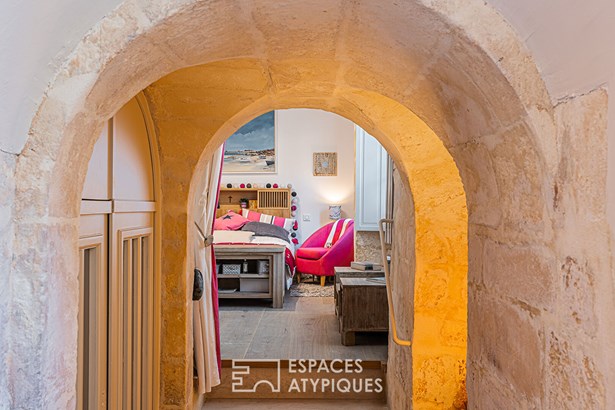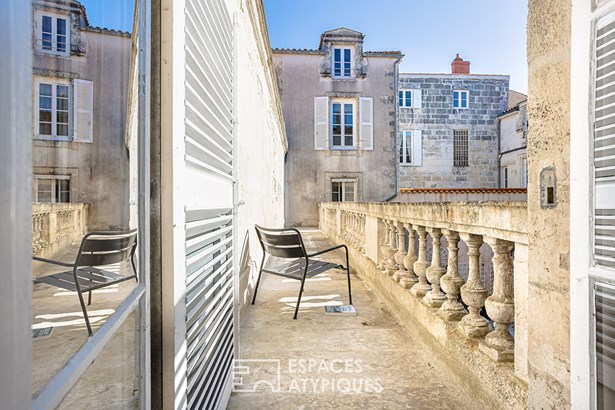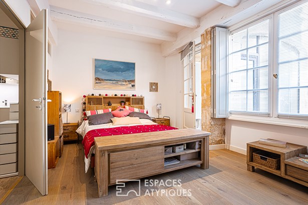 For lovers of stone and typical La Rochelle architecture, this duplex apartment is a gem, nestled on the city's most famous cobbled street. In a small, well-kept building, its private terrace, overlooked by a stone balustrade walkway, is a rare privilege in the area, between the Grosse Horloge and Place de Verdun. Past the history-filled hall, the apartment is entered through a dedicated entrance, which connects the bright dining room and the equipped kitchen.