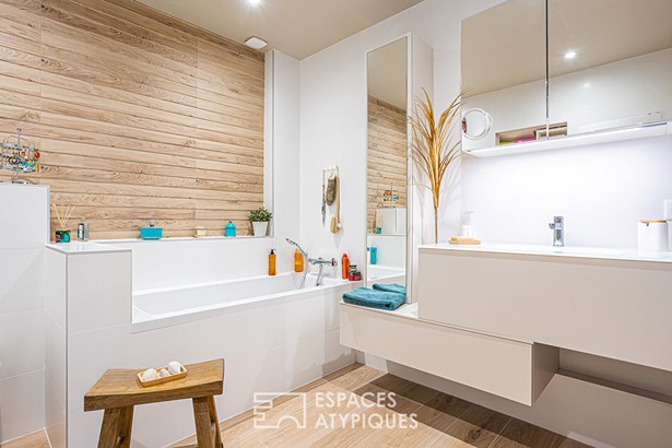 Upstairs are the laundry room, a large shower room with toilet, and the second bedroom, which provides access to the corridor, for a quiet reading moment, bathed in light.