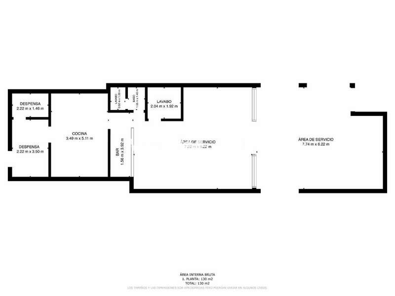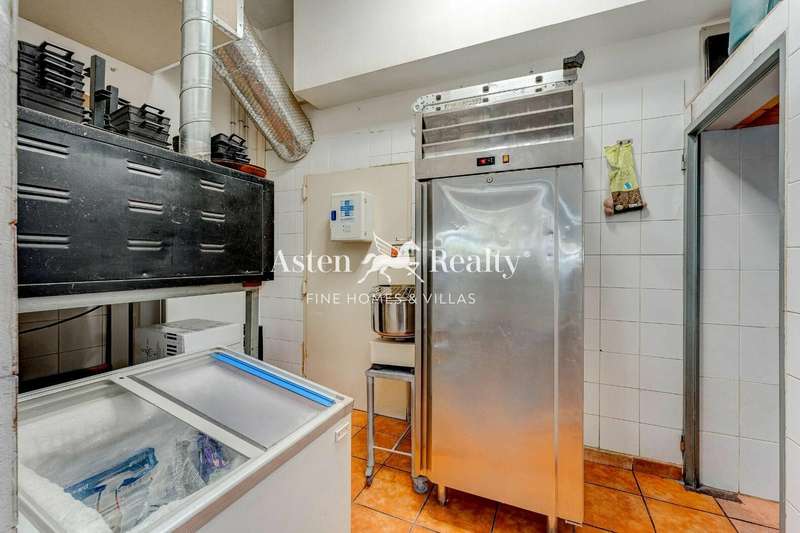 The interior of the restaurant has 75 m2, in the customer area there is a large bar fully equipped with cash register, a large room that has 6 chairs at 2 tables, 6 chairs at 3 high tables, which can be increased if desired; two bathrooms, one of them adapted for people with reduced mobility; the kitchen is large with a large fridge, two work tables, cooker, griddle and fryer; and in the back there is a storage room and a toilet for staff.