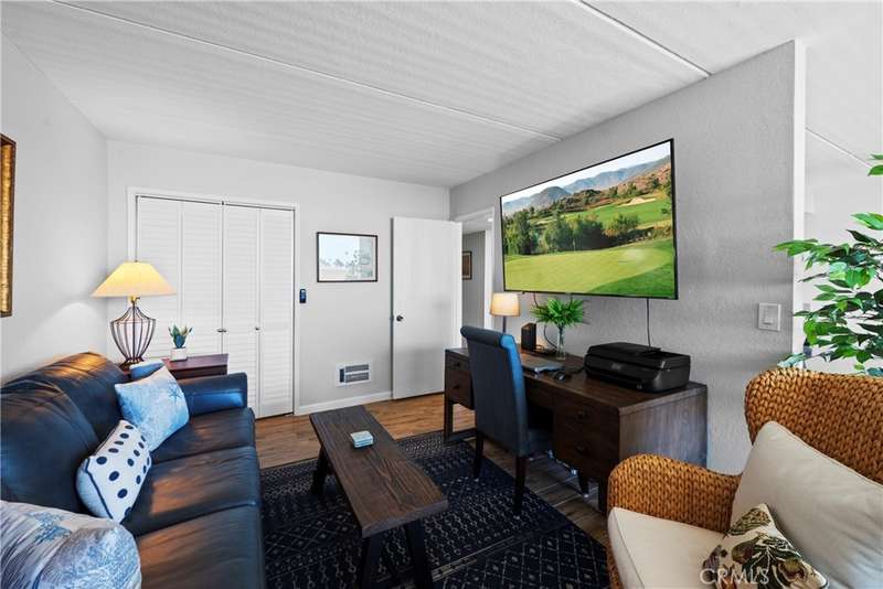 The primary suite includes a private en-suite bath, while the second bedroom is served by a hall bath nearby. Originally a three-bedroom floor plan, the third room has been opened to create a flexible office off the living area--its closet remains intact for extra storage or workspace. Convenience continues with an in-unit washer/dryer tucked into one of the hall closets.