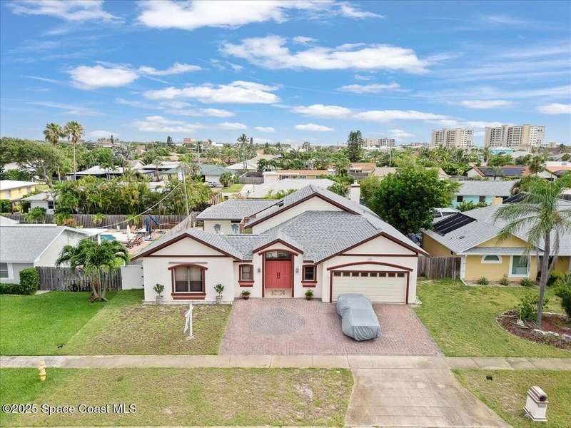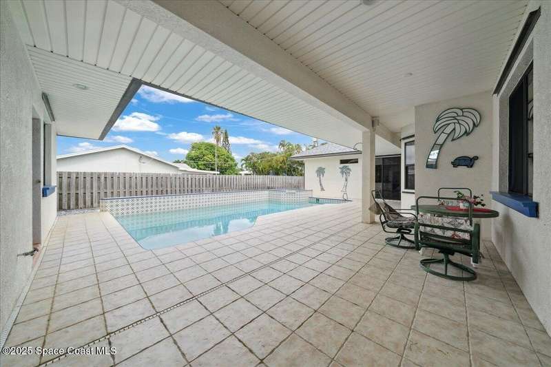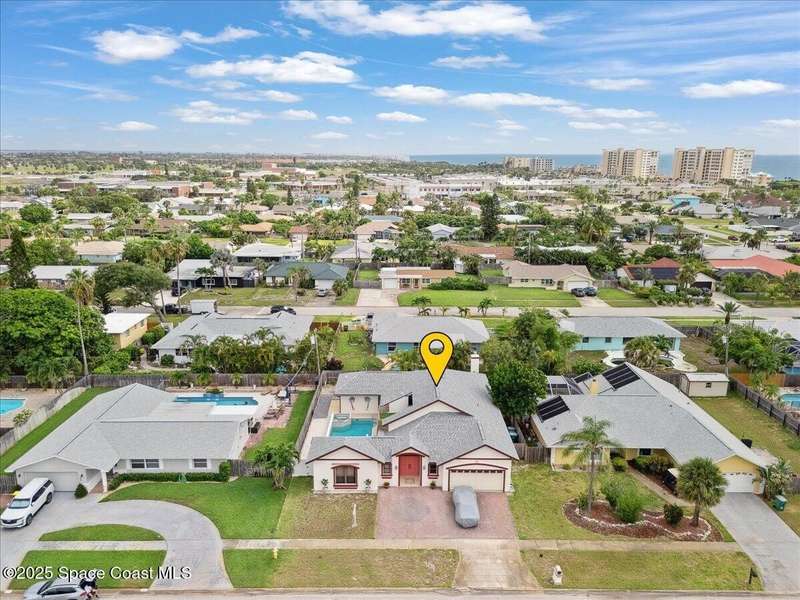 MOTIVATED SELLER! Just 1.5 blocks from the beach, this beautifully maintained 3-bed, 3-bath home offers the perfect blend of comfort & coastal charm. A 2nd-story loft with its own balcony-can easily be enclosed to create a 4th bedroom, ideal for growing families. The detached 1-bed/1-bath efficiency bungalow adds flexibility for multi-gen living or a private home office. Step into the serene courtyard featuring a large pool & spa, perfect for relaxing or entertaining. Inside, you'll find vaulted ceilings, open floor plan, & a primary suite with patio access, a walk-in closet, jetted tub, & separate shower. Built in 2000 w/concrete block construction, this home boasts recent upgrades: 2023 roof, 2024 A/C, & new water heater. Miami-Dade hurricane shutters offer added peace of mind. Located just blocks from top-rated schools, shopping, & dining, this one-owner home is a rare find in Satellite Beach. Whether you're seeking a family home or a second home by the sea, this could be the one!