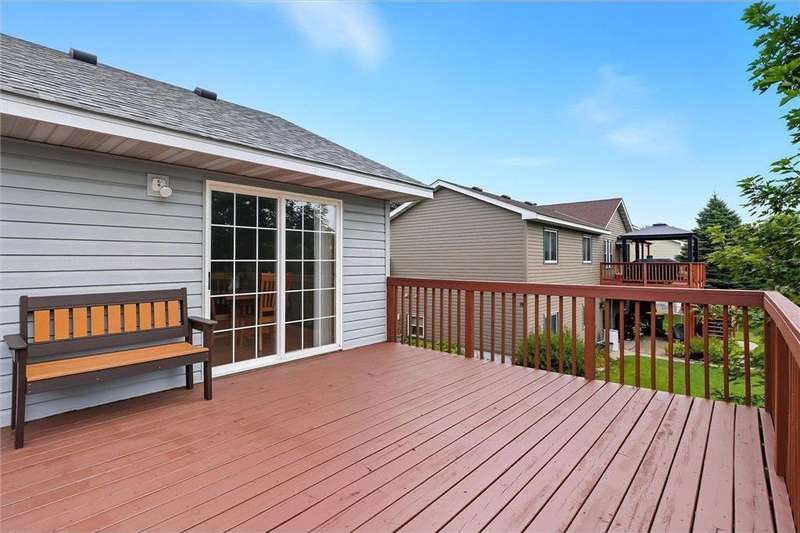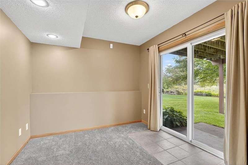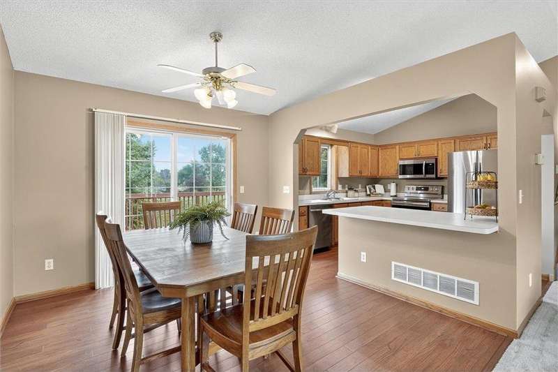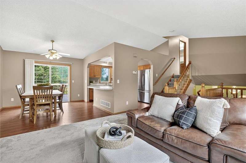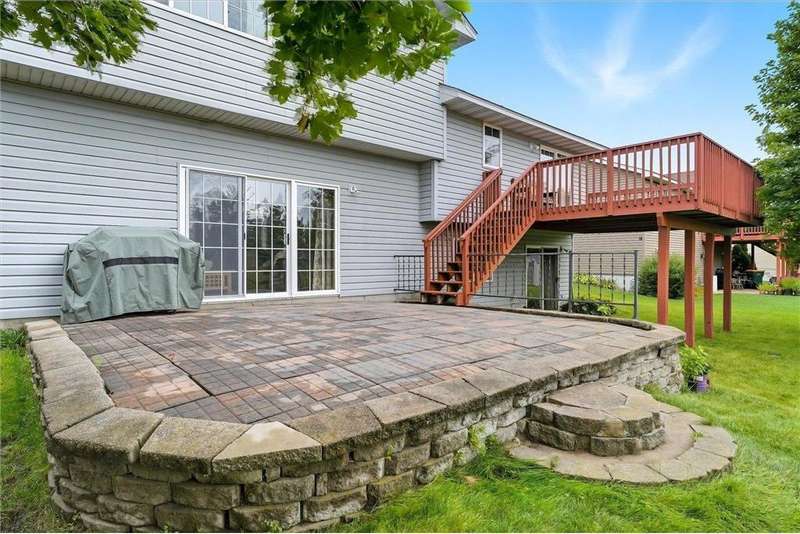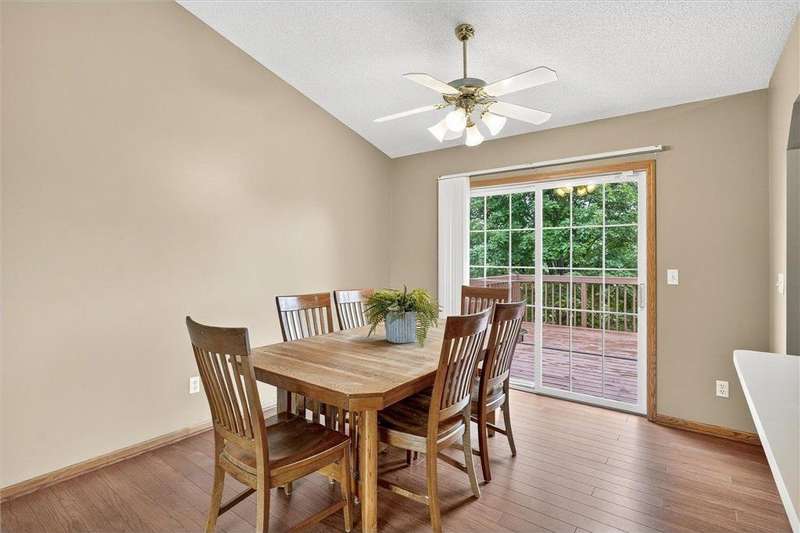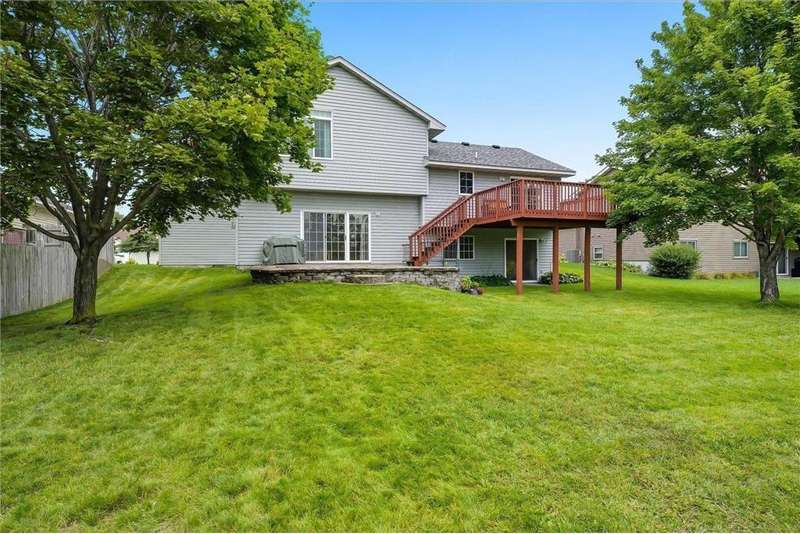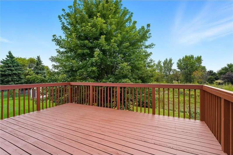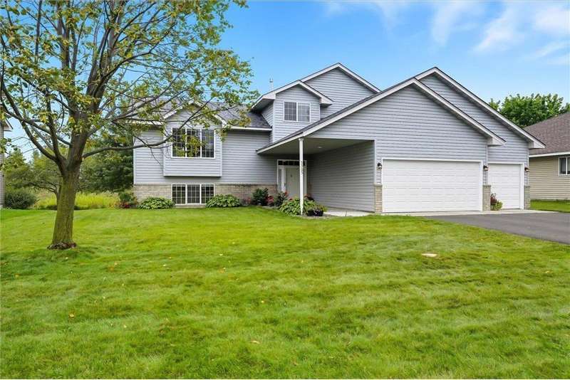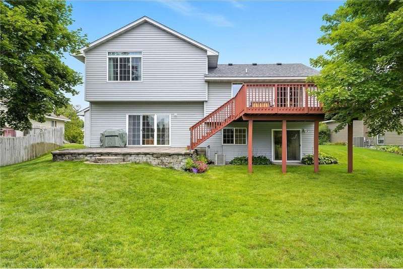 Spacious walkout four level with a rare private backyard with no homes behind. Enjoy BBQs w/family/friends on your own private deck and patio with South exposure for lots of sunlight. Large level backyard w/plenty of space for kids and pets to roam. Updated Samsung stainless steel appliances, carpet, flooring, light fixtures and paint in most rooms. Upper level features 3 Bdrms on upper level with 3/4 Prim Bathroom and Full Bathroom. Spacious vaulted upper level Kitchen, Living Room and Dining Room with slider to deck. Main level walkout Family Room w/gas fireplace, Laundry Room and convenient half Bathroom. Lower level 4th Bedroom, storage room and large Flex Room w/French doors walking out to private backyard. Finished 3 car garage w/plenty of storage. Nicely landscaped and new vinyl siding and roof in 2017. Quiet neighborhood with-in walking distance of Zane Sports Park/Fields and shopping (HyVee). Easy access to Hwy 610 and dwtn Mpls.