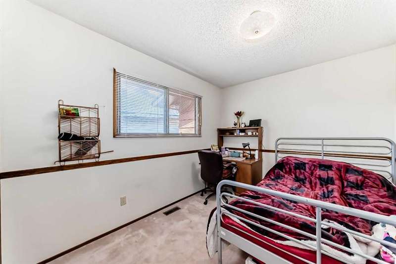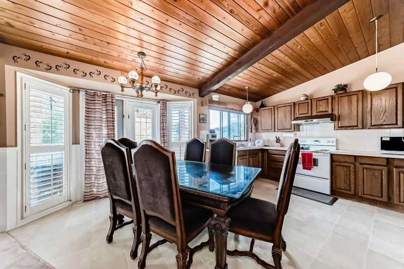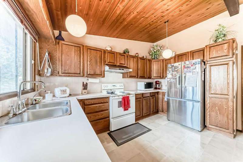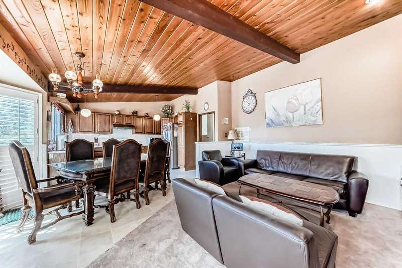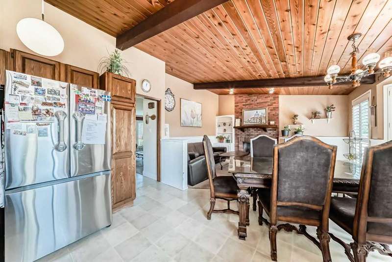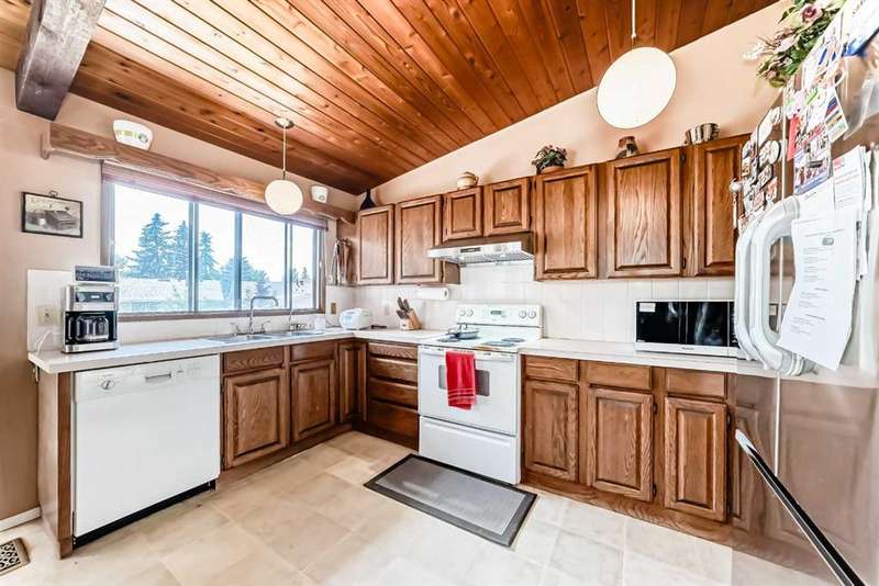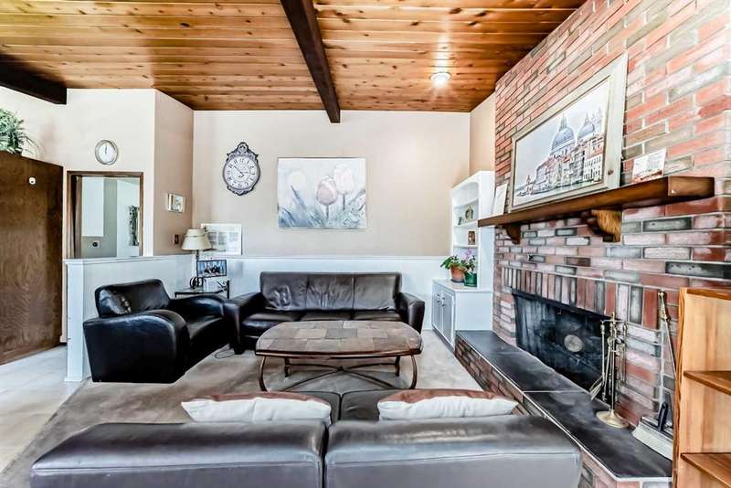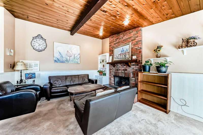 Welcome to this beautifully maintained bungalow nestled in a huge lot at the heart of the well-established community of Temple. Full of classic charm and warmth, with 2,507.7 square feet of living space, this home stands out with its character-rich exterior, featuring brick and cedar finishes that add curb appeal and a welcoming presence. The double front attached garage and double parking pad completes the look, offering both style and functionality. Step inside and you’ll be greeted by a spacious and sunlit living room, perfect for relaxing or entertaining. The main level with tons of natural light flows seamlessly into the kitchen, dining room, and family room, where you'll find gorgeous cedar ceilings and exposed beams—a rare architectural feature that brings warmth, texture, and timeless charm to the heart of the home. A cozy brick facing fireplace in the family room adds the perfect touch for family gatherings or quiet evenings in. This level also offers three generously sized bedrooms and two full baths, including a 3-piece ensuite in the primary bedroom. From the family room, step out into your expansive backyard oasis. Fully fenced and thoughtfully landscaped, it features two decks, mature trees, and lush green grass, making it an ideal space for summer barbecues, gardening, or simply enjoying peaceful moments outdoors. Downstairs, the fully developed basement provides exceptional additional living space, including a recreation room with a second fireplace, three more bedrooms, a flex/den room, and another full 4-piece bath—perfect for growing families or guests. Located in a quiet cul-de-sac and family-friendly neighborhood, Temple offers a strong sense of community, with nearby schools, parks, shopping, and transit options just minutes away. If you’re searching for a home with soul, space, and classic architectural details, this bungalow is a rare find in a beloved Calgary community.