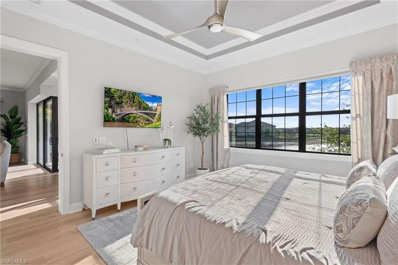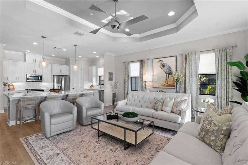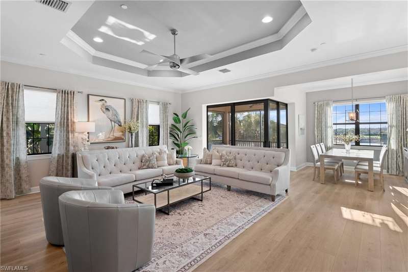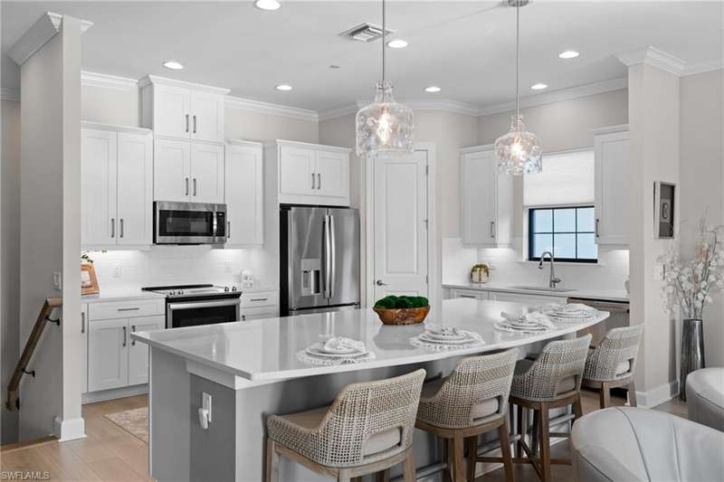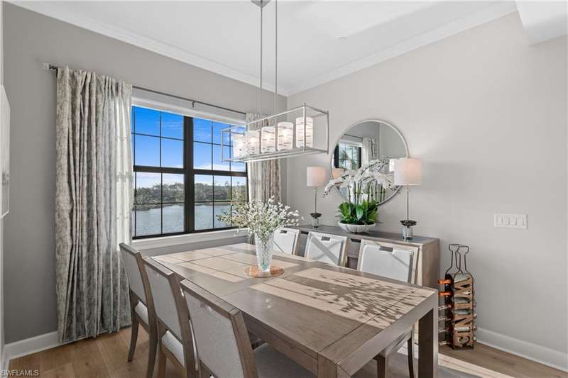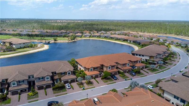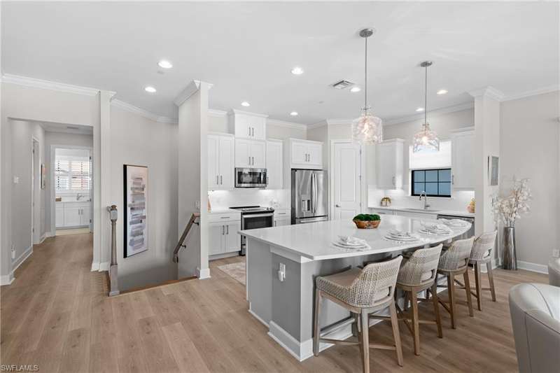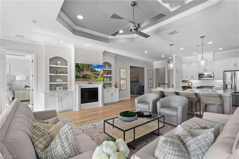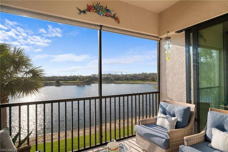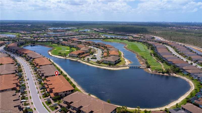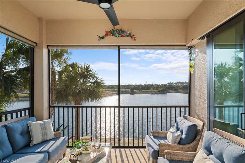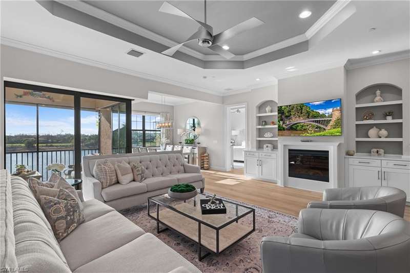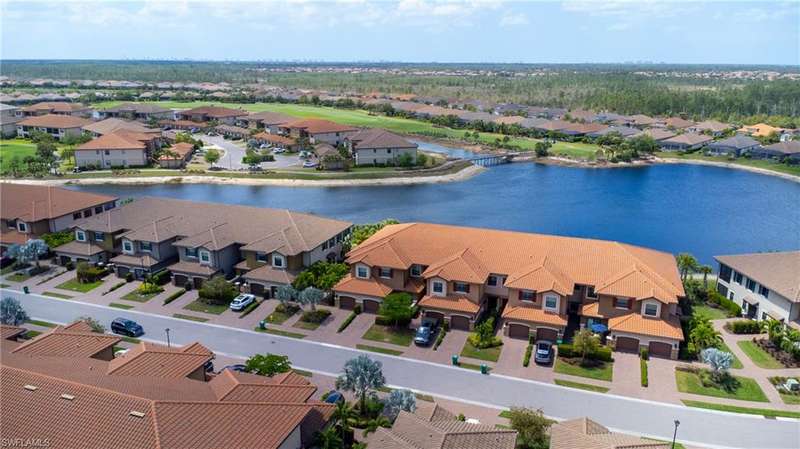 Live a Vacation Lifestyle in Esplanade When Only the Best Will Do! Step into luxury with this highly upgraded Romano floorplan second-floor end unit coach home, located in the prestigious Esplanade Golf & Country Club. Offering 3 bedrooms plus an enclosed den and 3 full baths, this spacious condo spans 2,393 square feet under air and lives like a single-family home. The open-concept design features a generously sized great room with south and west-facing windows, flooding the space with natural light. The kitchen is a chef s dream, showcasing quartz countertops, ample cabinetry, under-cabinet lighting, and stainless steel appliances. Enjoy stunning sunsets from the west-facing corner lanai, offering panoramic views of the lake, golf course, and a picturesque bridge. The master suite is a true retreat, with three windows overlooking the serene views, and a luxurious bath featuring dual sinks, a large walk-in shower with a frameless glass enclosure, and a custom-built shelving unit