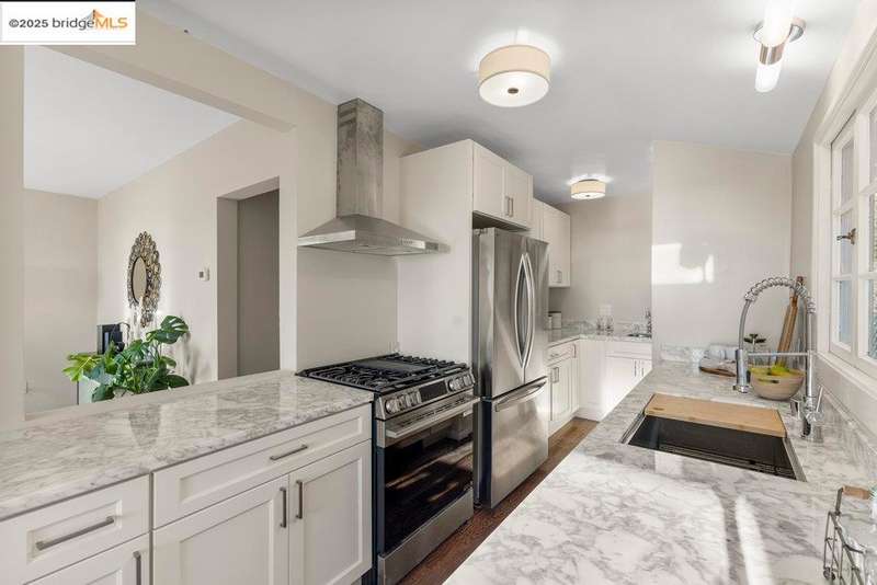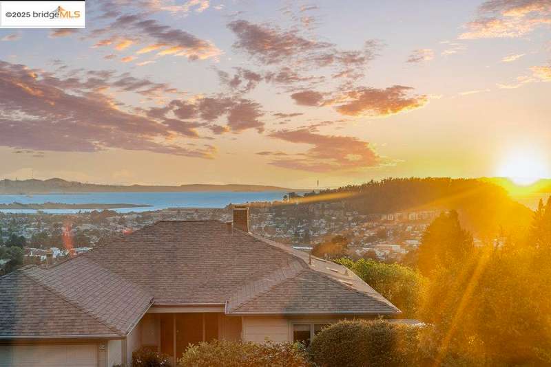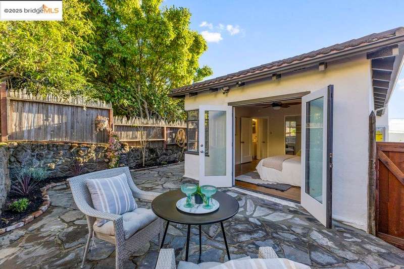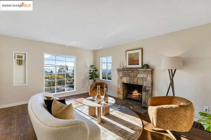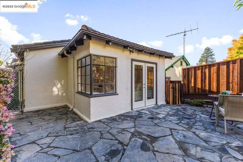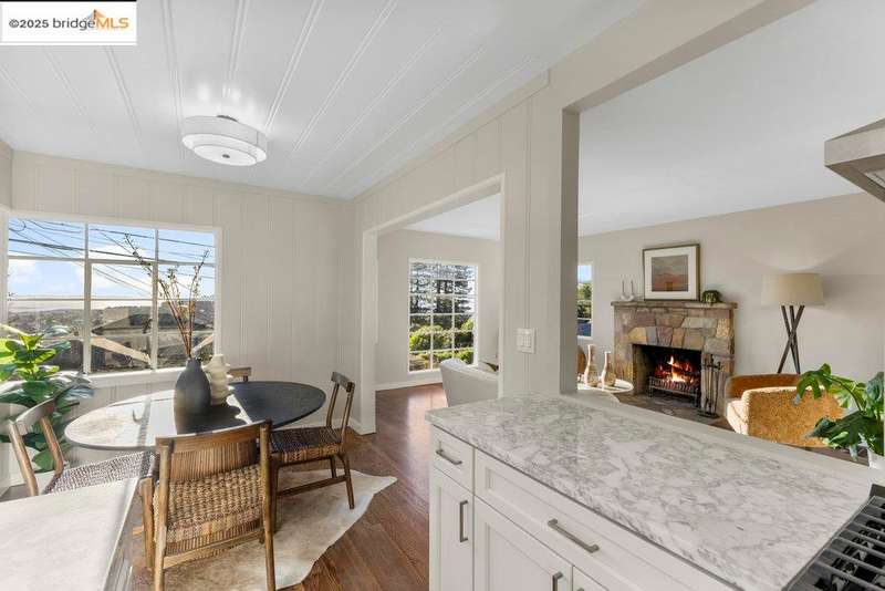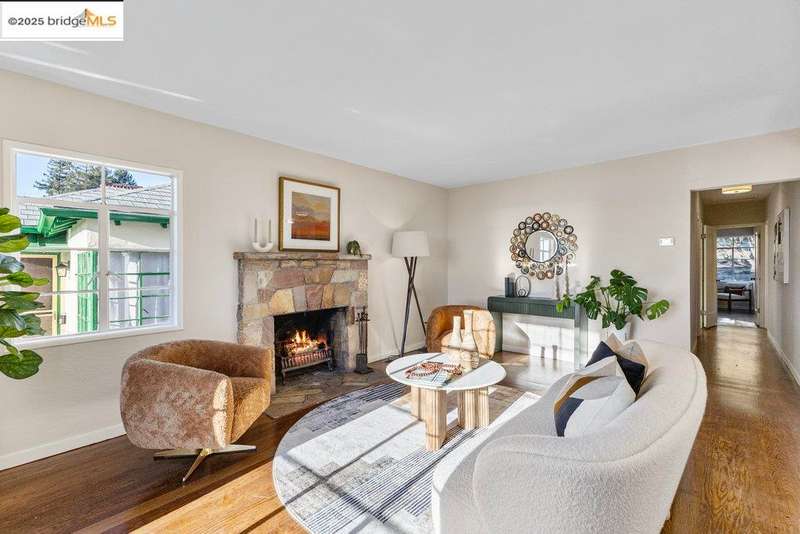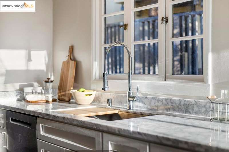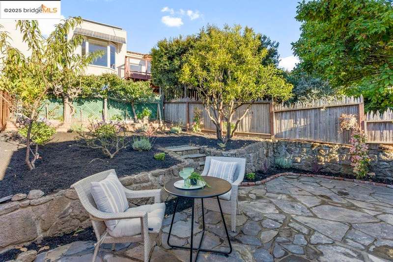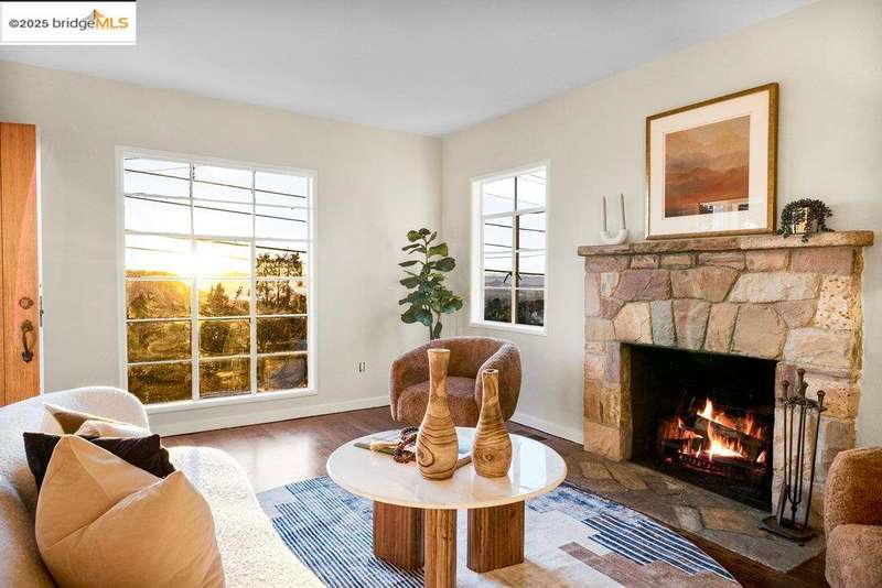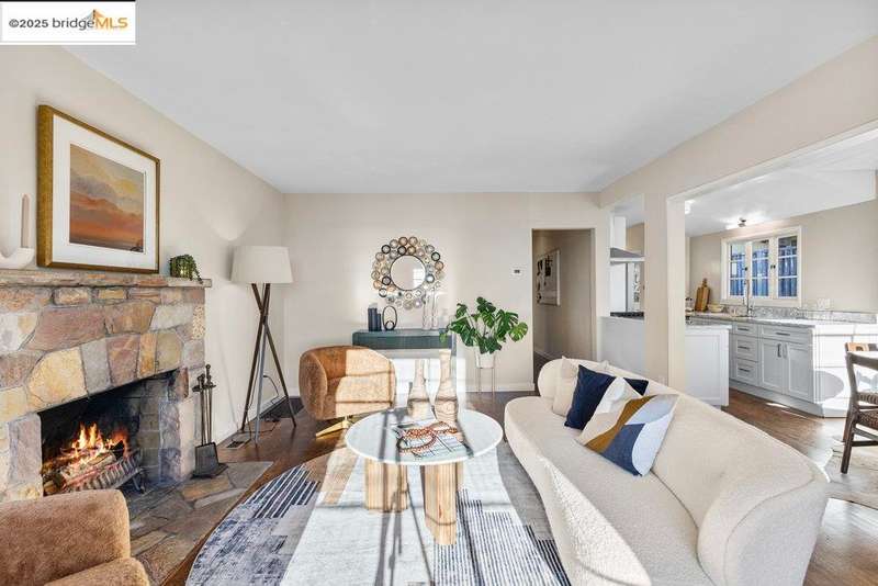 Welcome to a timeless 1938 Craftsman retreat with stunning Bay and San Francisco skyline views! This single-level home offers thoughtfully designed living spaces with an idyllic yard. Refinished hardwood floors, a stone fireplace, and an open layout connect the living, dining, and updated kitchen. Enjoy the kitchen's Carrara marble counters, Shaker cabinets, and stainless appliances. A dedicated pantry prep area with sink, making cooking a joy for the home chef who values form, efficiency, and the space to share cooking with others. The serene primary suite features French doors that open to the backyard patio. A versatile bonus garage room offers space for a gym, workshop, or studio, plus dedicated laundry and interior access. Large flat yard space with slate hardscape patio and a large terrace planting area makes the outside spaces perfect for evening dining, afternoon BBQs, or peaceful relaxation among fruit trees. Updated systems include a new floor furnace and tankless water heater. Enjoy a one-car garage, two off-street spaces, and easy access to Kensington and Berkeley restaurants, shops, Tilden Park trails and transportation.