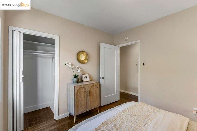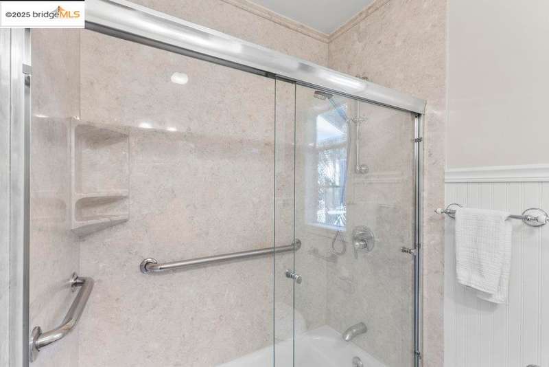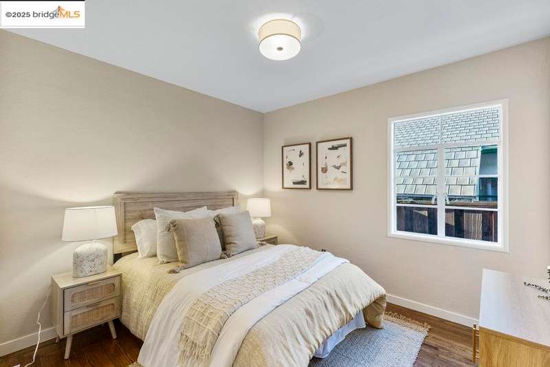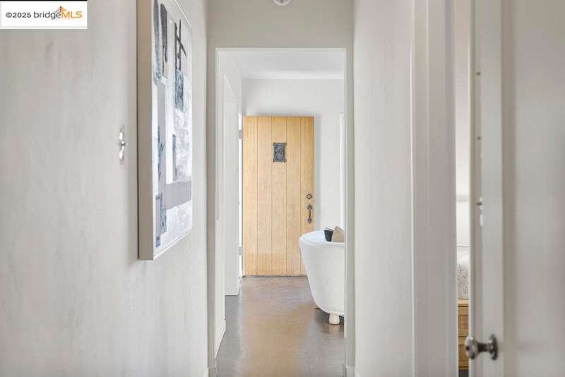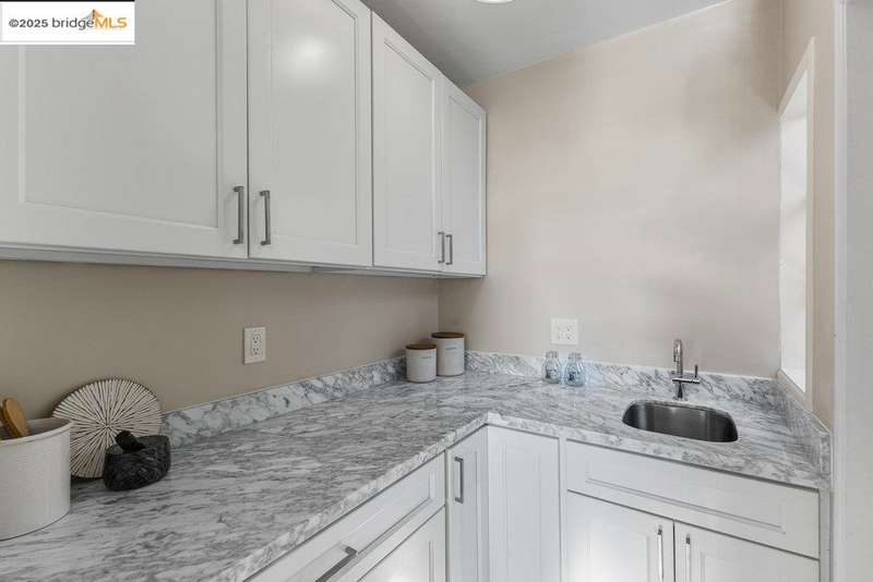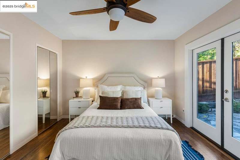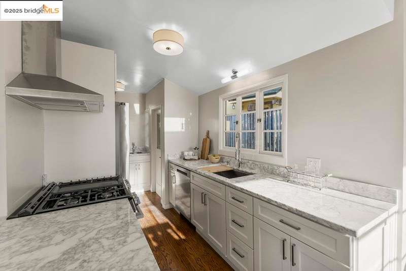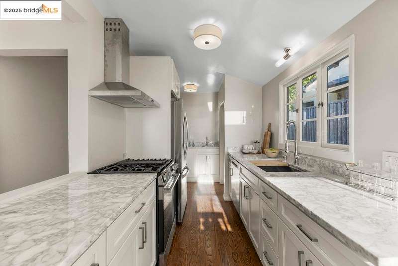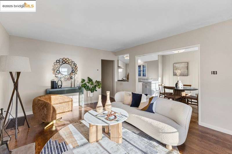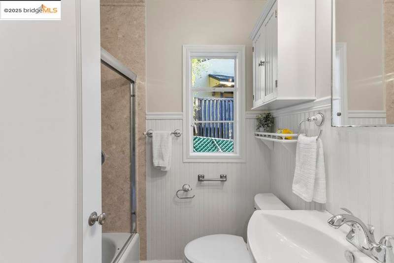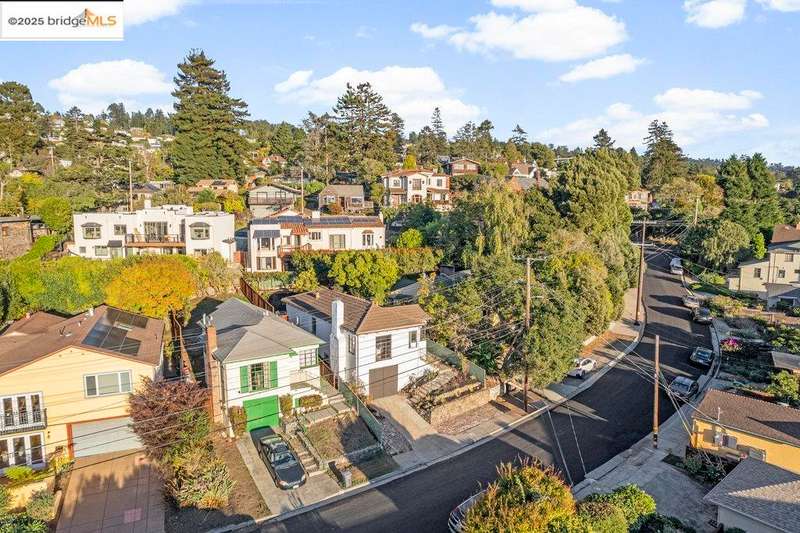 Welcome to a timeless 1938 Craftsman retreat with stunning Bay and San Francisco skyline views! This single-level home offers thoughtfully designed living spaces with an idyllic yard. Refinished hardwood floors, a stone fireplace, and an open layout connect the living, dining, and updated kitchen. Enjoy the kitchen's Carrara marble counters, Shaker cabinets, and stainless appliances. A dedicated pantry prep area with sink, making cooking a joy for the home chef who values form, efficiency, and the space to share cooking with others. The serene primary suite features French doors that open to the backyard patio. A versatile bonus garage room offers space for a gym, workshop, or studio, plus dedicated laundry and interior access. Large flat yard space with slate hardscape patio and a large terrace planting area makes the outside spaces perfect for evening dining, afternoon BBQs, or peaceful relaxation among fruit trees. Updated systems include a new floor furnace and tankless water heater. Enjoy a one-car garage, two off-street spaces, and easy access to Kensington and Berkeley restaurants, shops, Tilden Park trails and transportation.