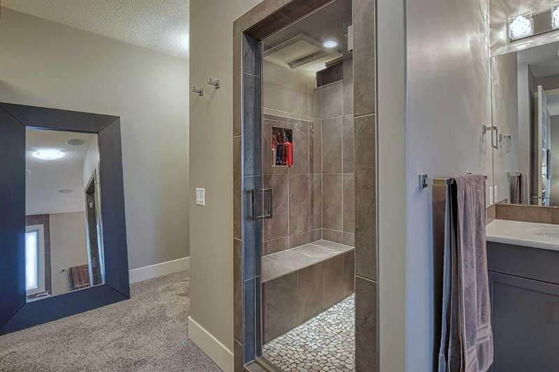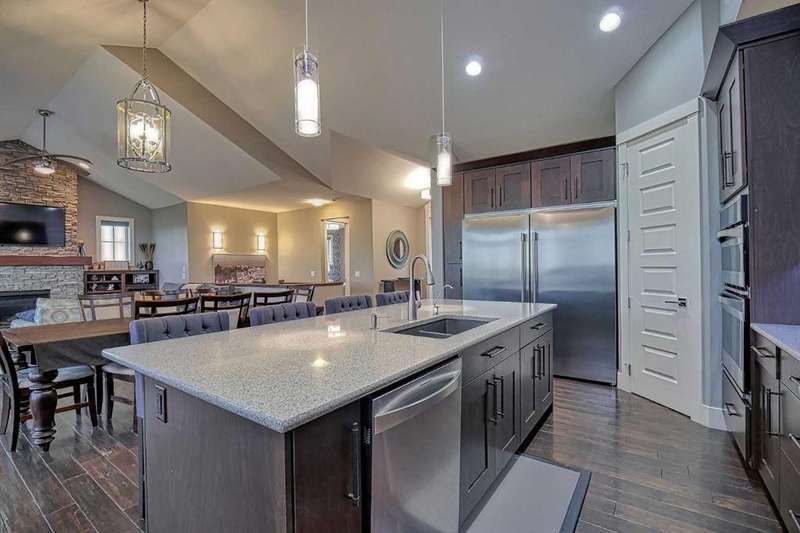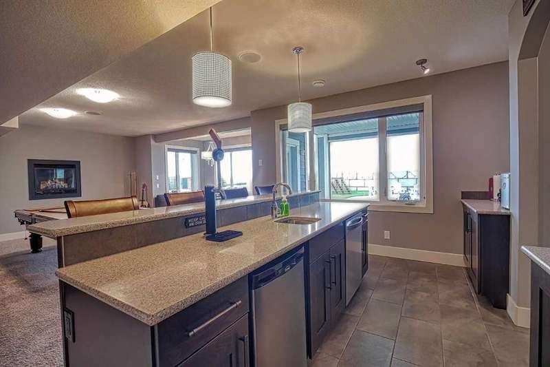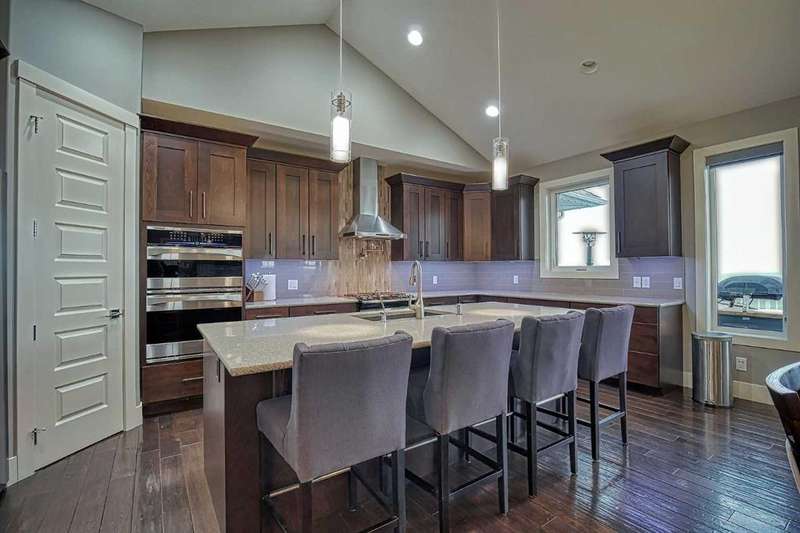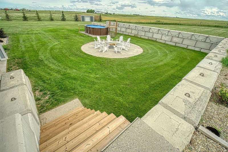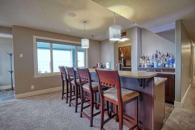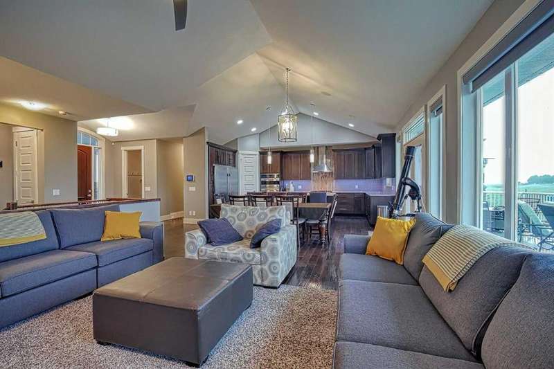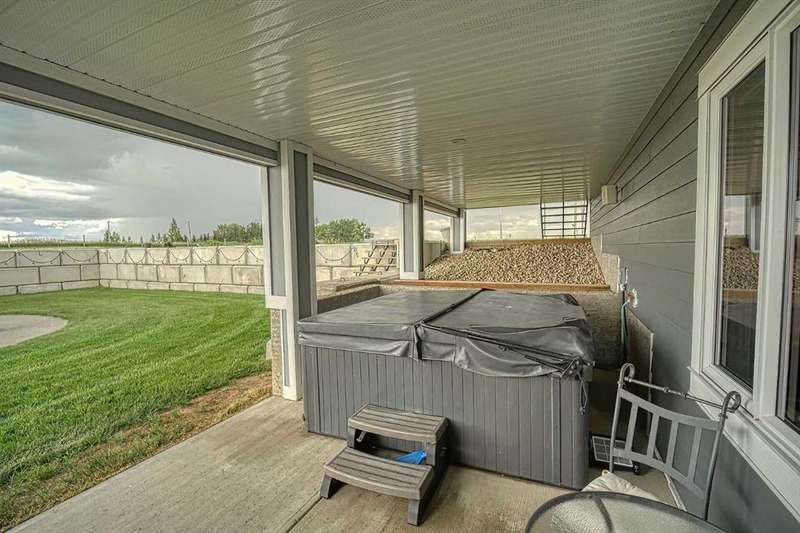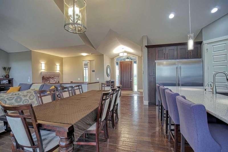 This stunning CUSTOM home was designed with no expense spared. From the moment you enter through the automated gates and follow the paved driveway, the quality is undeniable. Hardy Board siding, a triple garage, Gemstone lighting, and a warm, inviting front porch set the tone. Step into the spacious foyer, complete with its own walk-in closet, and prepare for a WOW moment as the home opens up with light, expansive windows, and breathtaking views. The kitchen, breakfast bar, dining area, and living room share an open-concept design, so no matter where you are, you’re part of the conversation. A floor-to-ceiling brick fireplace with built-ins on both sides anchors the living room beneath soaring 10’ ceilings. The dining area easily accommodates a large table, while the breakfast bar and all countertops gleam with high-quality quartz. The built-in fridge and freezer combo is a generous in size, complemented by two ovens including a built-in microwave, a gourmet gas range with another oven, and a convenient pasta faucet. Hand-scraped hardwood floors add sophistication while maintaining a cozy, farm-inspired feel.This thoughtfully designed kitchen offers expansive quartz counters, abundant cabinetry, and a hidden gem — a walk-through butler’s pantry, providing even more space for your culinary essentials. Double doors open to a spacious deck, perfect for lively gatherings or quiet evenings soaking in the peaceful farm views. In the primary suite, expansive windows frame the rolling landscape, making the view a part of the room itself. A gas fireplace flickers warmly on cooler nights, while a French door leads you directly to the patio for a breath of fresh country air. The luxurious 5-piece ensuite offers a spa-like retreat — a deep soaker tub set beside the fireplace invites indulgent baths, while double sinks, a generous walk-in shower with built-in seating, and a private water closet provide both comfort and function. The grand walk-in closet offers ample space to keep everything perfectly organized. The Main floor features a second bedroom that provides guests or family with their own retreat, complete with a walk-in closet and an elegant 4-piece ensuite. The hall area includes a 2-piece bath, organized laundry room, and mudroom. Downstairs, a media room with a 135” screen and 4K projector is perfect for movie nights. There’s also space for a pool table (negotiable), poker table area and a full wet bar with quartz counters, sink, dishwasher, beer keg with tap, wine storage, and a commercial beverage fridge. This level has two bedrooms with walk-in closets, a 4-piece bath, and a walkout to a covered patio with hot tub, heated above-ground pool, and fire pit. A massive retaining wall ensures privacy, and a shed provides garden storage. There are underground sprinklers. Included are 22 built-in speakers with Control 4 automation, five TVs with mounts, projector and screen & cameras. Come experience Executive Country Living.