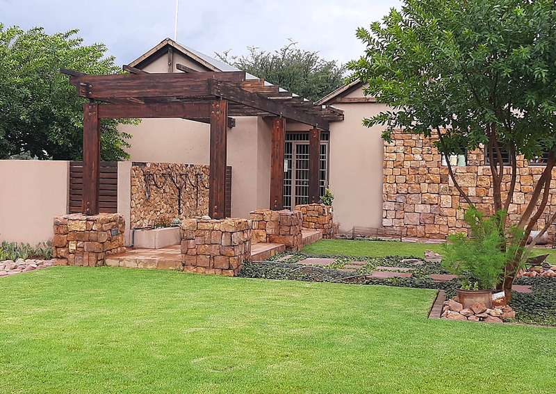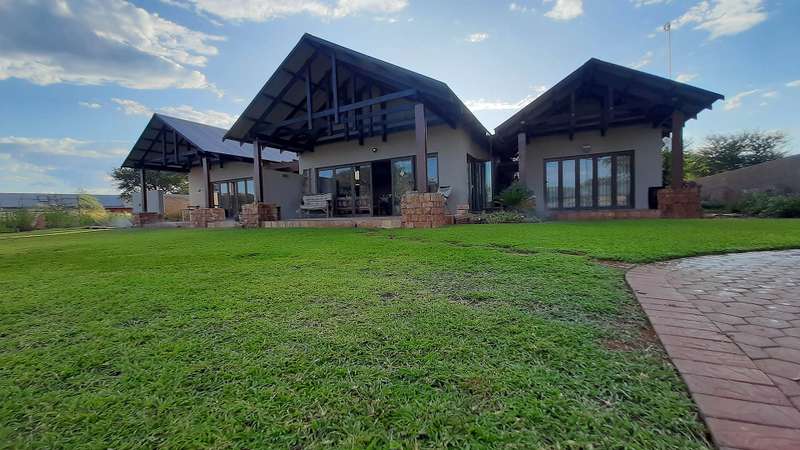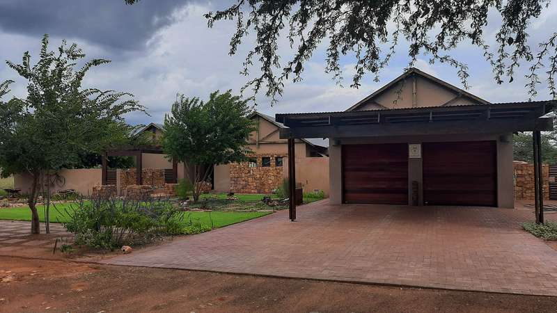 A Luxurious 3 bedroom house with a 15kVA Generator and a borehole in Kathu. This well maintained is situated in the heart of the Kalahari, the popular Kalahari Golf and Jag Estate, where you can have a peaceful and relaxing sunset everyday in the comfort of your own home. The home consist of 3 bedrooms. The main bedroom with an aircon and stacking doors that opens to the Kalahari bushveld and wild animals to see from your bed. There is a spacious dressing room with built in cupboards and drawers with an en-suite bathroom that consist of a bath, big shower, toilet, his and hers basins, extrator and heat lamp. Second bedroom: This b3droom with built in cupboards has an aircon a sliding door that opens on a patio there is a en-suite bathroom with a bath, toilet, basin, extractor and heat lamp. Third bedroom: The third bedroom has built in cupboards an aircon with seperate bathroom consisting of shower, basin and toilet. Study: Large spacious with more then enough desk space with drawer and built in cupboards and an aircon. Living area and Kitchen: Open plan Living area and kitchen with gas stove and electric oven, granite tops, ample cupboards includes a scullery with lots of built in cupboards with dish washer and washing machine connections plus walk in pantry with plenty of shelves. Indoor braai area: Fitted with indoor two in one wood or gas fire place, with stacking doors bringing the Kalahari outdoors, indoors. Or enjoy outdoor living in a well maintained, irrigated garden with boma. All sliding and stacking doors has Trelli doors. There is a larger then average double garage, with a carport for 2 vehicles.