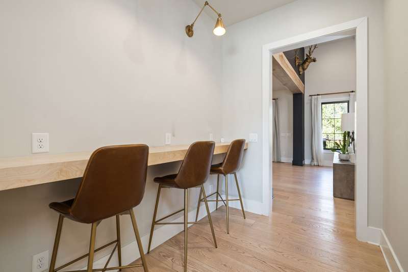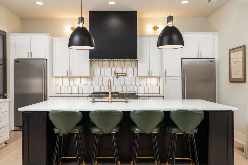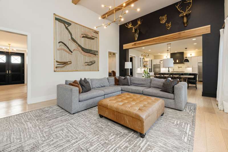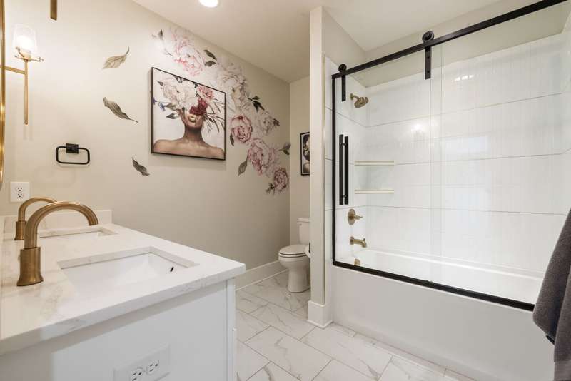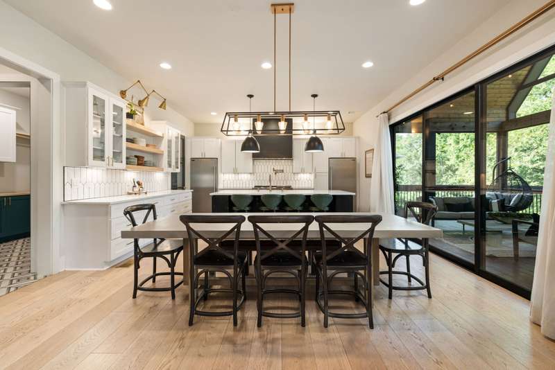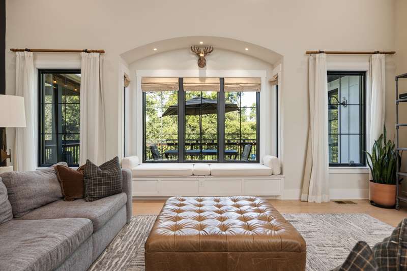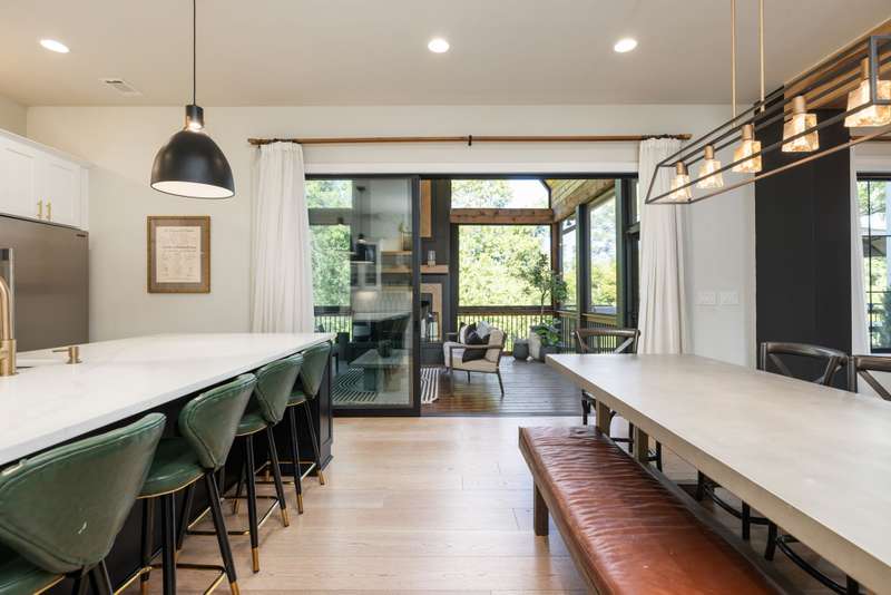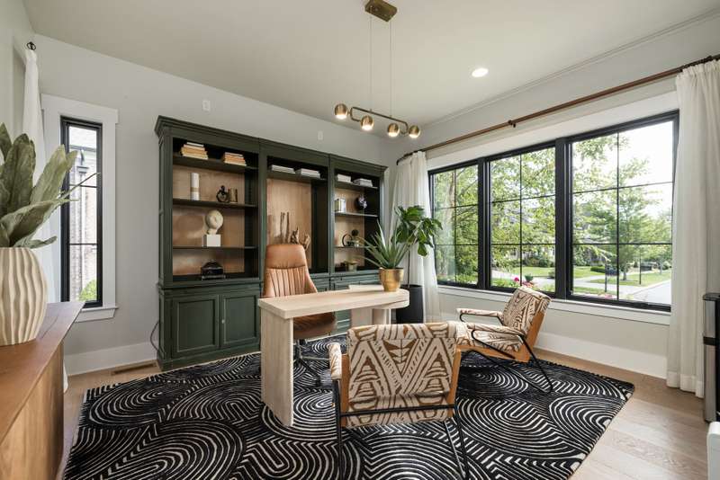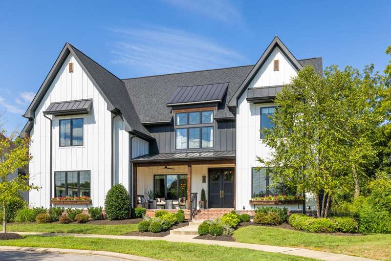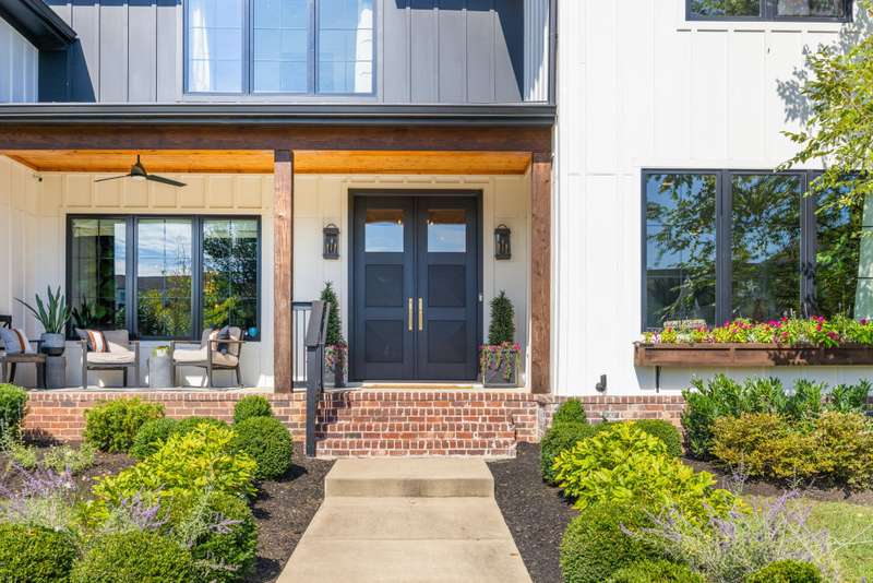 This striking Thompson's Station home blends modern elegance with warm natural accents, featuring a sleek exterior of white, black, brick, and wood finishes. Step inside to a thoughtful floor plan beginning with a moody formal living room--anchored by wainscoting and a statement light fixture--that could also serve as a formal dining space. Across the foyer, a designated office offers custom built-in shelving and cabinetry. The two-story living room impresses with wood-beamed ceilings, a shiplap and tile gas fireplace, and a cozy bay window overlooking the tranquil backyard--the perfect nook for morning coffee, a good book, or evening wine. The kitchen combines function and style with an oversized island, glass-paned cabinetry, open shelving, custom vent hood, top-of-the-line appliances, and a walk-in pantry. A spacious laundry and drop zone with custom cabinetry keeps daily life organized just off the three-car garage, which includes a versatile bay with room for an RV, trailer, or even a partial basketball court. The light-filled main-level primary suite offers a peaceful retreat with a walk-in closet, double vanities, soaking tub, and a floor-to-ceiling tiled shower. Upstairs, enjoy a media room and rec room, while the walk-out basement provides additional living space with a private apartment featuring a full kitchen, bedroom, and bath--ideal for guests. A spiral staircase connects the vaulted, screened-in deck with fireplace to the covered patio below, creating seamless indoor-outdoor living. Additional highlights include abundant unfinished storage space and a serene backyard backing to mature trees and open pasture. Located in the heart of Thompson's Station, this home is minutes from Williamson County schools, scenic parks, walking trails, and the local farmers market, with historic downtown Franklin's shopping and dining just a short drive away.