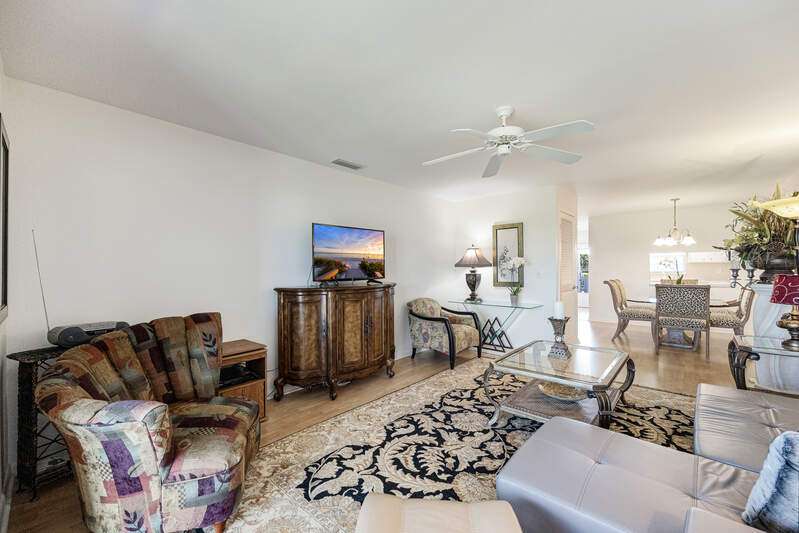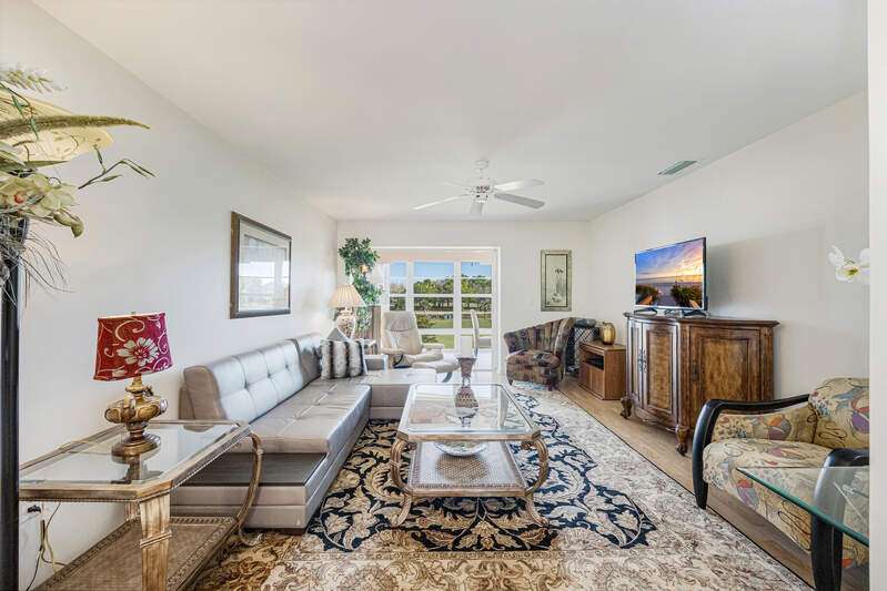 Stunning Turnkey Condo Overlooking Hibiscus Golf Course - VA Approved Community Unit D37 has it all. Experience luxurious, carefree living in this beautifully updated third-floor condo offering 1,126 sq. ft. of thoughtfully designed space. With convenient elevator access and brand-new impact-resistant windows built to withstand Category 5 hurricanes, you'll enjoy both comfort and peace of mind. Step inside to tall ceilings and a fresh, modern ambiance, no popcorn ceilings here! This turnkey residence comes fully furnished with high-end leather furniture and curated artwork, blending sophistication with inviting warmth. The kitchen features quality appliances, including a brand-new over-the-range microwave, while laundry is conveniently located in the residence for ease of living. Unwind on your private, air-conditioned lanai with sweeping views of the Hibiscus Golf Course fairway, tranquil pond, and swaying palms. Covered parking with extra storage, a newer HVAC system, and energy-efficient impact windows further enhance this home's appeal. Vista Palms is a vibrant VA Approved 55+ community, offering a lifestyle as active as it is refined. Ideal as a primary home, seasonal retreat, or investment property, this residence presents an exceptional opportunity to embrace Southwest Florida living at its finest. Welcome home.