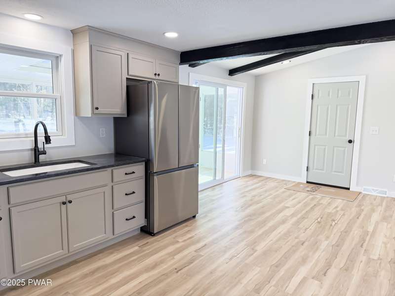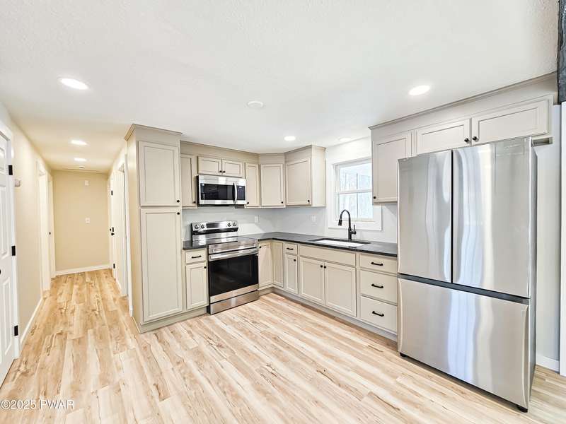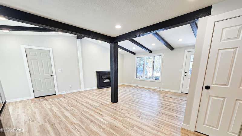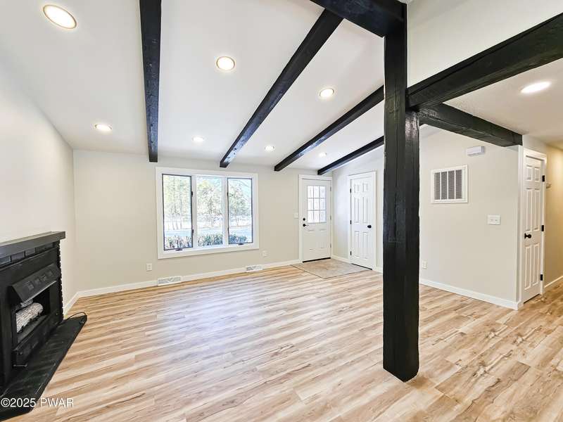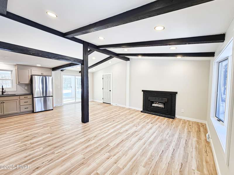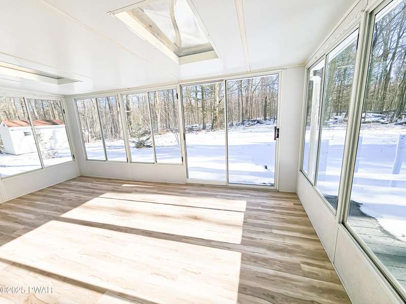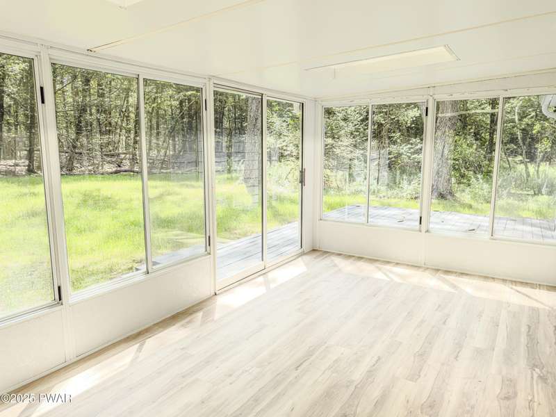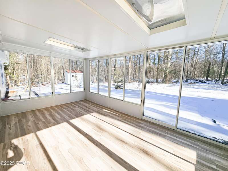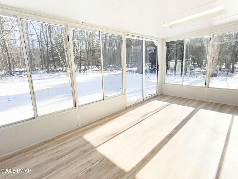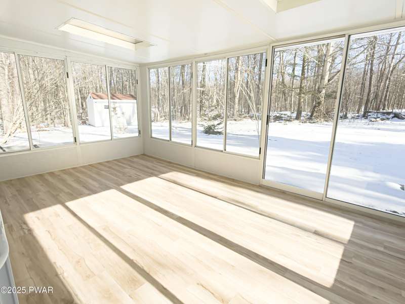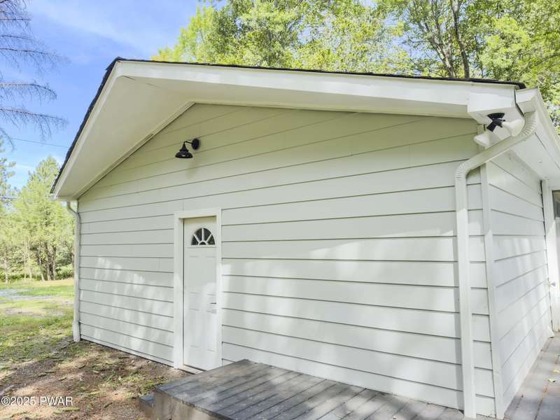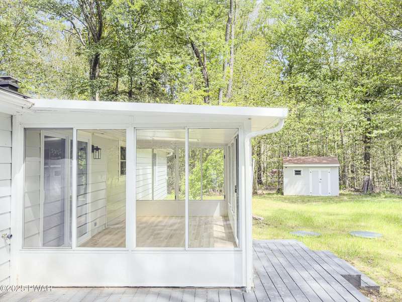 PRIVATELY SET + ALL NEWLY RENOVATED 3 Bedroom, 1 bath, 1 car heated and sheetrocked garage, on 2 lots totalling nearly an acre of property and BACKS TO STATE LAND! This home sweet home has been completely gutted and remodeled! Light & bright open floor plan w/ vaulted beamed ceilings, eat-in kitchen w/ beautiful modern cabinetry and black granite counters, spacious dining area, propane living room fireplace, trendy bath w/ glass shower doors, and HUGE 3-Season sunroom to enjoy your completely private back yard! Natural stone walls border the back of the property near the state land. Storage shed for additional space AND BRAND NEW SEPTIC SYSTEM!!! NEW 200 AMP ELECTRIC SERVICE meter and panel also. Nothing left to worry about except when to move in. Sweetly set down a quiet country road, yet minutes to grocery, gas and the highway. Close to Lake Wallenpaupack Ledgedale access area, Promised Land State Park, and all local Poconos activities. Realtor owned.