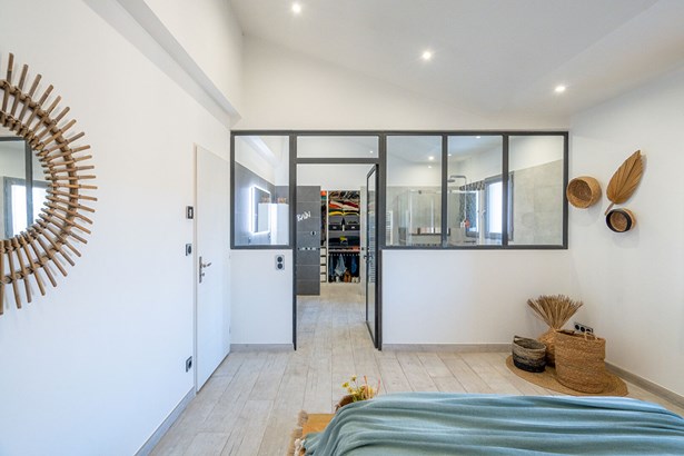 The entrance opens onto a large living space which accommodates the living room, a dining area and an open kitchen, illuminated by the large bay windows which offer a view of the outside, the swimming pool and the poolhouse. Upstairs, there are two bedrooms which share a bathroom and a dressing room, a master suite with a shower room and an open dressing room as well as a large office.