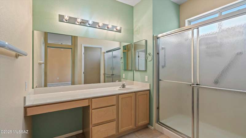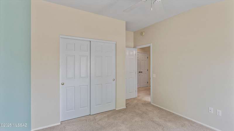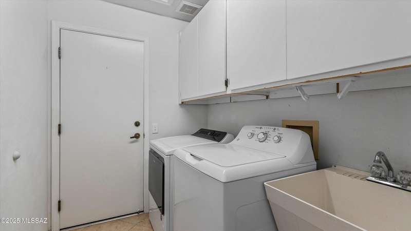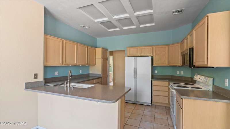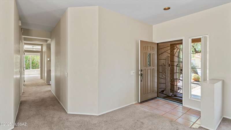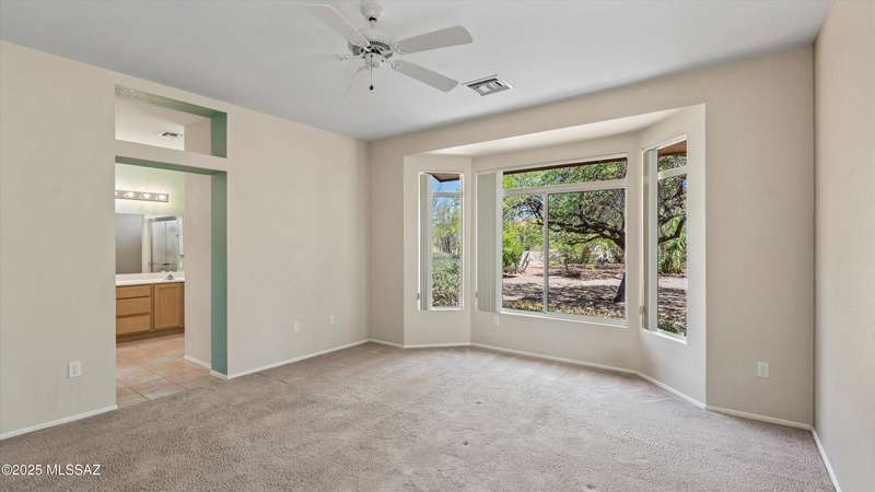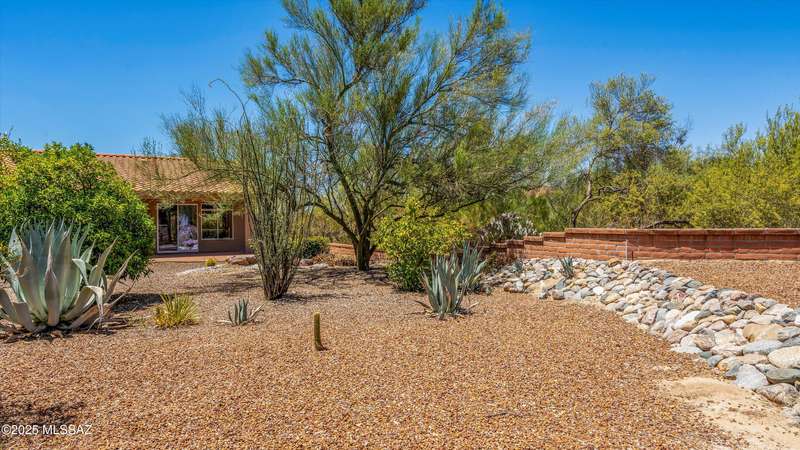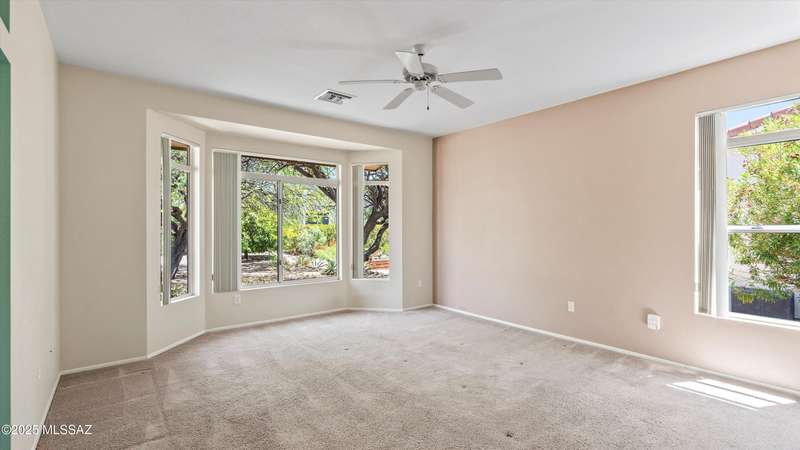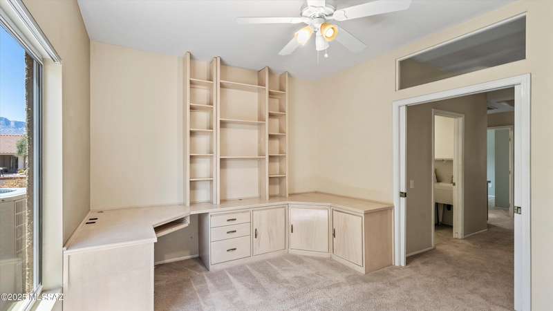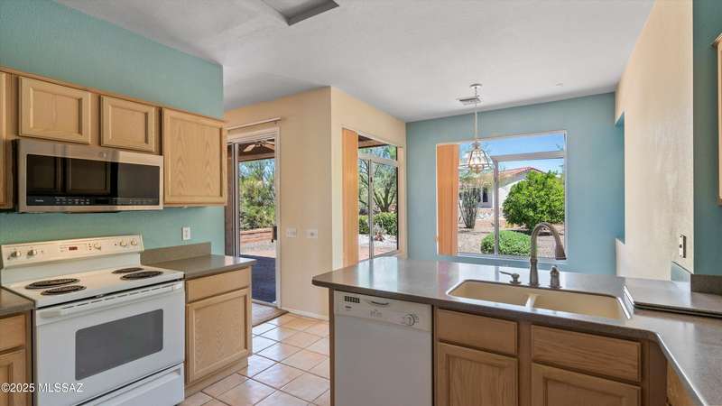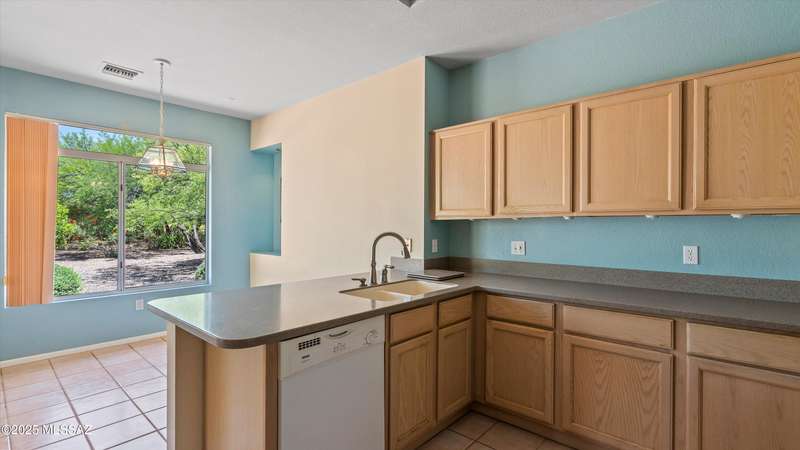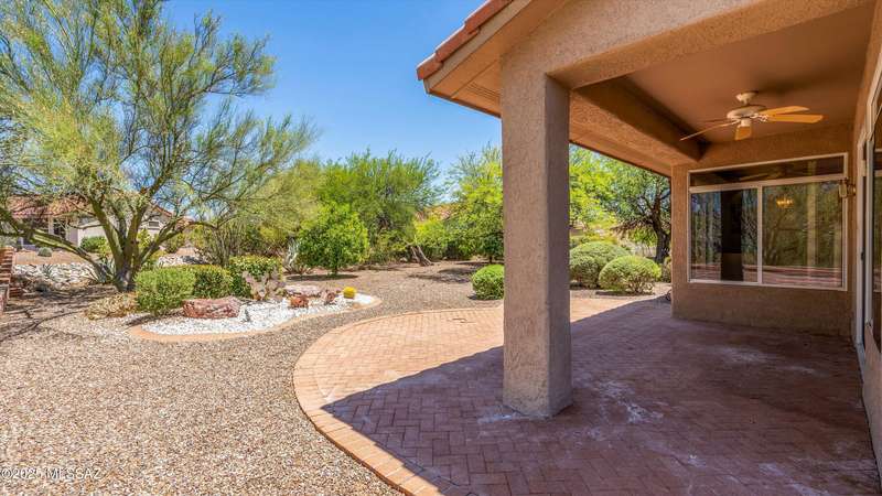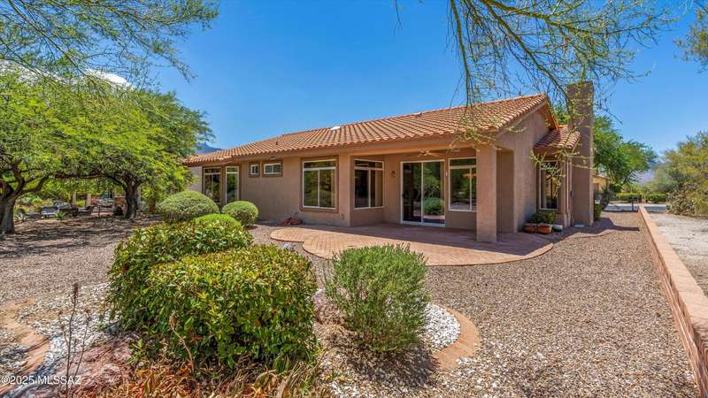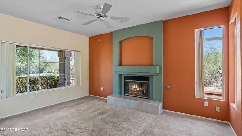 Enjoy this spacious Rio Vista Model on a large lot next to open common area with stunning Catalina Mountain views! This 1,689 sq ft home offers 2 bedrooms, 2 bathrooms, and a versatile den with built-in cabinets and a desk. Features include a gas fireplace, ceiling fans, skylights, and a new HVAC (2024) washer/dryer (2023) and water heater replaced 2020. The open kitchen has a breakfast nook with custom tile artwork and recessed lighting. The primary suite boasts a bay window and walk-in closet with a skylight. Relax on the covered patio while taking in the mountain scenery. The garage is extended and has plenty space for golf cart and storage. This home is ready for your creative vision and finishing touches. A wonderful home in a beautiful setting! Seller offering credit for flooring.