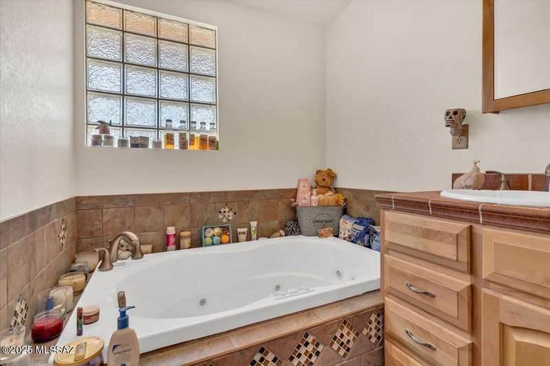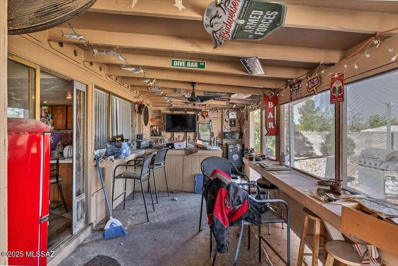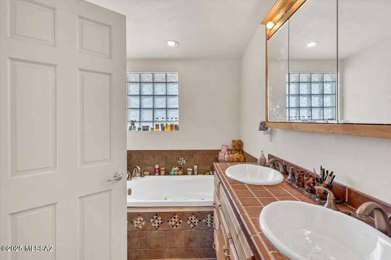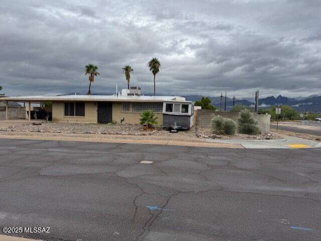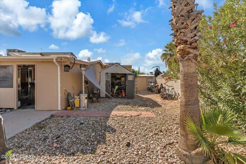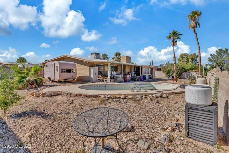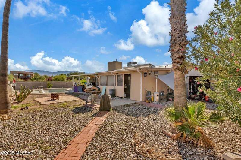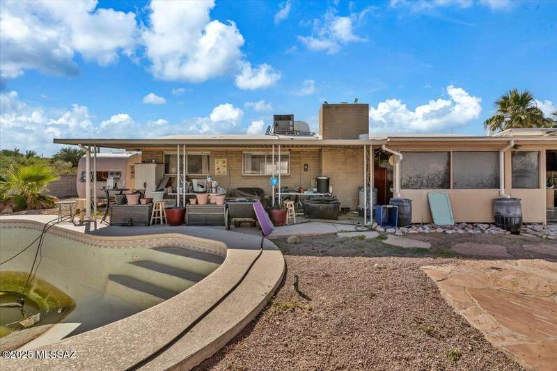 Discover this 3-bedroom, 2-bathroom home nestled on a large lot in the sought-after Hidden Hills neighborhood of Tucson with no HOA. Enjoy beautiful mountain views from your backyard featuring a pool, screened-in patio, and built-in bar -- perfect for relaxing or entertaining. The primary suite offers a jetted tub for unwinding after a long day. With ample storage sheds and plenty of outdoor space, this property has room for all your needs. Home does need some TLC, giving you the opportunity to add your own personal touch and create the home of your dreams. Pool will need to be replastered.