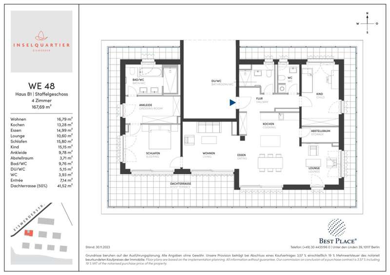 Penthouse living on a new level: move into your TOP-equipped new-build penthouse in the Inselquartier Eiswerder soon. This light-flooded penthouse apartment impresses with its exquisite furnishings and timeless elegance. The heart of the apartment is the open-plan living area: it offers enough space for a dining table where you can get together with family and friends for a delicious dinner and for a cozy seating area where you can relax at the end of the day. The penthouse also has a device for a fireplace. Floor-to-ceiling windows open up a spectacular view of the water, providing fascinating impressions at any time of day. Another highlight is the wrap-around terrace: here you can enjoy breakfast with the family with breathtaking views or treat yourself to a glass of wine while watching picturesque sunsets and enjoying life to the full. In the two spacious bathrooms, you will find high-quality brand-name products, a rain shower and a bathtub that promises pure wellness. An elevator takes you conveniently to your apartment door, and the penthouse also has an underground parking space. Here you can live in an exclusive and peaceful environment while enjoying the amenities of the Berlin metropolis. An ideal retreat for couples and families!