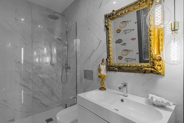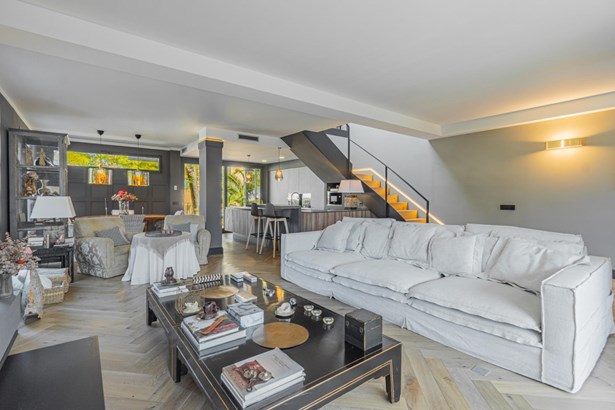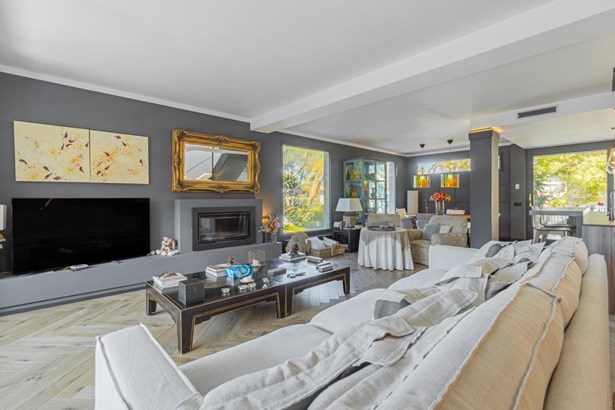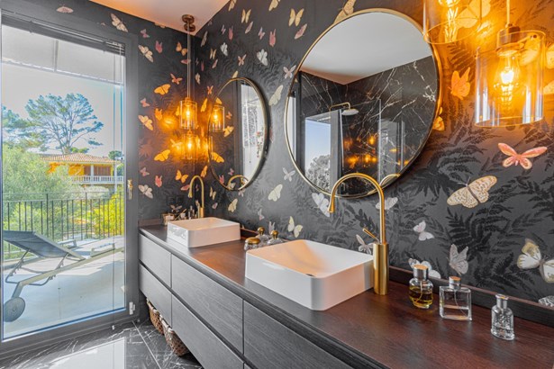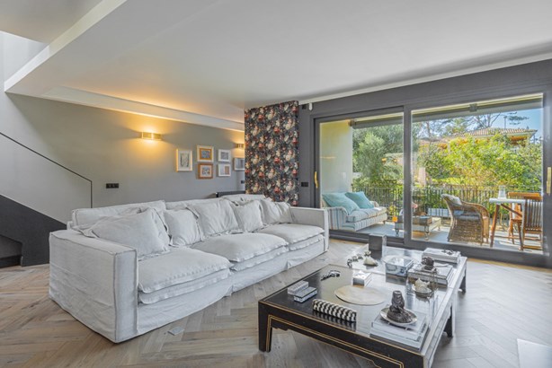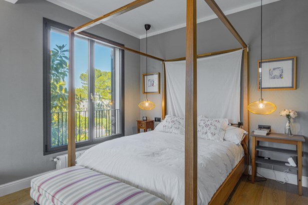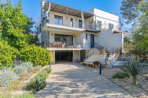 Semi-detached Villa for Sale in Cala Blava - Bellavista.~~This elegant semi-detached villa is located in the Cala Blava area, offering privacy and unobstructed views of Palma Bay. The property is just a few minutes from the sea, the area's finest coves, and only 13 minutes from the airport. With a built area of 255 m², the house is distributed over three levels.~~On the main floor, a spacious and bright living-dining area integrates with the open-plan kitchen, which is fully equipped and features an efficient Bora extraction system. The living room has large windows that provide natural light and access to two terraces overlooking the garden. This floor also includes a guest toilet.~~The upper floor features an open-plan study with a large skylight, two double bedrooms (with the option for a third), and a full bathroom. The master suite includes a walk-in closet, an en-suite bathroom, and access to a spacious terrace with unobstructed views of Palma Bay. From the rear terrace, there is access to the rooftop, a large space perfect for enjoying the natural surroundings and the panoramic views this property offers.~~On the lower floor, the home provides multiple usage possibilities: a garage, storage space, pantry, a second kitchen, or even a bathroom, making it ideal for gatherings or converting into a guest apartment.~~The outdoor area features a private garden, barbecue area, and several terraces.~~Additional features of the property include wooden flooring, aluminum carpentry with Climalit double glazing, heating, air conditioning (hot/cold), and a fireplace.