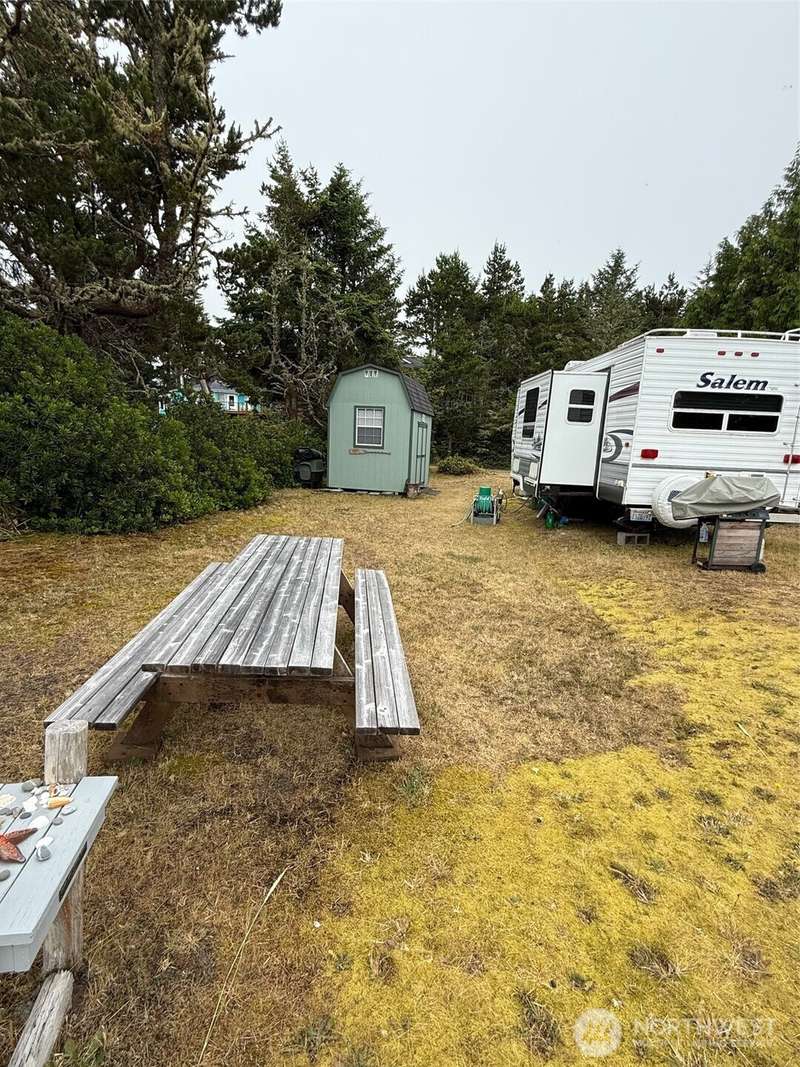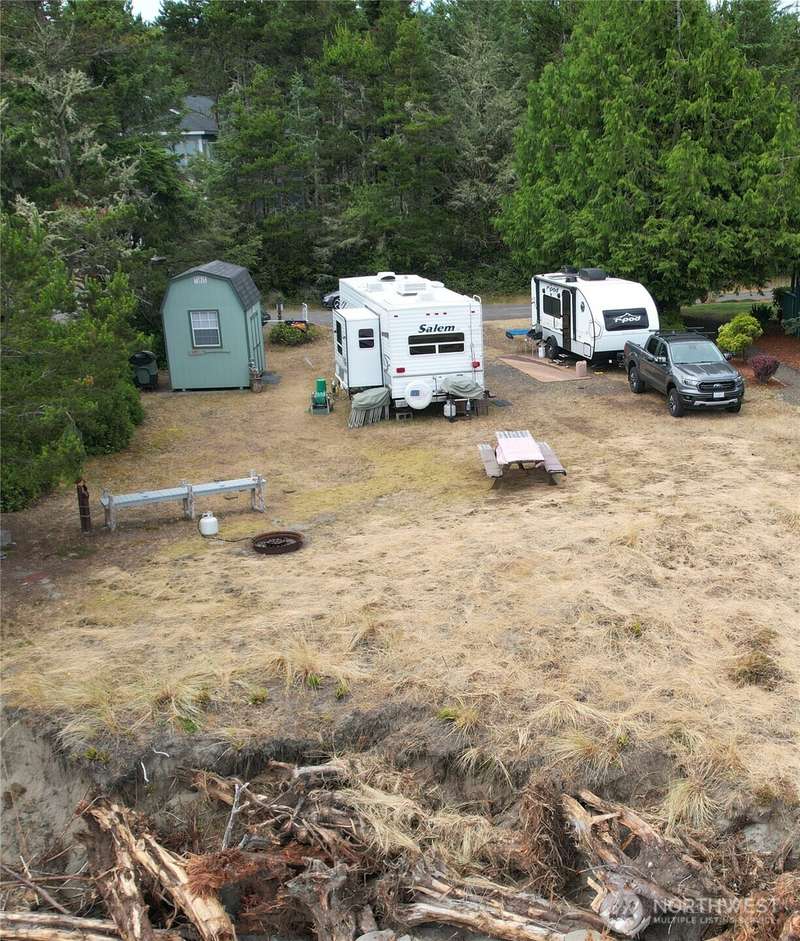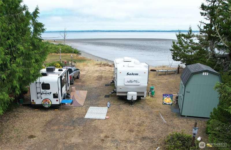 Stunning views of the bay & mountains, enjoy sunrises and sunsets from this developed RV lot (full hook ups) Located on a quiet Cul-d-sac just minutes from downtown! The property adjoins public property with a stairway for easy access to the beach! Plenty of room for everyone to enjoy outdoor living at its finest! Set up your RV or tent camp! The shed has a padded loft for sleeping & a window for plenty of light. Or build your dream home with forever views! This property is opted out of the community club; new owner has the option of joining with no penalty.