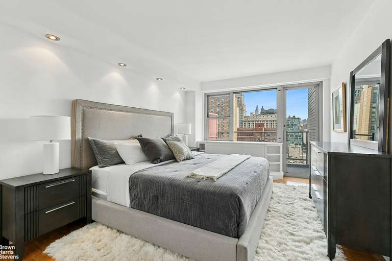 The king-sized primary suite is conveniently private from the living space, highlighted by its own outdoor terrace showcasing stunning nighttime views of Manhattan's landmark buildings. The bedroom is complete with a plethora of closet space along the wall and an en suite bath with stone tile, pedestal sink and soaking tub to add to the retreat-like feel.