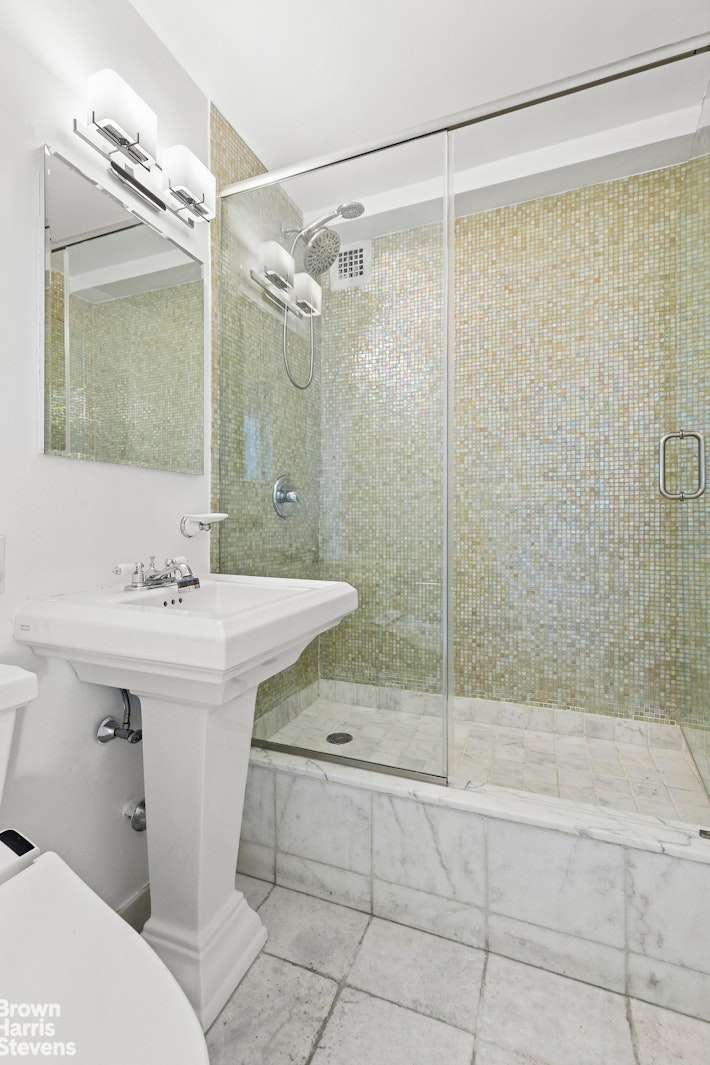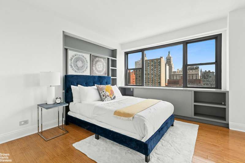 A second bedroom -flexible in use and currently open to the living area configured as an oversized one bedroom -features northern exposures, a large closet and in-unit washer/dryer, a rare and grandfathered perk in this building. Nearby, a renovated full bathroom with walk-in shower doubles as a stylish guest bath which can function with en suite access to suite your needs. Seven closets and custom recessed lighting combined with a generous and versatile layout await in this high floor special home.