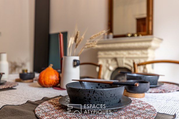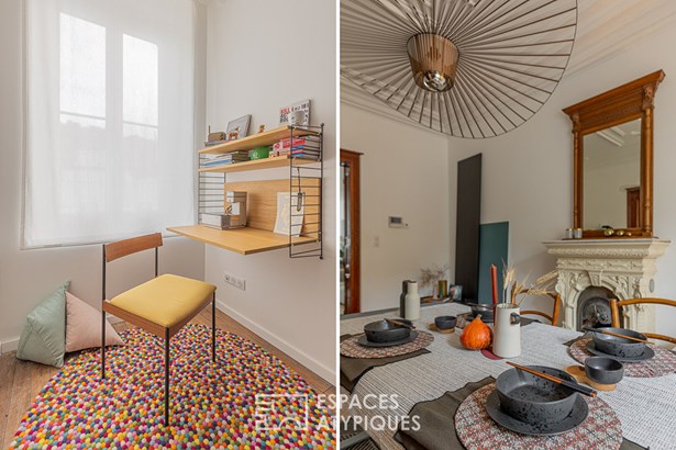 En franchissant le seuil, le couloir orne de carreaux de faïence d'origine donne le ton de l'ensemble de la batisse. Il dessert un salon-sejour double aux genereux volumes, agremente de parquet en bois d'origine, de tres jolies moulures et d'une cheminee ancienne. Baigne de lumiere naturelle, il invite a la detente dans un cadre elegant. De l'autre cote du couloir, la cuisine independante est amenagee dans un style epure. Un bureau qui pourrait devenir une chambre complete ce niveau.