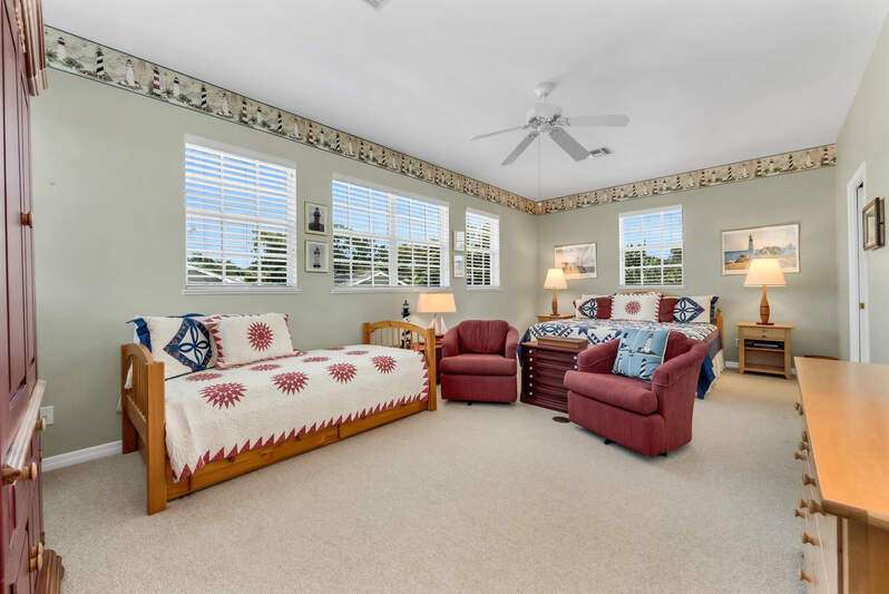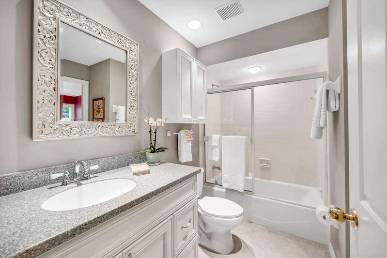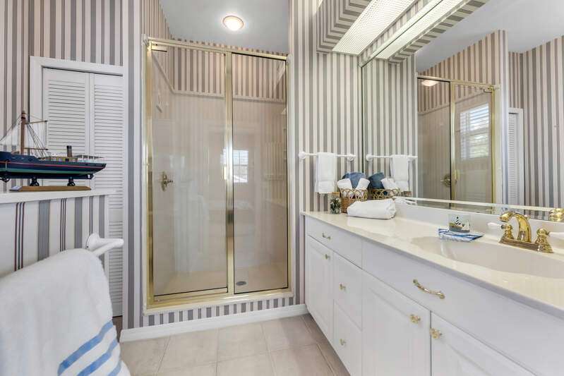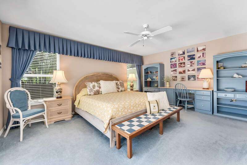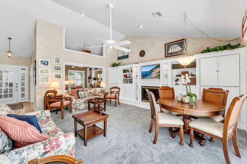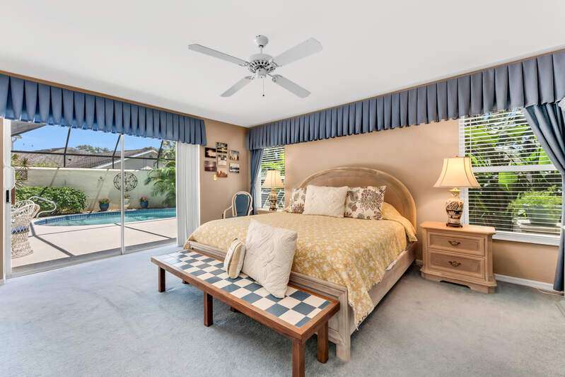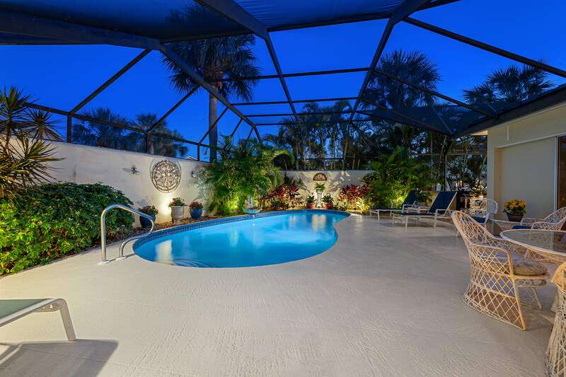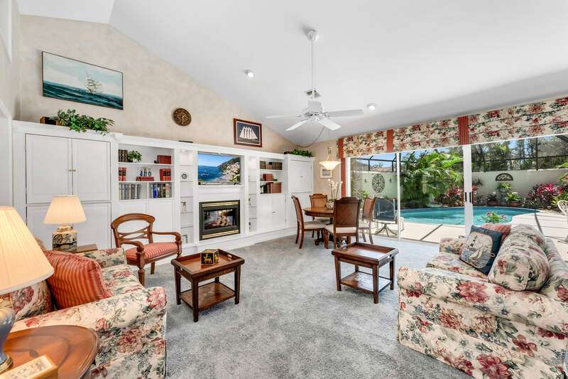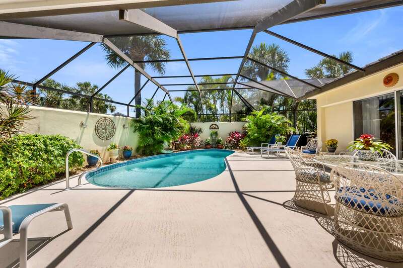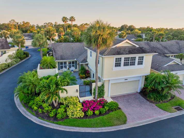 Incredible Opportunity JUST GOT BETTER! Welcome to this light-filled, end-unit 3+Den attached villa in the heart of Tuckaweye-one of Bonita Bay's most cherished neighborhoods. Brimming with traditional, classic style and timeless charm, this residence offers the ideal blend of comfort, space, and versatility-ideal for year-round living or a seasonal retreat. From the moment you arrive, the welcoming entry courtyard sets the tone. Inside, the open great room floorplan flows seamlessly into a bright eat-in kitchen, with all sliding doors leading out to the spacious screened lanai-complete with a private, heated pool and tranquil fountain, lovely landscaping complete with custom lighting, all perfect for entertaining or relaxing in total privacy. The primary suite is thoughtfully separated from the guest accommodations and features a walk-in closet, dual vanities with elevated sinks, and a private water closet. The main-level guest suite offers its own ensuite bath, while the custom designed and built upstairs guest house-a welcome addition-offers full living and sleeping quarters, a walk-in closet, wraparound windows, and a full bath. This flexible space is ideal for visiting friends and family or could easily serve as a second primary suite or media room. Additional highlights include a den/flex space, a 2-car garage, and lovingly maintained interiors ready for your personal touch. Located on a desirable corner lot, this villa is just steps from Tuckaweye's community gathering patio-fostering a friendly, social atmosphere. Enjoy all the amenities Bonita Bay has to offer, including miles of walking trails, numerous parks, business and fitness center, private beach club access, and optional golf and club memberships.