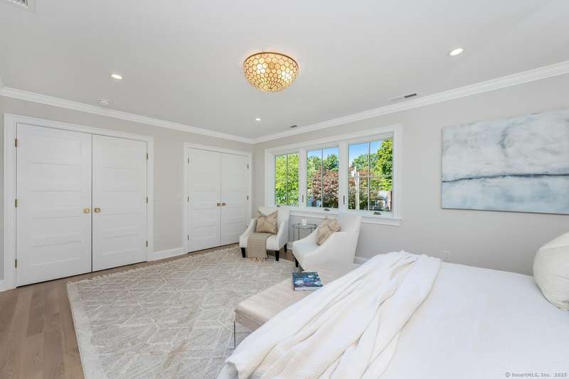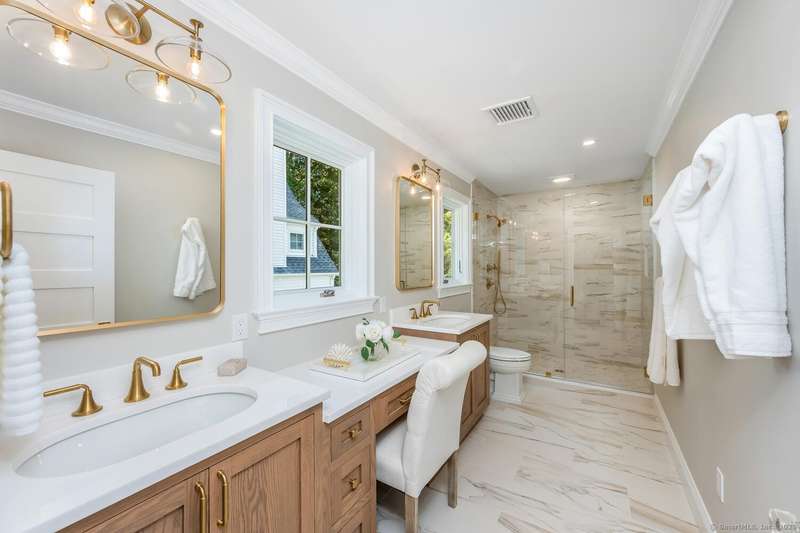 This newly re-built 4-bedroom, 3-bath Colonial offers 2400 sq feet of finely crafted living space on a level .25-acre lot. Set on the corner of Anthony Lane and a cul-de-sac, the property pairs neighborhood charm with privacy. Enjoy the outdoors in a newly fenced yard with professional landscaping and a full irrigation system. Inside, the open layout is defined by natural light and superior craftsmanship. White oak floors run throughout the home, complemented by custom millwork and oversized windows. The living room's fireplace, framed by built-in cabinetry, provides both warmth and architectural interest.The chef's kitchen impresses with custom cabinetry, quartz countertops, and high-performance energy-efficient appliances. A large mudroom with integrated laundry is designed for durability and organization. A first-floor bedroom offers versatility as an office, guest suite, den or playroom. The full bath is finished with frameless glass shower ensuring comfort and style. Upstairs, three bedrooms feature ample closets and abundant light. The hall bath includes a glass-enclosed tub/shower, dual windows, heated floor. The primary suite features two large closets and bath highlighted by a walk-in shower, heated floors, double sink vanity and polished finishes. With zoned propane heating, central air, and a balance of classic proportions and modern amenities this home combines elegance and functionality less than one mile to shops, dining and transportation of Noroton Heights.