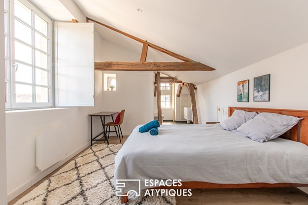Accessed by a helical stone staircase, the recently fully renovated apartment offers generous volumes with ceilings following the ridge line. The superb beams are highlighted in the living room, lounge, and kitchen. A first bedroom with a shower room is located in the extension of the living spaces. A contemporary wooden staircase leads to the lower floor, where there is a second bedroom with its own bathroom.