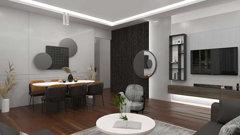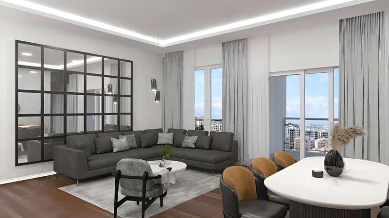 Apartments include an open-plan kitchen and separate kitchen options, an en-suite bathroom, high-quality interior materials, ceramic and wooden floorings, double-glazing windows, first-class kitchen cabinets, electric blinds, air conditioning, and a built-in set.