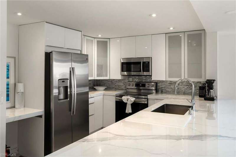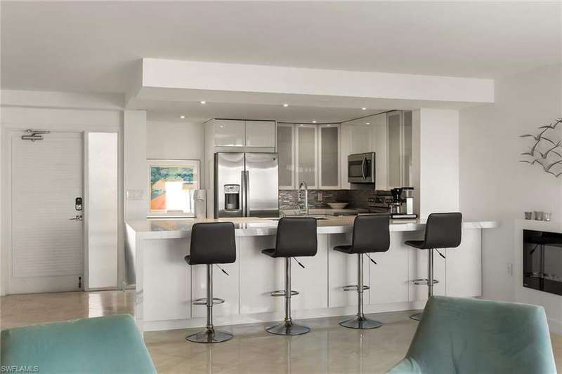 This beautifully remodeled 2-bedroom, 2-bath condo is located in one of the most sought-after locations on Fort Myers Beach-where the sand is widest and the Gulf views are absolutely stunning. Overlooking both the sparkling pool and the Gulf of Mexico, this open-concept residence is perfect for entertaining. The modern kitchen features upgraded cabinetry and sleek quartz countertops, while the adjacent dining area offers a cozy built-in fireplace for added charm. The spacious primary suite includes two closets and an en-suite bathroom with quartz countertops and a luxurious walk-in shower. The guest bathroom is also updated with a stylish walk-in shower. Enjoy the best of beachfront living on the serene south end of Fort Myers Beach-where comfort, style, and location come together.
