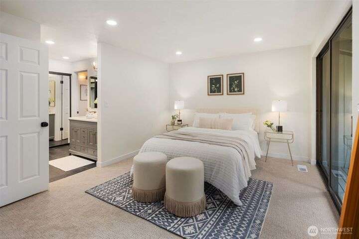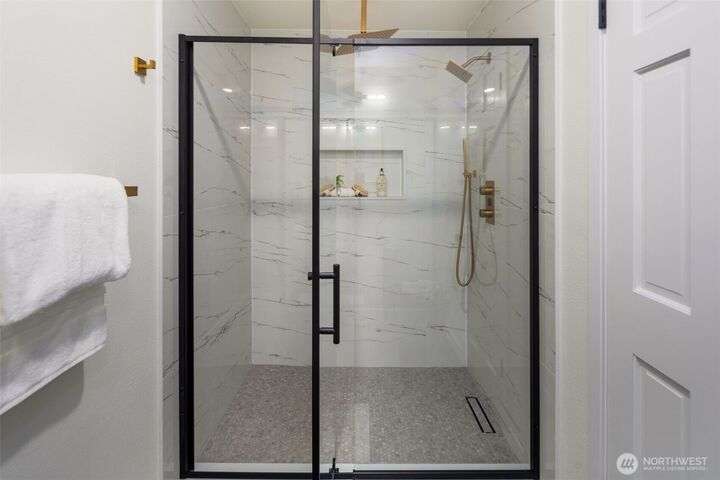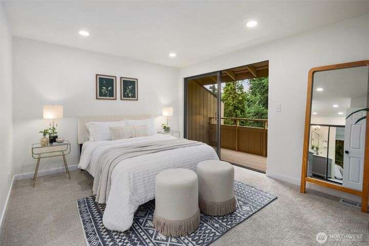 A rare opportunity to live in remodeled luxury on the perfectly manicured 9th fairway of Inglewood Golf Course. This 2025 remodel features new kitchen & baths w/ quartz counters, designer tile & stunning fixtures. Every surface has been touched including new flooring, carpet, paint & LED lighting. In the living room you'll find cathedral ceilings w/ a cozy gas fireplace. The expansive primary suite includes a double sink vanity & luxurious shower. Enjoy indoor/outdoor living w/ golf course views from the back deck or 2nd floor balcony. Or take your coffee in the secluded courtyard patio large enough for an outdoor dining set. Attached extra-large 2 car garage. Easy access to the Kenmore Boat Launch, Burke-Gilman Trail & Northshore Schools.