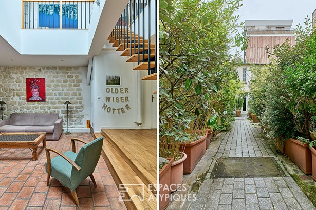 Located just steps from the Bassin de la Villette, nestled in a discreet, flower-filled courtyard, this 141 m2 (1600 sq ft) house (157 m2 floor area) offers a calm, bright, and welcoming living environment.