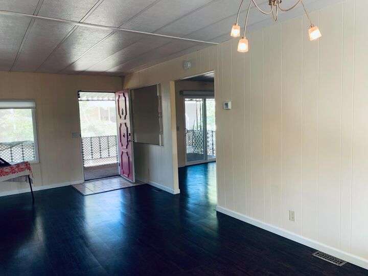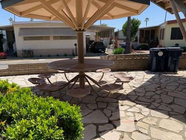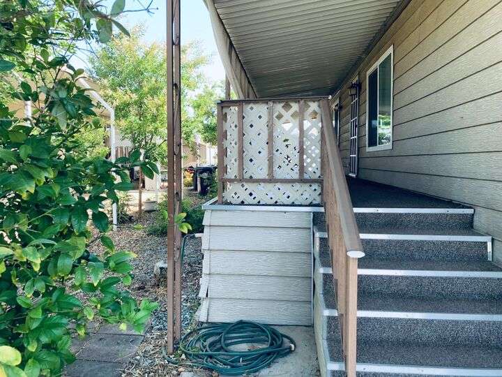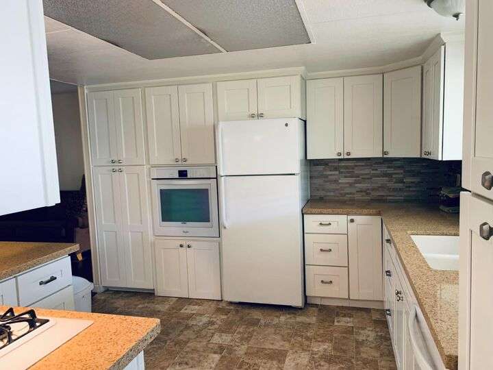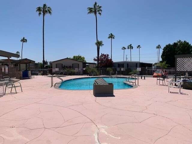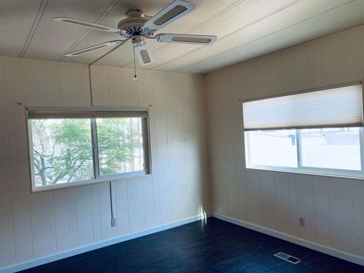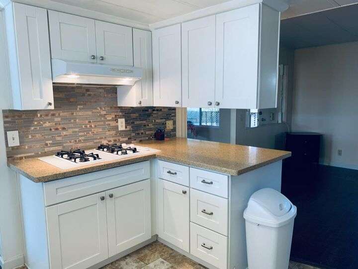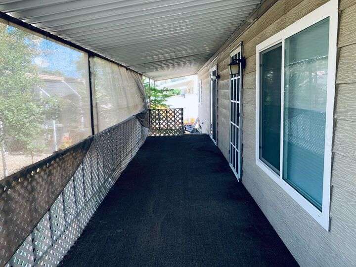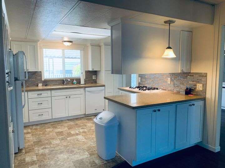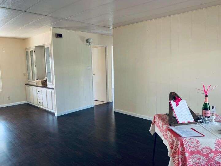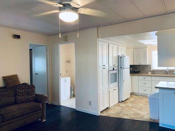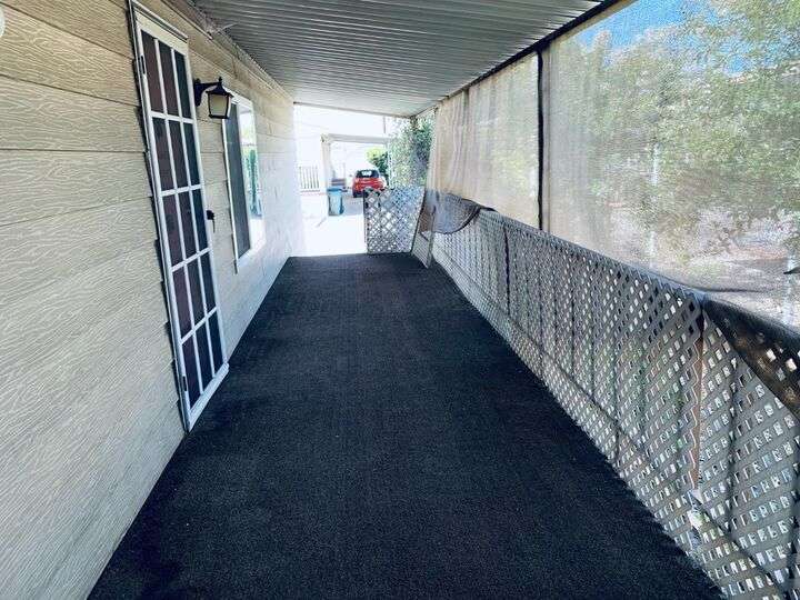 Three Bedrooms, Den and Updated all with a covered porch! Electric water heater, electric oven, gas cooktop, Corian & tile counters with newer cabinets all through the kitchen. Hunter Douglas Blinds, laminate flooring, painted paneling, newer roof. Covered side porch. Living room, formal dining area with built-in hutch, dishwasher, refrigerator, den/craft room off kitchen with sliding glass door to porch. Main bedroom has soaking tub and shower. Second bathroom has tub and shower. Shed in the carport. Bendix Model 1979, 24'x 60', 1440sf. Clubhouse has pool, spa and billiards! Gated with security. 55+ Active Senior Park named Golden Palms Estates.