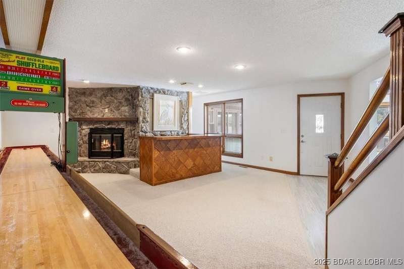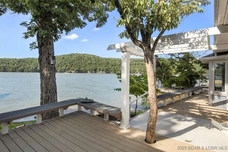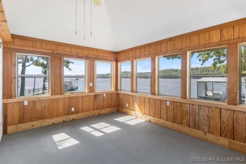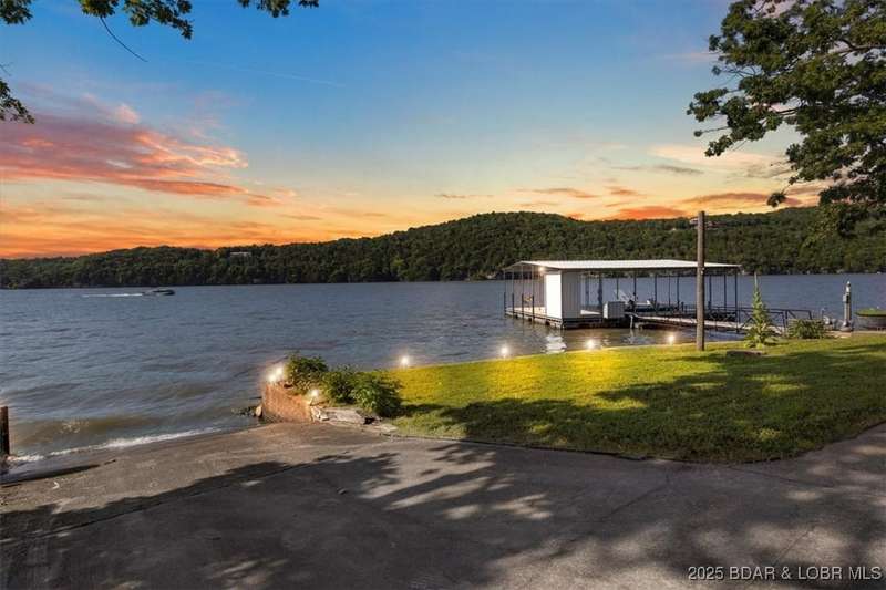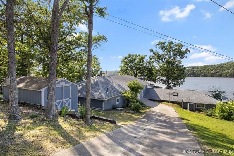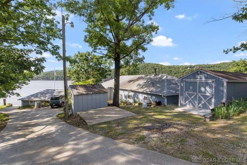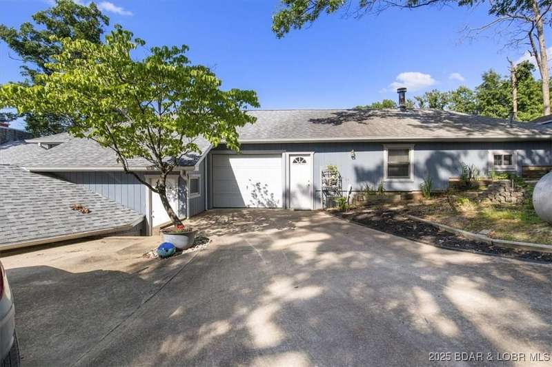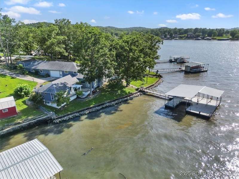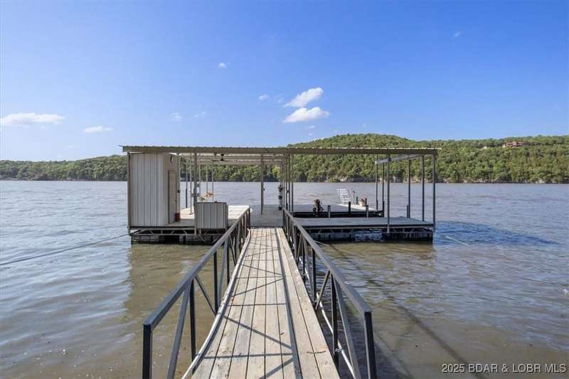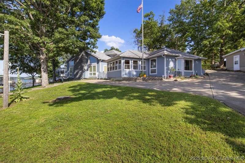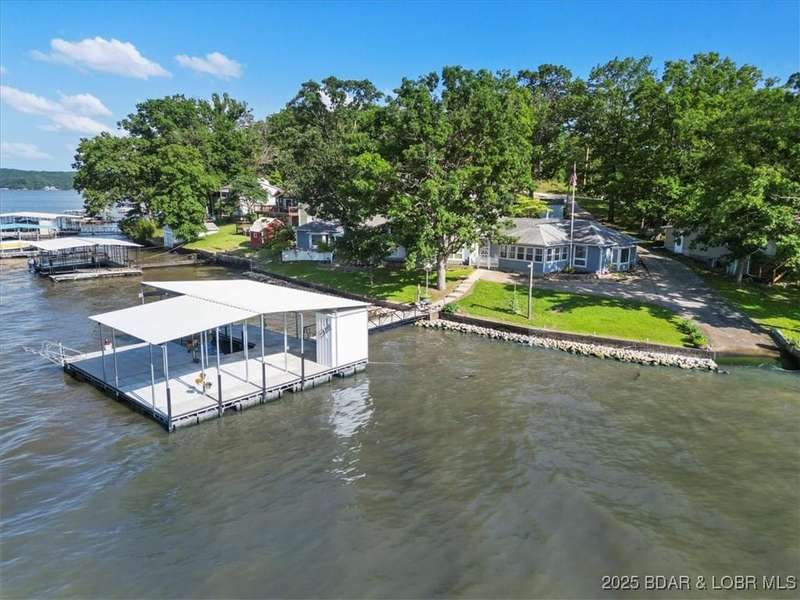 Looking for a lakefront home full of character with 175 ft of shoreline, a PRIVATE boat ramp, Million Dollar View, SUNROOM, ZERO steps to the water, FLAT yard, NO HOA, a MOTHER-IN-LAW Suite and MORE! Sitting on a half acre lot, this ranch home features a great room with cathedral ceilings and beautiful wood burning fireplace, kitchen with tons of cabinetry and storm shelter/pantry, plus a wet bar area and full size shuffle board next to the second fireplace! The primary bedroom has a custom ceiling, walk in closet, and spacious bathroom. And, also main level, there are two bedrooms (one has a full bath), laundry, and powder room. The loft, perfect for an office space or bedroom, has a half bath (room to add a shower). The guest house is studio style with a kitchenette, full bathroom and has tons of potential! Head down to the dock with a huge swim platform that is partly covered for shade and half open to sun tan. Dock electric is to code! Located on the 45 Mile Marker Lake of the Ozarks, it is near numerous lakefront restaurants, has fiber internet, and excellent area for swimming, water sports, fishing, and enjoying Lake Life! Great full-time residence, getaway, or investment!!!