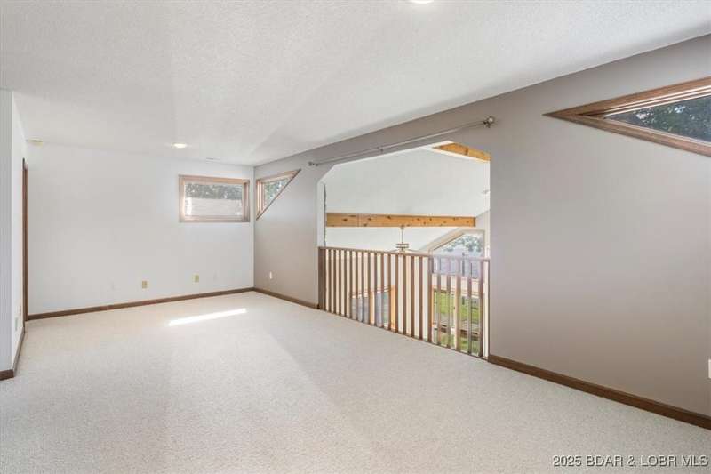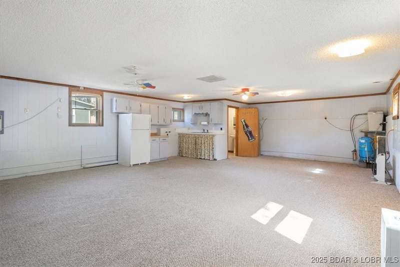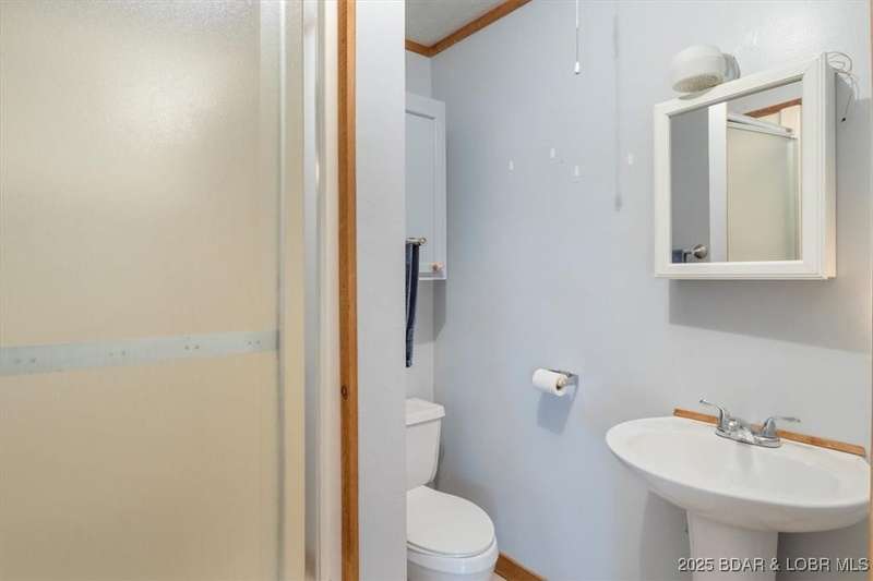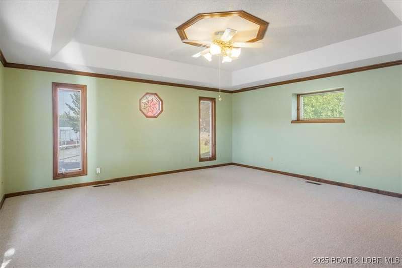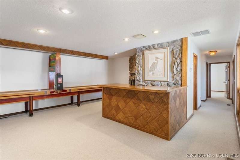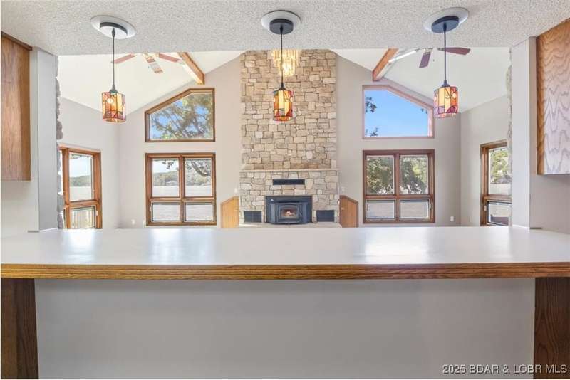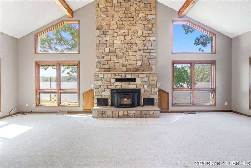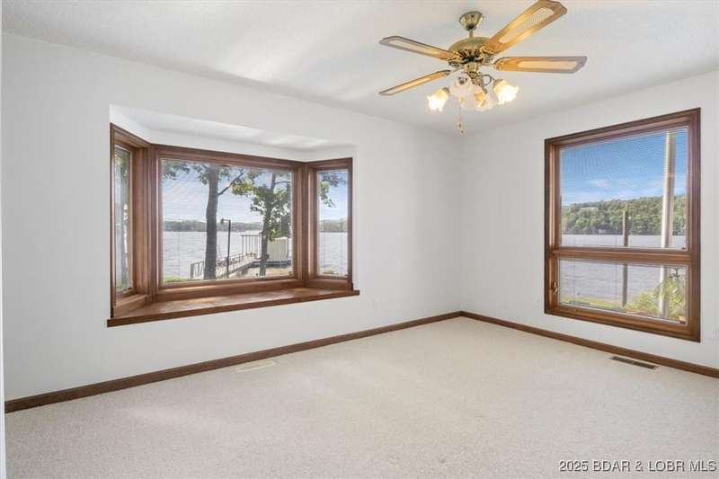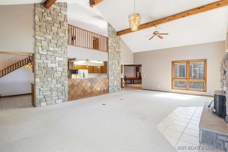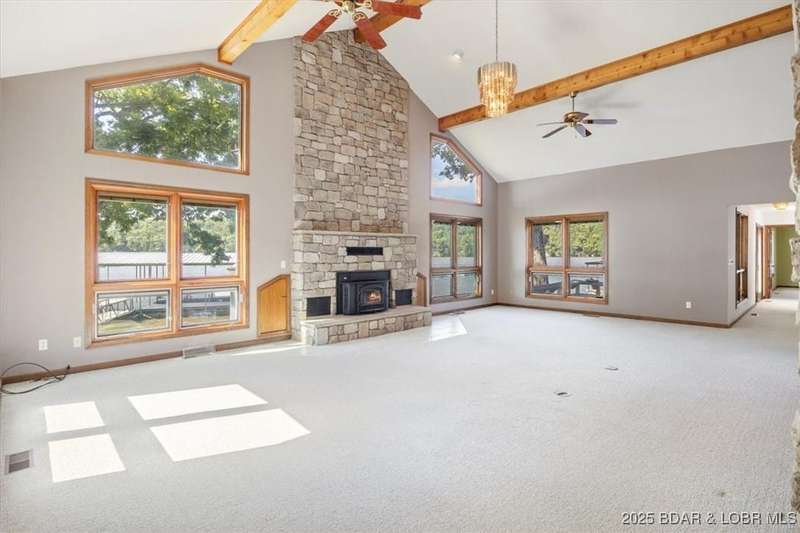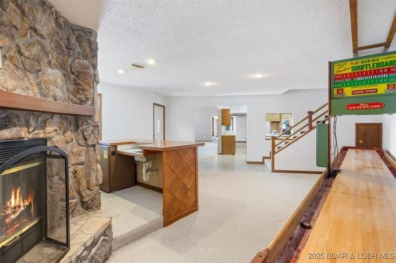 Looking for a lakefront home full of character with 175 ft of shoreline, a PRIVATE boat ramp, Million Dollar View, SUNROOM, ZERO steps to the water, FLAT yard, NO HOA, a MOTHER-IN-LAW Suite and MORE! Sitting on a half acre lot, this ranch home features a great room with cathedral ceilings and beautiful wood burning fireplace, kitchen with tons of cabinetry and storm shelter/pantry, plus a wet bar area and full size shuffle board next to the second fireplace! The primary bedroom has a custom ceiling, walk in closet, and spacious bathroom. And, also main level, there are two bedrooms (one has a full bath), laundry, and powder room. The loft, perfect for an office space or bedroom, has a half bath (room to add a shower). The guest house is studio style with a kitchenette, full bathroom and has tons of potential! Head down to the dock with a huge swim platform that is partly covered for shade and half open to sun tan. Dock electric is to code! Located on the 45 Mile Marker Lake of the Ozarks, it is near numerous lakefront restaurants, has fiber internet, and excellent area for swimming, water sports, fishing, and enjoying Lake Life! Great full-time residence, getaway, or investment!!!