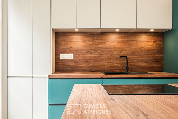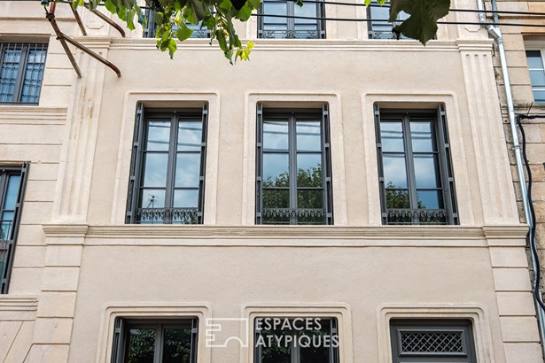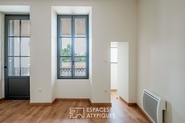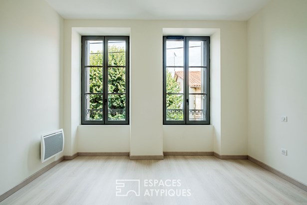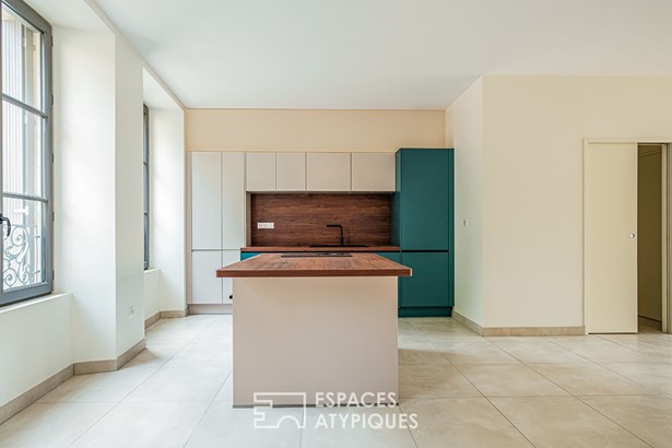 The apparent charm of this unique duplex nevertheless hides its secrets. The 50 m2 living room benefits from its tall rectangular windows and its historic door with graphic ironwork.