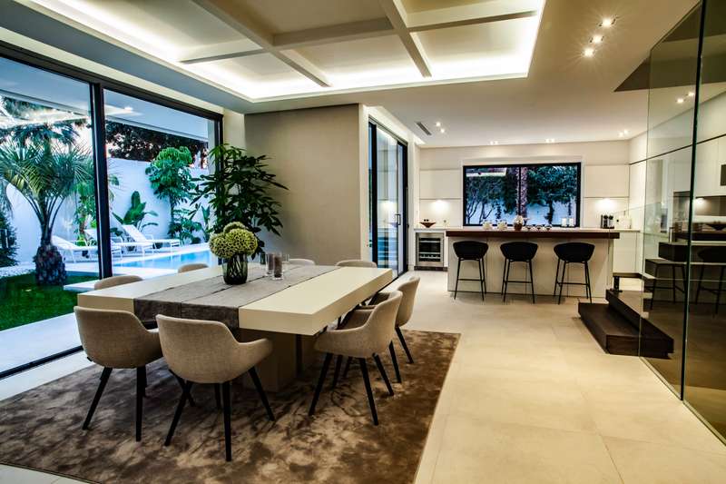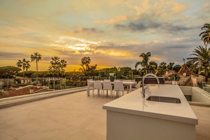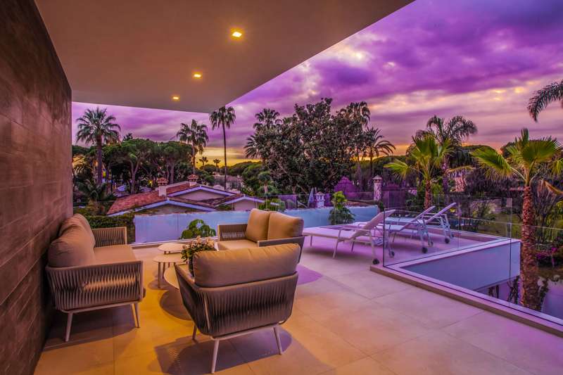 Experience the ultimate in luxury living at Villa Harmonia! This stunning 5-bedroom villa is located on Marbella's prestigious Golden Mile, just moments away from the beach. Step inside and be captivated by the modern and spacious open-plan living/dining area, seamlessly connected to a state-of-the-art kitchen. With multiple access points to the inviting porch, terraces, and private swimming pool, you'll love embracing the indoor-outdoor lifestyle this villa offers. The ground floor also features a lavish en-suite bedroom and a cinema room, perfect for unwinding and enjoying movie nights. On the first floor, you'll discover a haven of tranquility with each bedroom boasting its own en-suite bathroom and private terrace. Savor the breathtaking views and soak up the sun in complete privacy. The real showstopper awaits on the top floor - a spectacular solarium terrace. Here, you can relax in the comfortable lounge area, take a dip in the jacuzzi, and cook up a storm with the fully eq