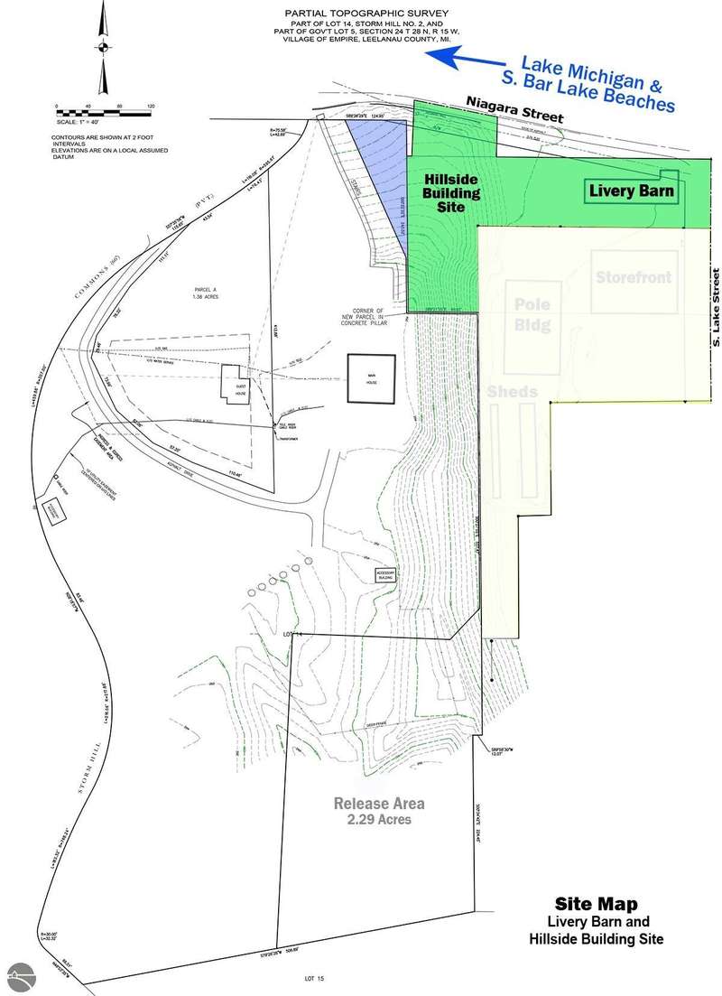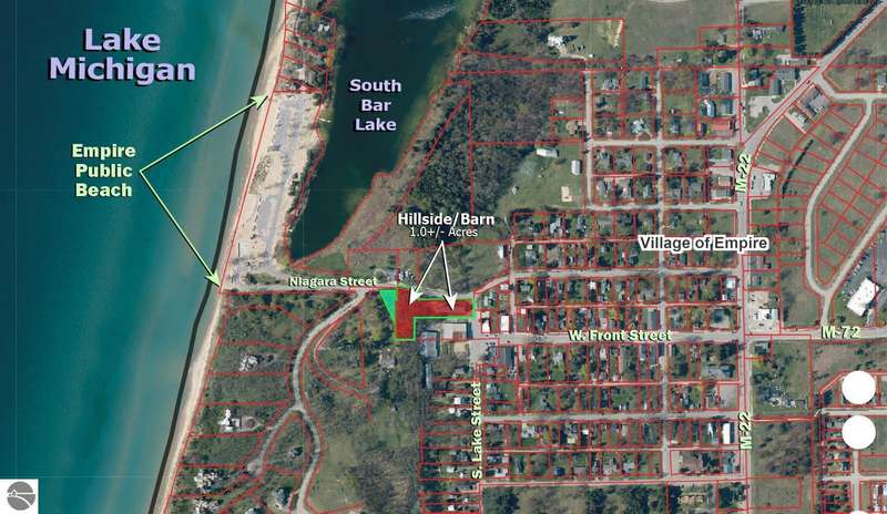 Residential Building Site located downtown in the quaint Village Of Empire. Property includes a Historic, 2 Level, 7,400+ square foot Livery Barn built in 1900. This wooded building site offers views of both Lake Michigan and South Bar Lake; is within close walking distance of Lake Michigan beach access; and has access to the following utilities: Natural Gas; Municipal water; and Spectrum high speed Internet, TV and telephone. Additional acreage is available at 11738 S. Lake Street (MLS # 1912604). View Preservation (& Creation) corridors in place, and additional Septic Release Area is available. Listing includes 2 Parcels, Click "Associated Documents" for both Tax ID #'s and Legal Descriptions. Listing data and information, including year built, measurements, Building square footage total, Zoning/Building details, Tax ID#'s, and supplemental Documents have been obtained from third party sources and /or the Seller; all data and information is deemed reliable but cannot be guaranteed for accuracy; independent verification should be made by Purchaser and Purchaser's Agent prior to Closing