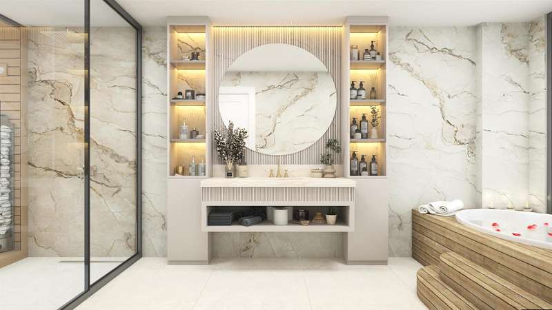 Each villa has air conditioning in all rooms, water heater, kitchen cabinets, granite kitchen countertops, bathroom cabinets, granite bathroom countertops, American style interior doors, steel entrance door, porcelain granite ceramic floor tiles, decorative ceiling covering in all rooms, spot lights in the living room and central satellite system.