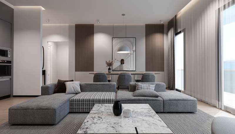 Apartments for sale in Bodrum are located just 20 meters from the sea, close to luxurious hotels and restaurants, 1 km from Torba Bus Station, 8 km (a 10-minute drive) from the center of Bodrum and Bodrum Marina, 20 km from Yalikavak Marina, and 32 km from Bodrum-Milas Airport.